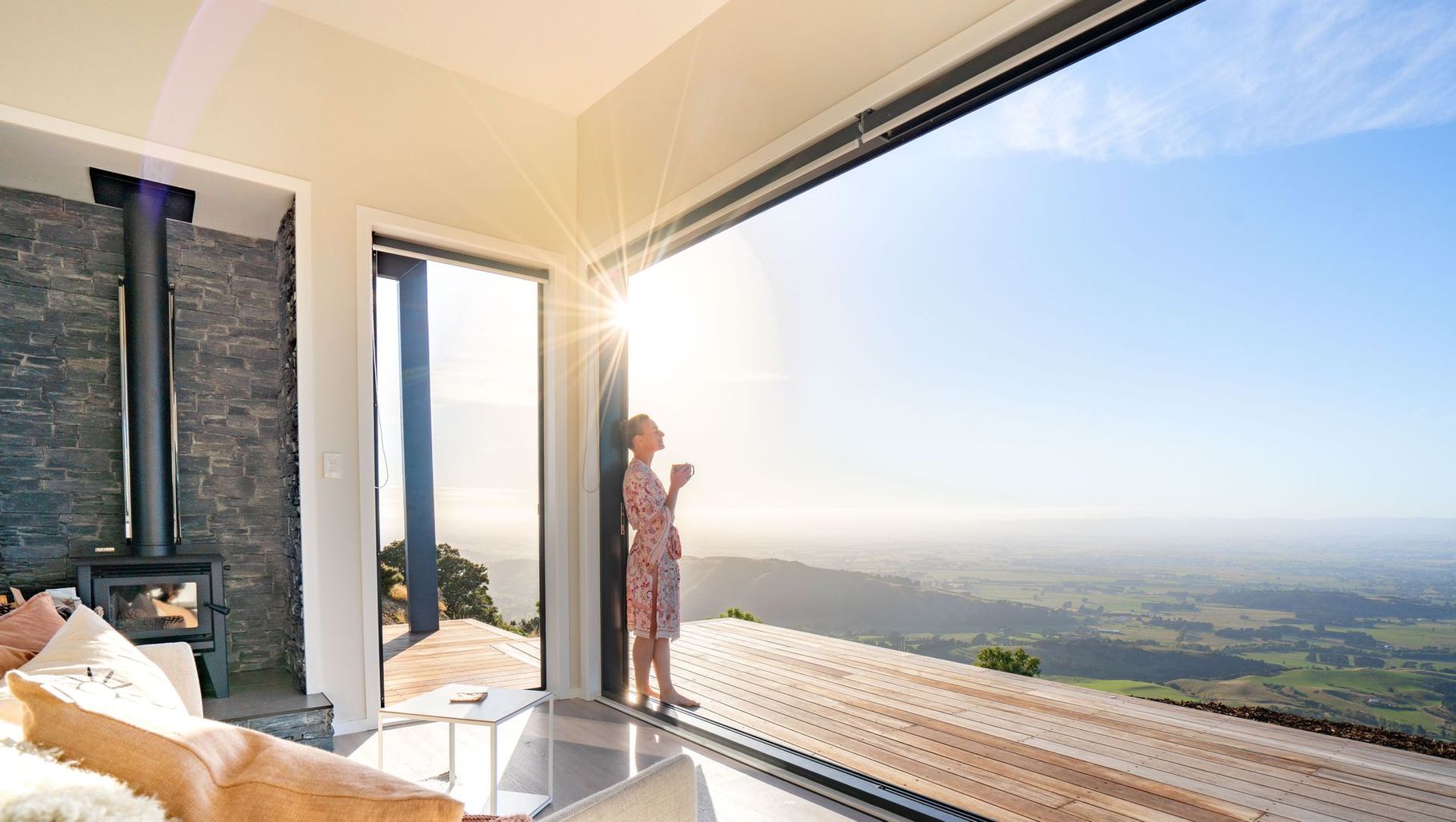 ArchiPro Project Summary - Moonlight Peak: A luxurious retreat in Wairarapa, featuring serene hillside views and exquisite tiling by Inspire Living in the bathrooms and a stylish shist look tile behind the fireplace.