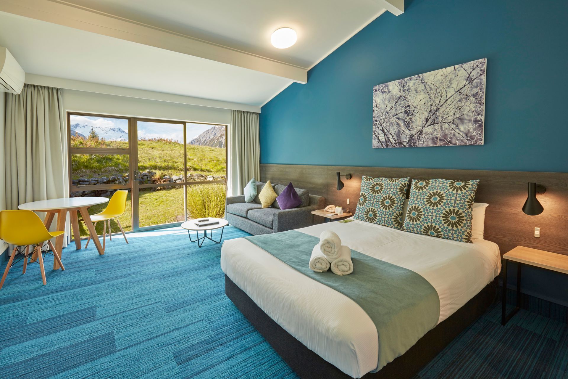 ArchiPro Project Summary - Complete refresh of 32 motel rooms at Mount Cook, featuring a vibrant design inspired by the natural environment, with carefully selected furniture, fittings, and artwork to create a contemporary and inviting atmosphere.