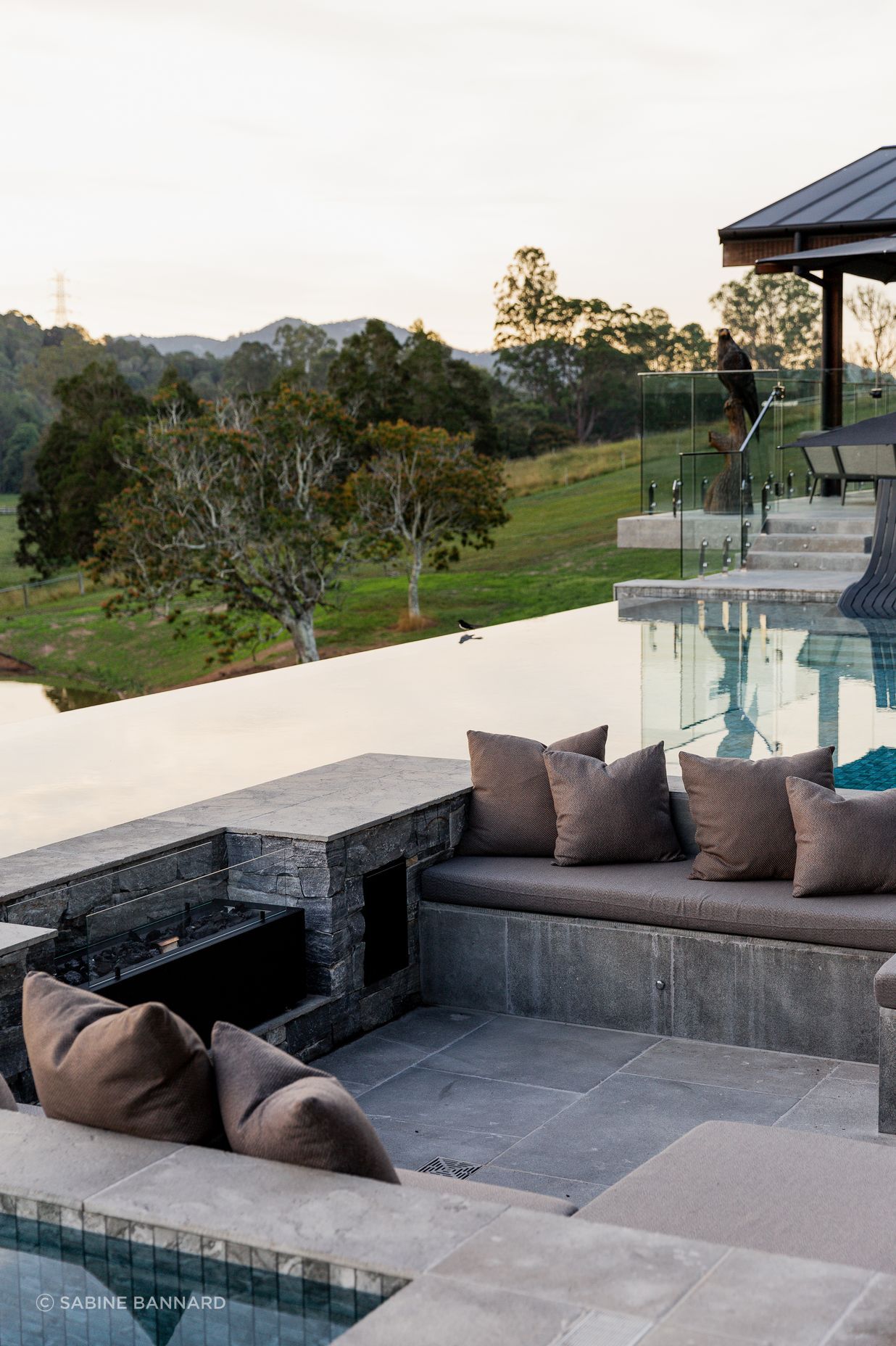 ArchiPro Project Summary - Luxurious landscaping featuring a resort-style infinity pool, sunken lounge, native plantings, and an exquisite outdoor kitchen, seamlessly integrating natural elements with sophisticated design for ultimate relaxation and enjoyment.