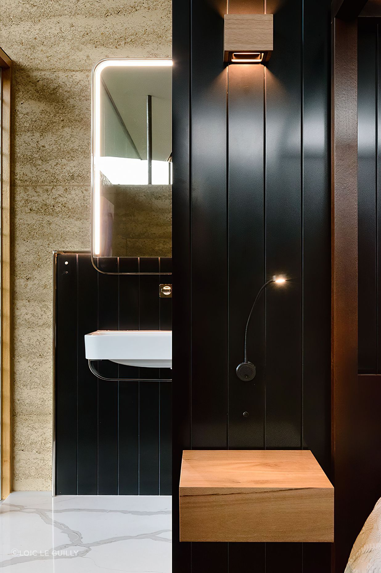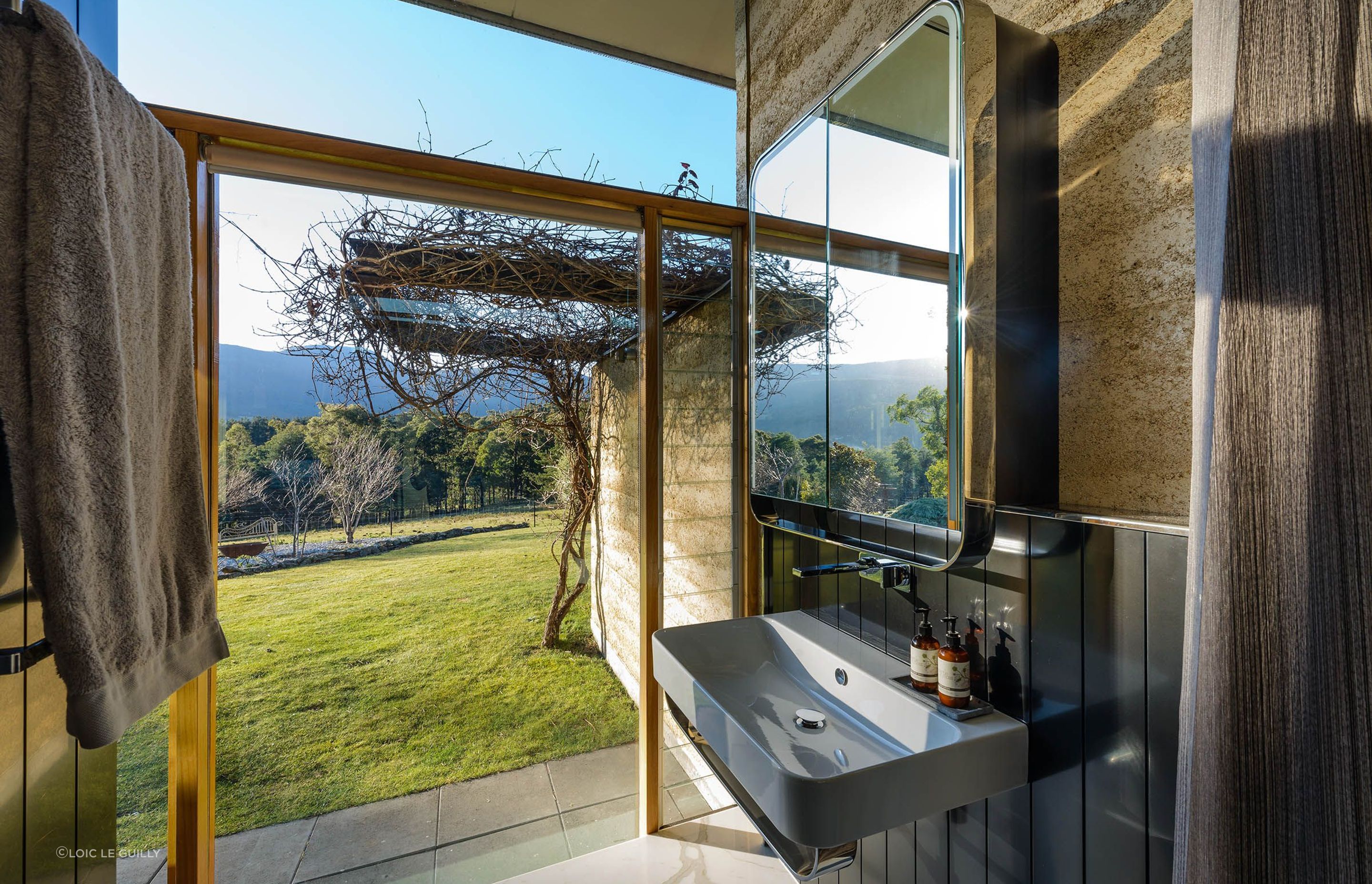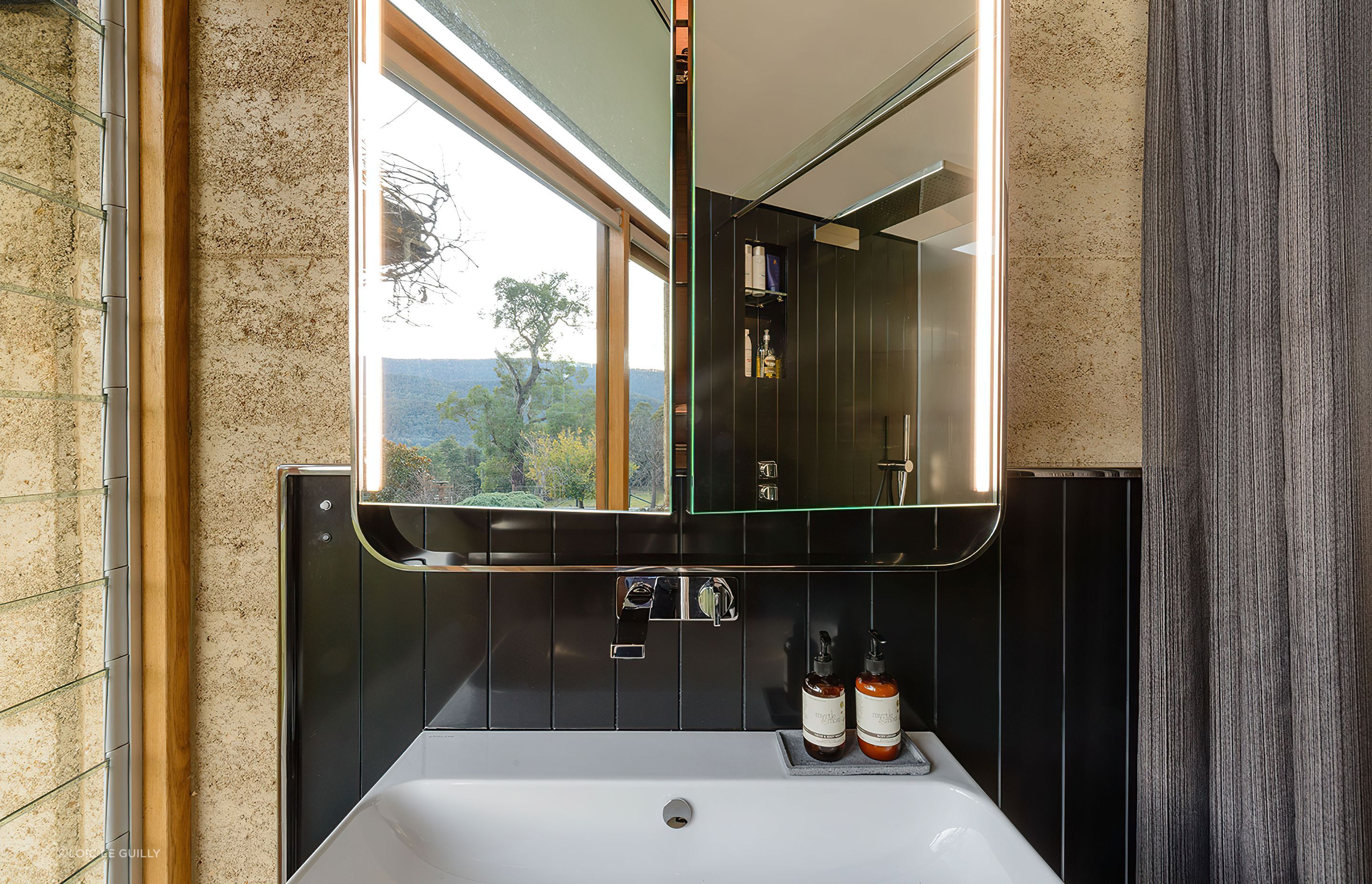 ArchiPro Project Summary - A stunning modern rammed earth home in the tranquil Huon Valley, featuring an exquisite European-inspired ensuite with handcrafted materials, luxurious finishes, and innovative design elements that exemplify excellence in contemporary architecture.