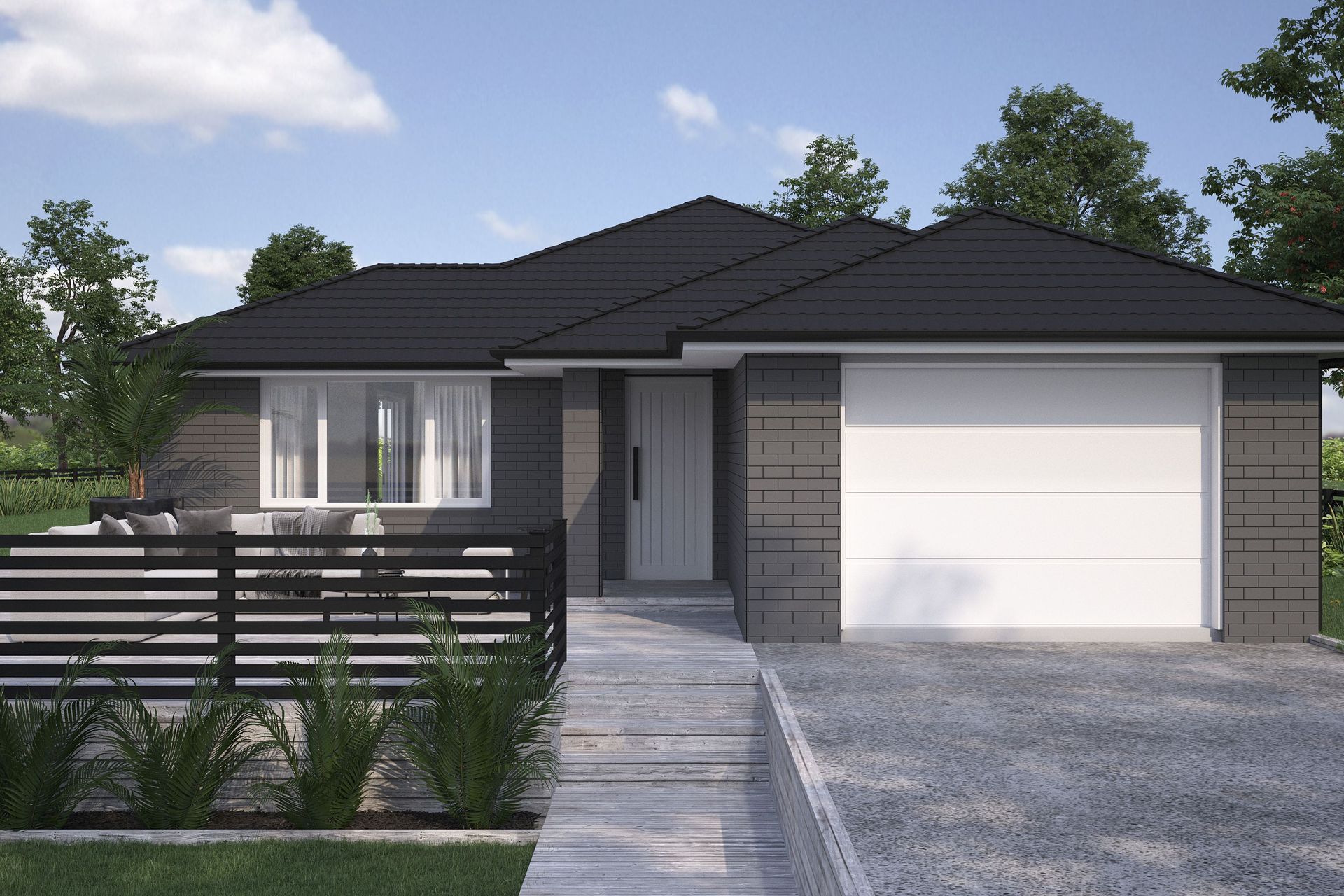 ArchiPro Project Summary - Showcasing a versatile house plan with three distinct cladding and roof styles, each set in a unique environment.