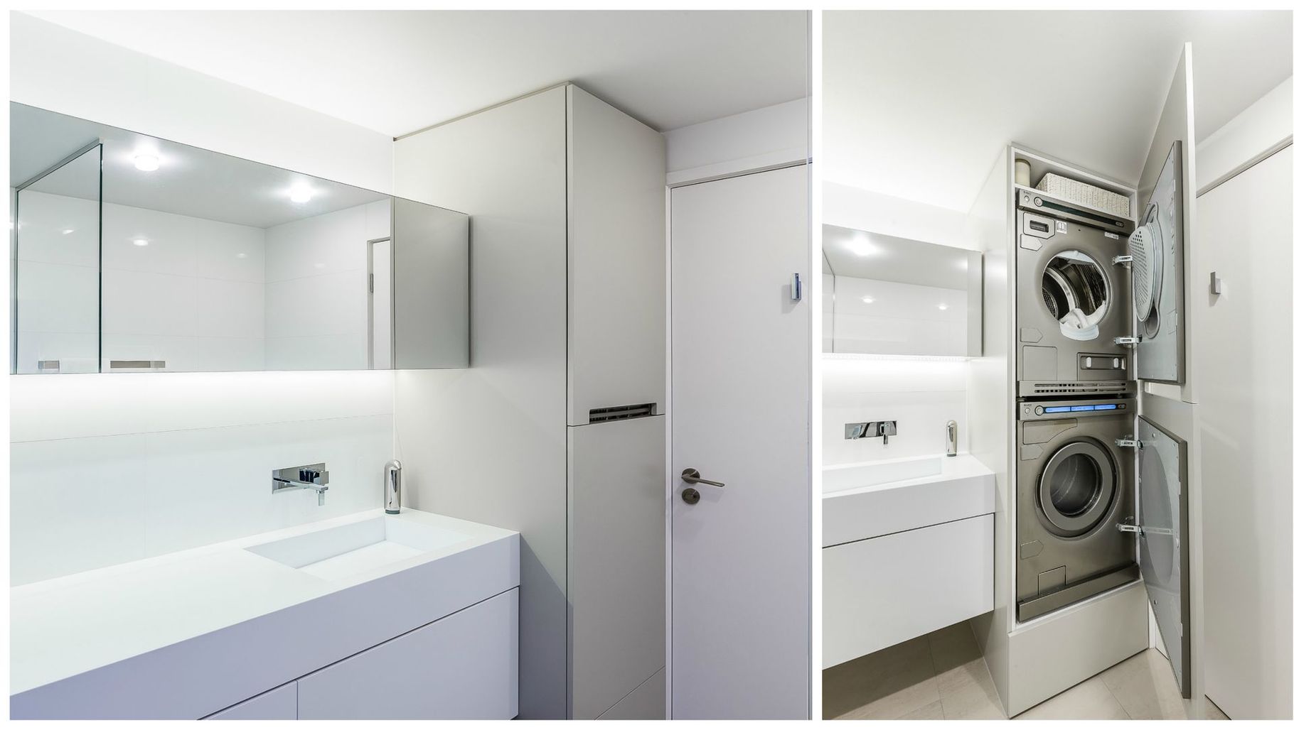 ArchiPro Project Summary - A stylish and functional Mt Eden bathroom/laundry featuring a custom Corian vanity, innovative storage solutions, and switchable glass French doors that enhance space and connectivity to the outdoor spa area.