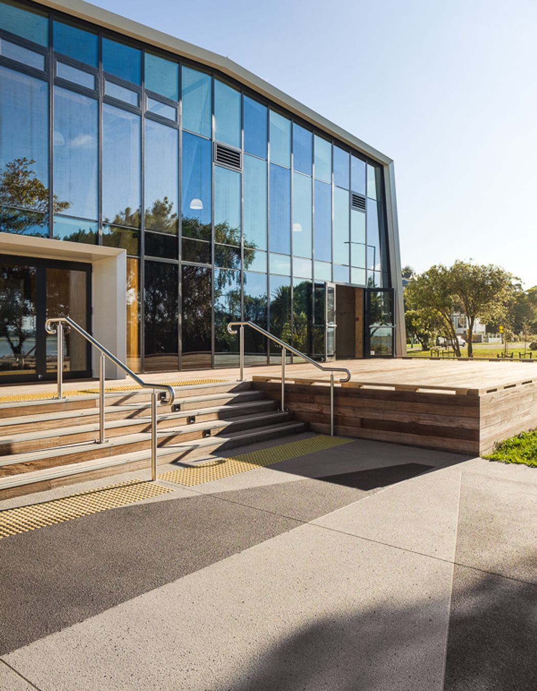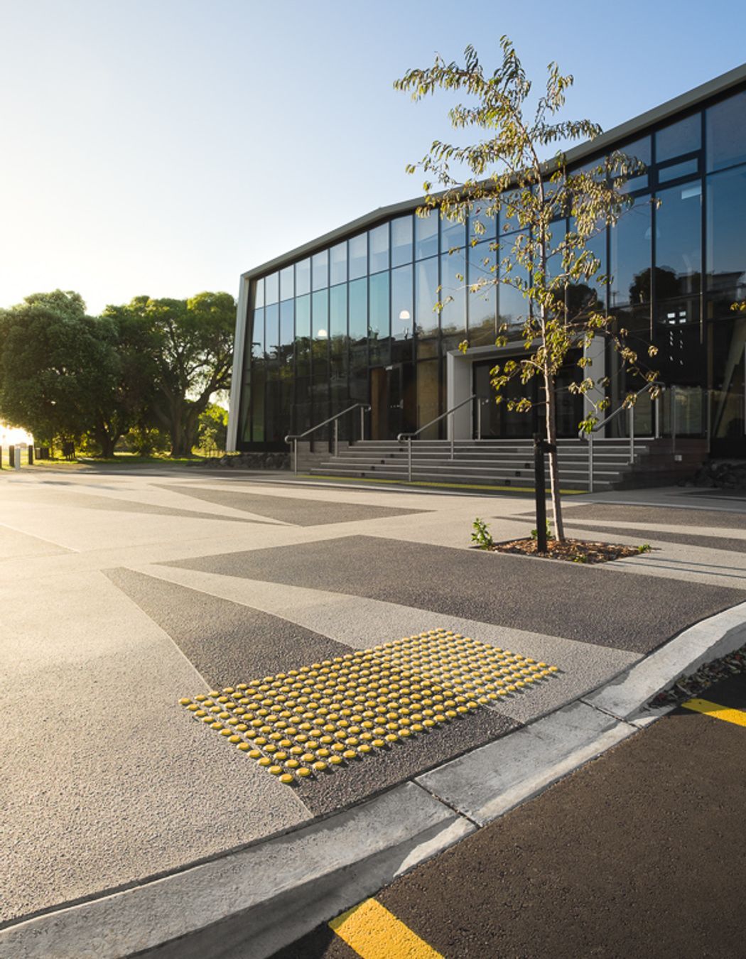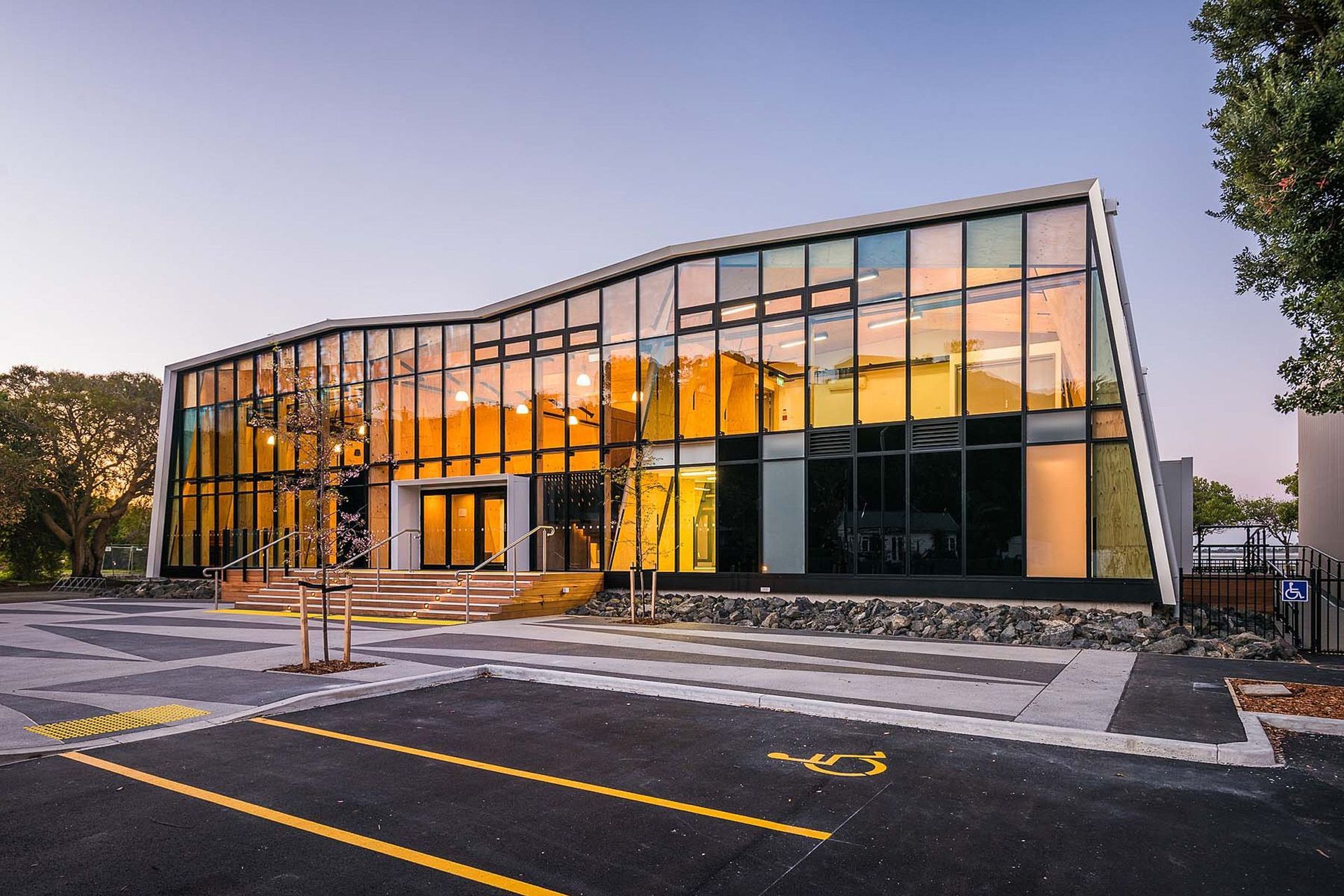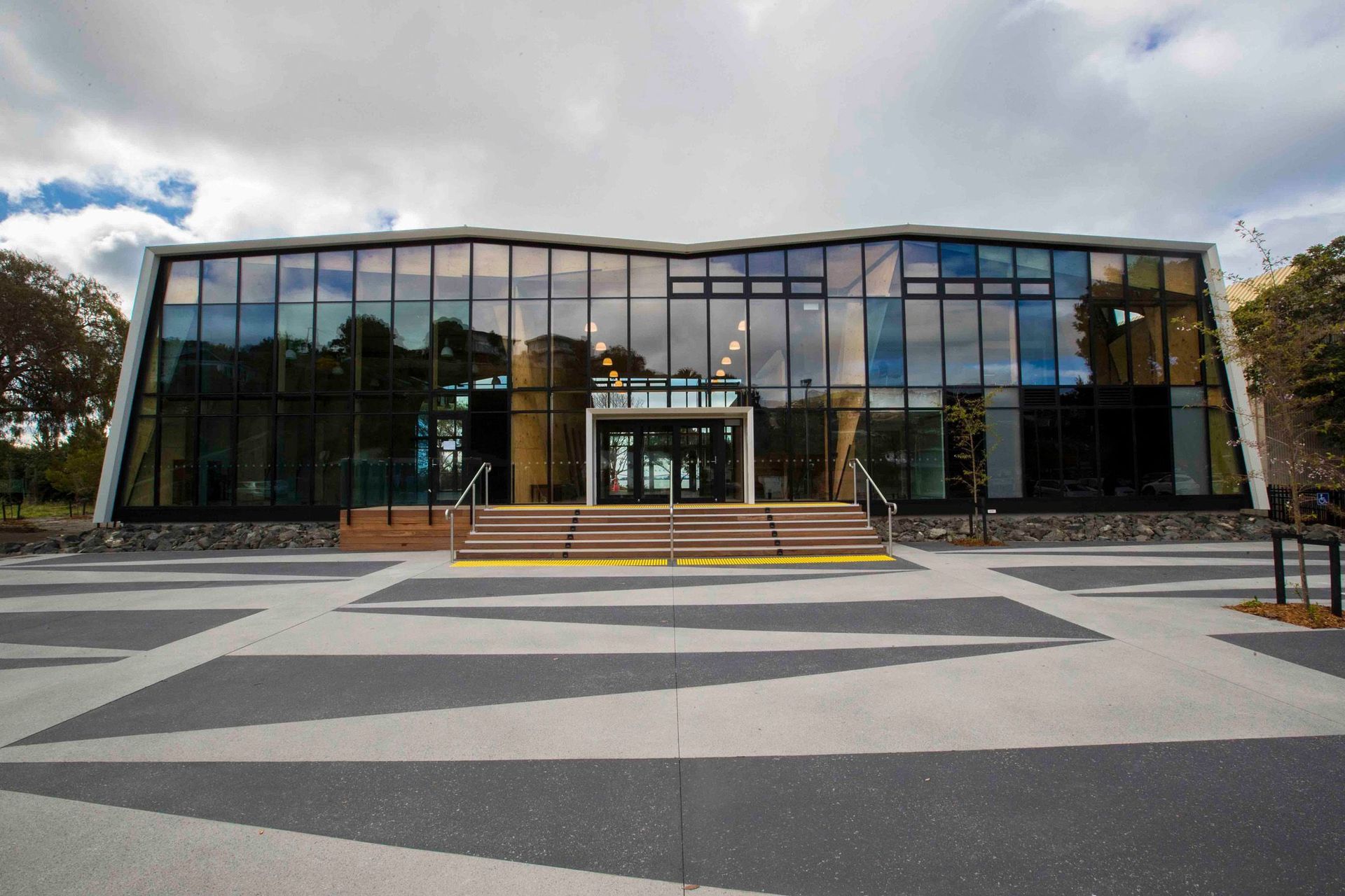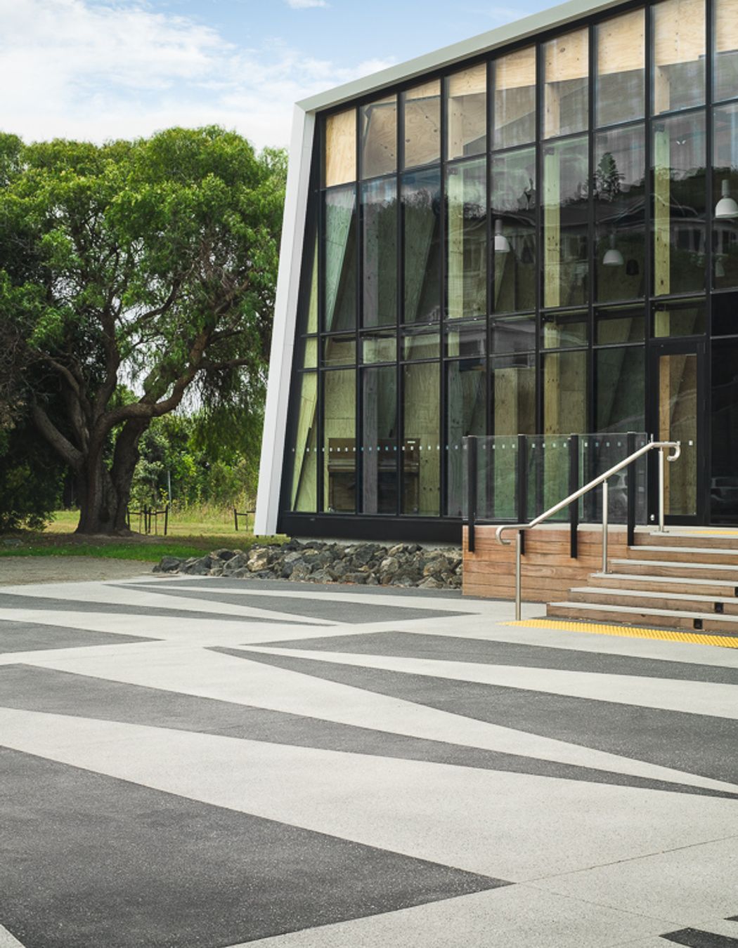 ArchiPro Project Summary - A community centre landscape project featuring flood protection, versatile outdoor spaces for events, and native plantings, harmoniously integrating with the local environment and cultural heritage.