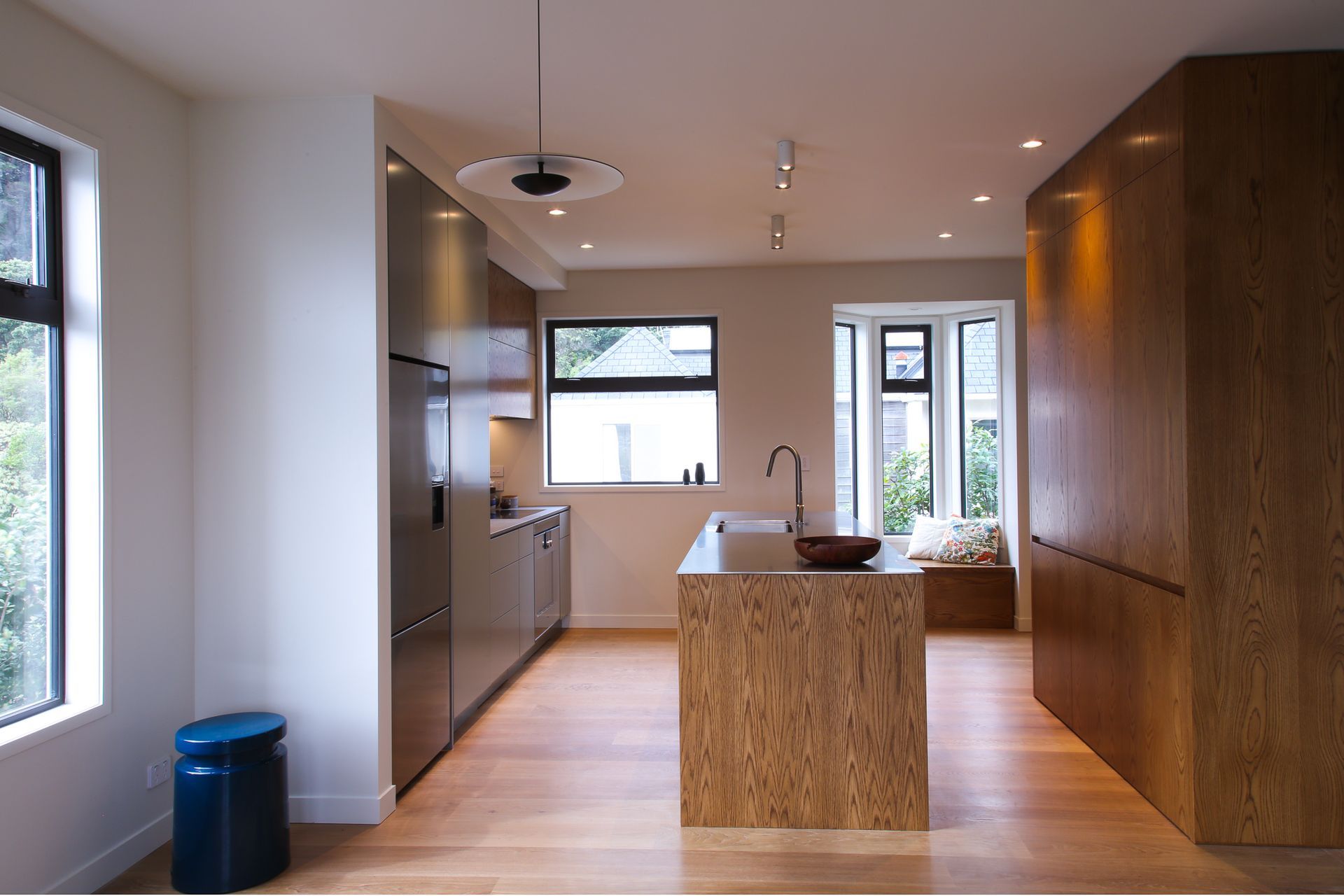 ArchiPro Project Summary - A modern kitchen design that maximizes space in a compact 1980s townhouse, featuring warm timbers, subtle colors, and a sleek stainless steel island bench, created in collaboration with Amanda Smith Design.