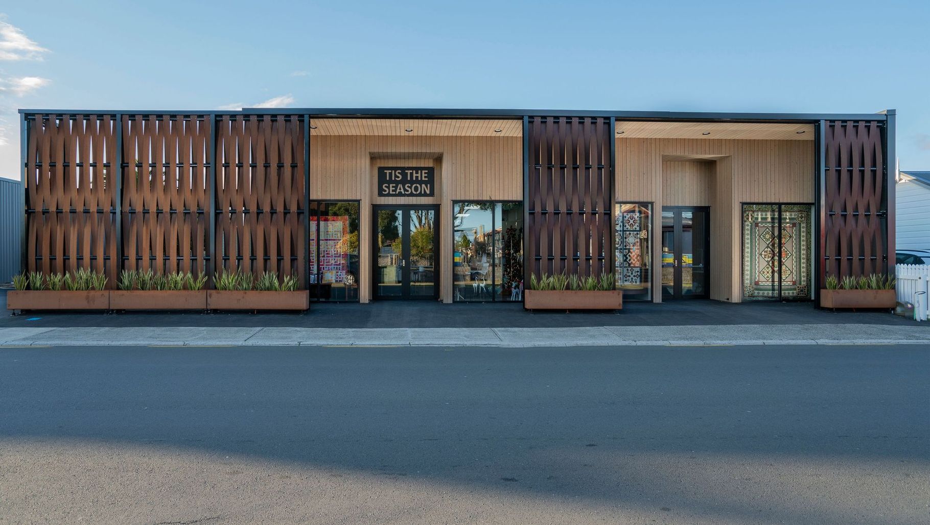 ArchiPro Project Summary - Industrial-style Murdoch Shops in Whitianga, completed in 2020, features an intricate screen facade and serves as a vibrant hub for commercial and retail activities, exemplifying the craftsmanship and commitment of the Cassa Homes team.