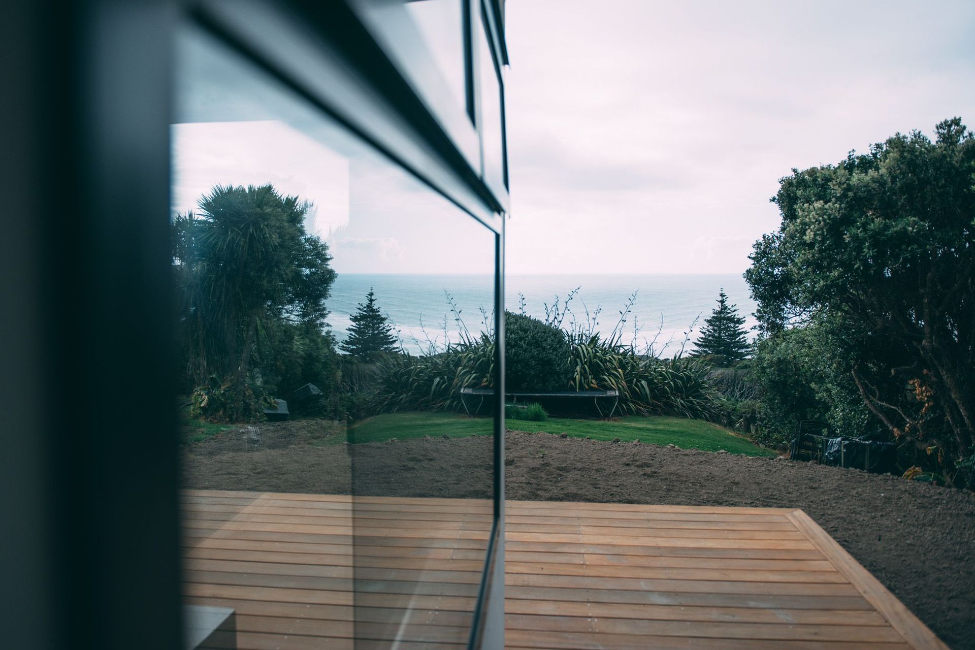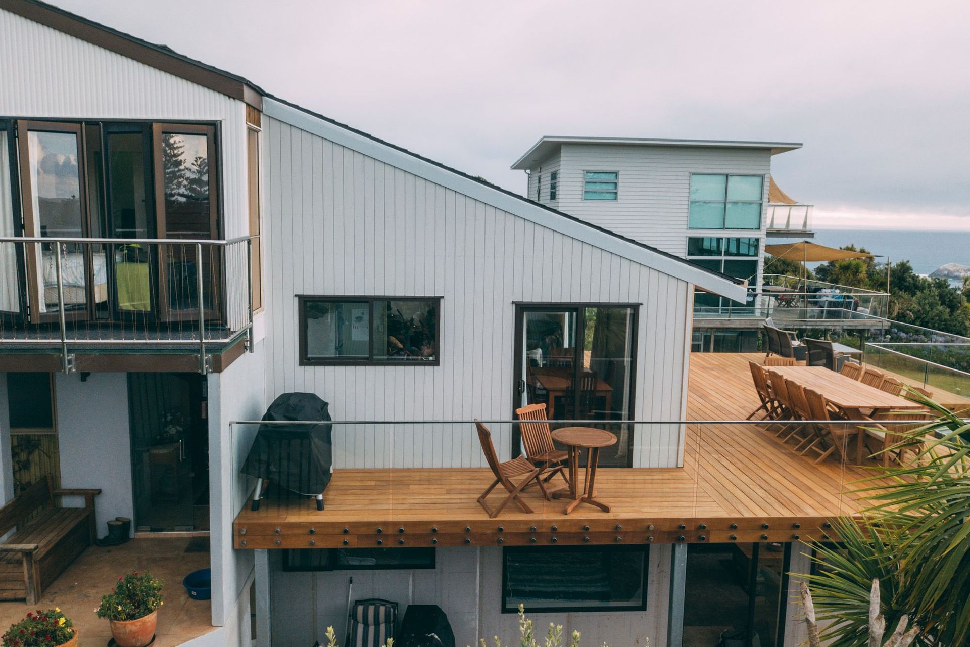 ArchiPro Project Summary - Internal renovation and expansion of a coastal home at Muriwai Beach, featuring new joinery, partial recladding, and hardwood decks with glass handrails, along with the addition of a new lounge, bathroom, bedroom, and storage area.