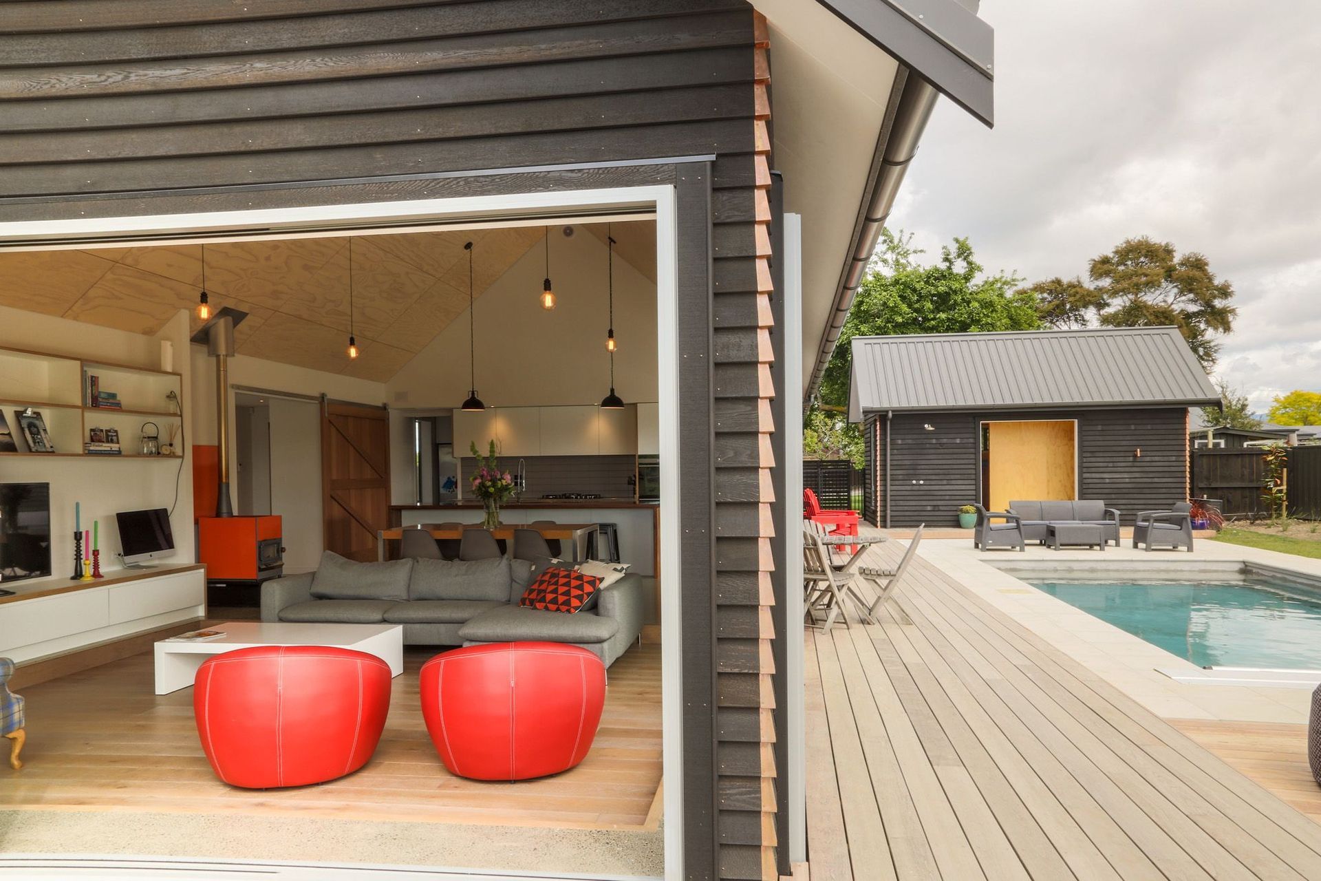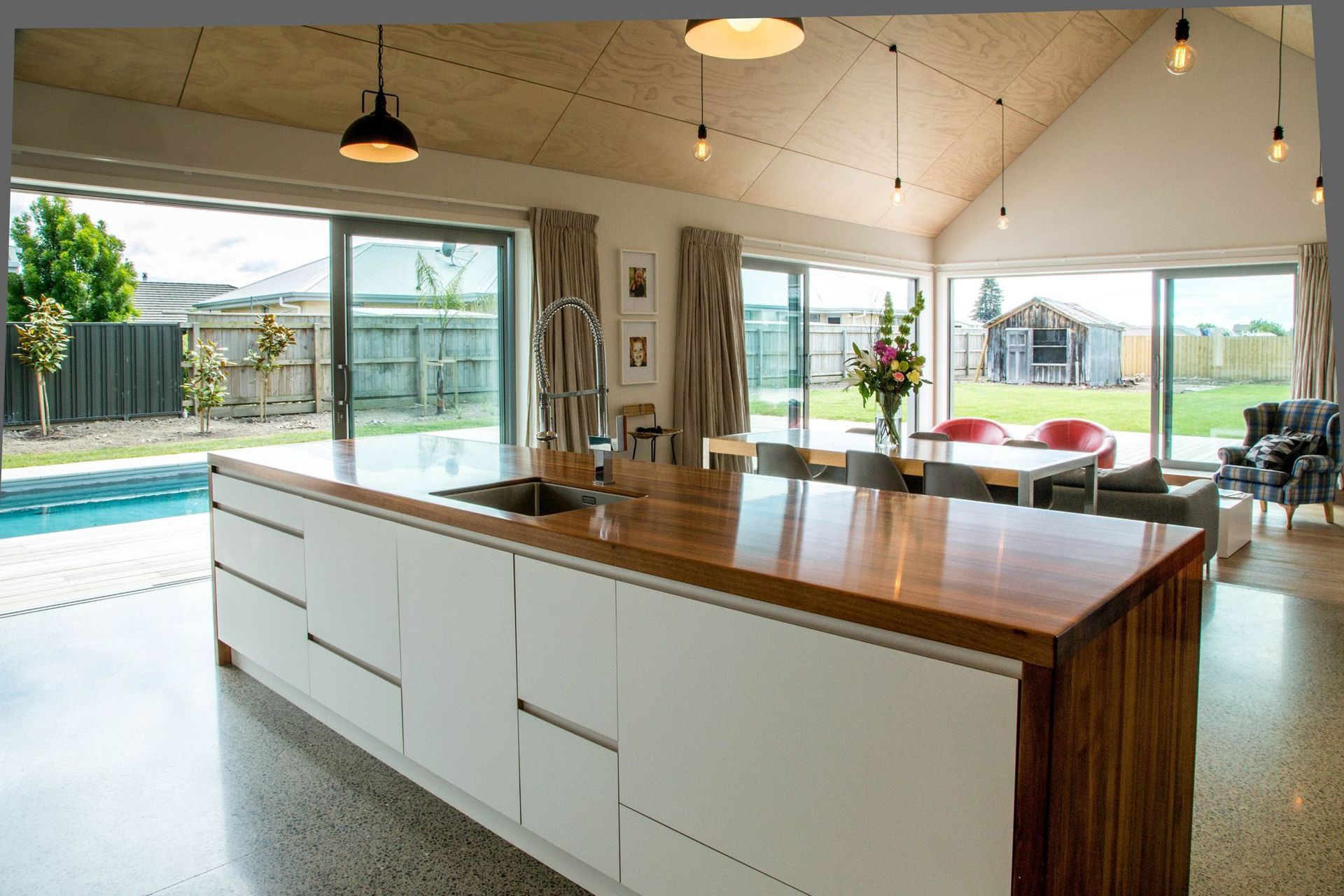 ArchiPro Project Summary - A stunning black cedar clad family home featuring polished concrete floors, a sunken lounge, bespoke chef's kitchen, and extensive outdoor amenities including a pool shed, hard landscaping, and a dedicated garage and man cave.