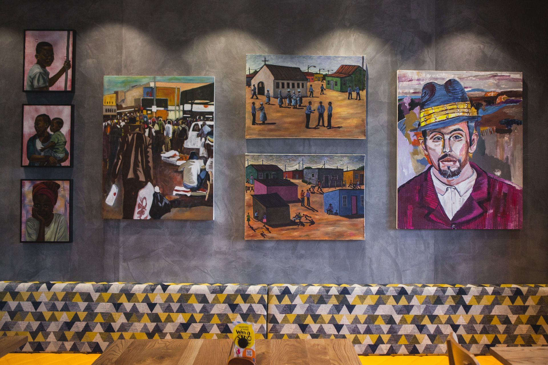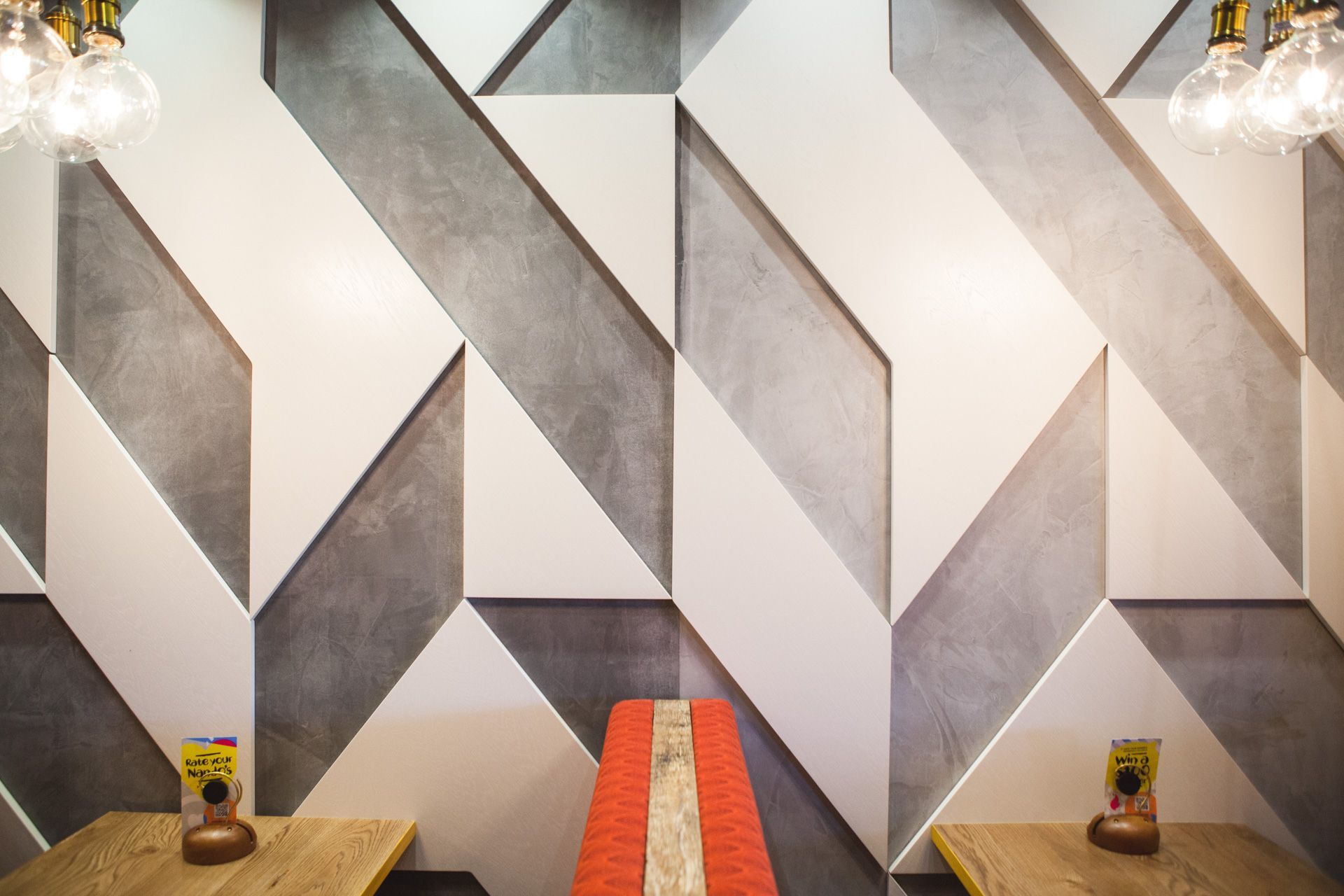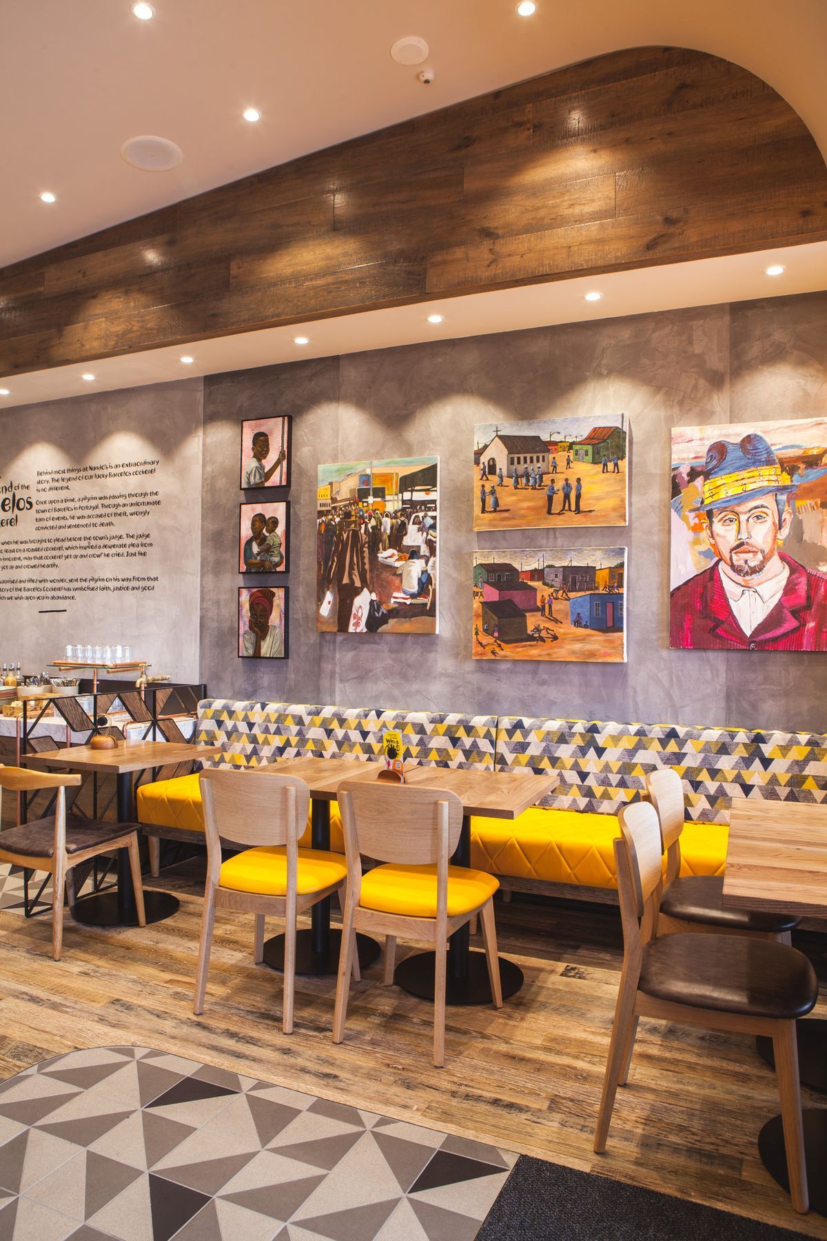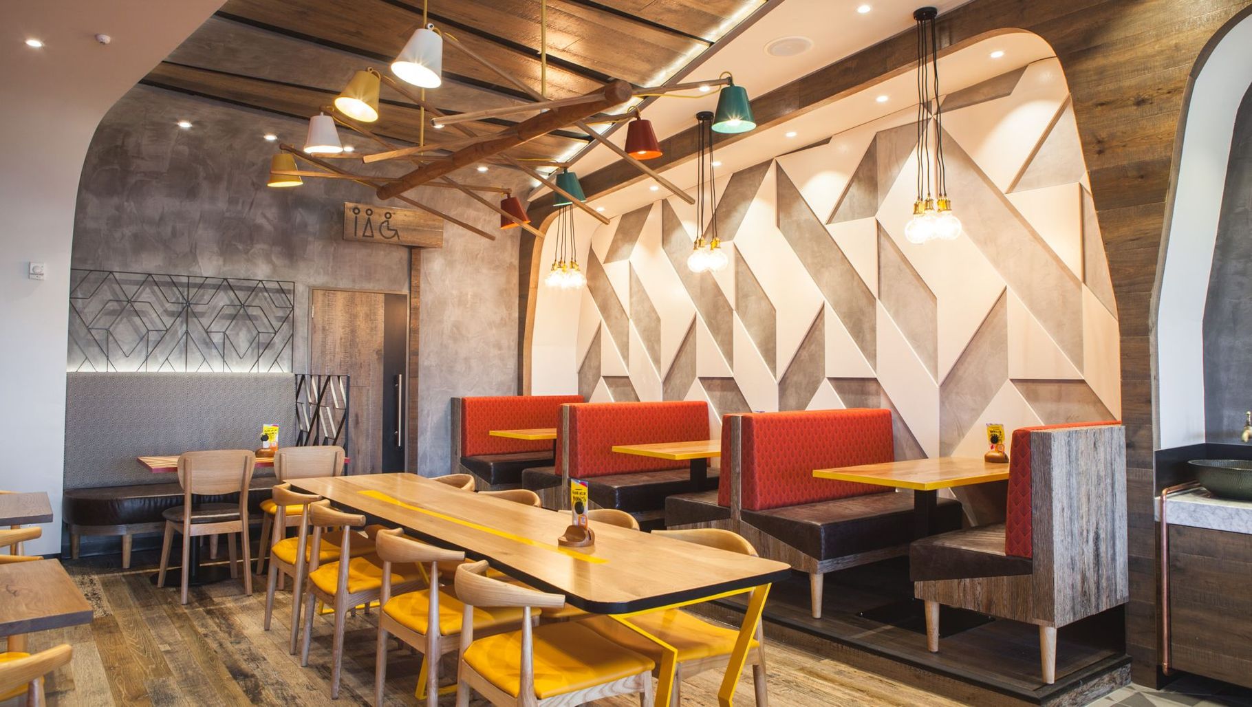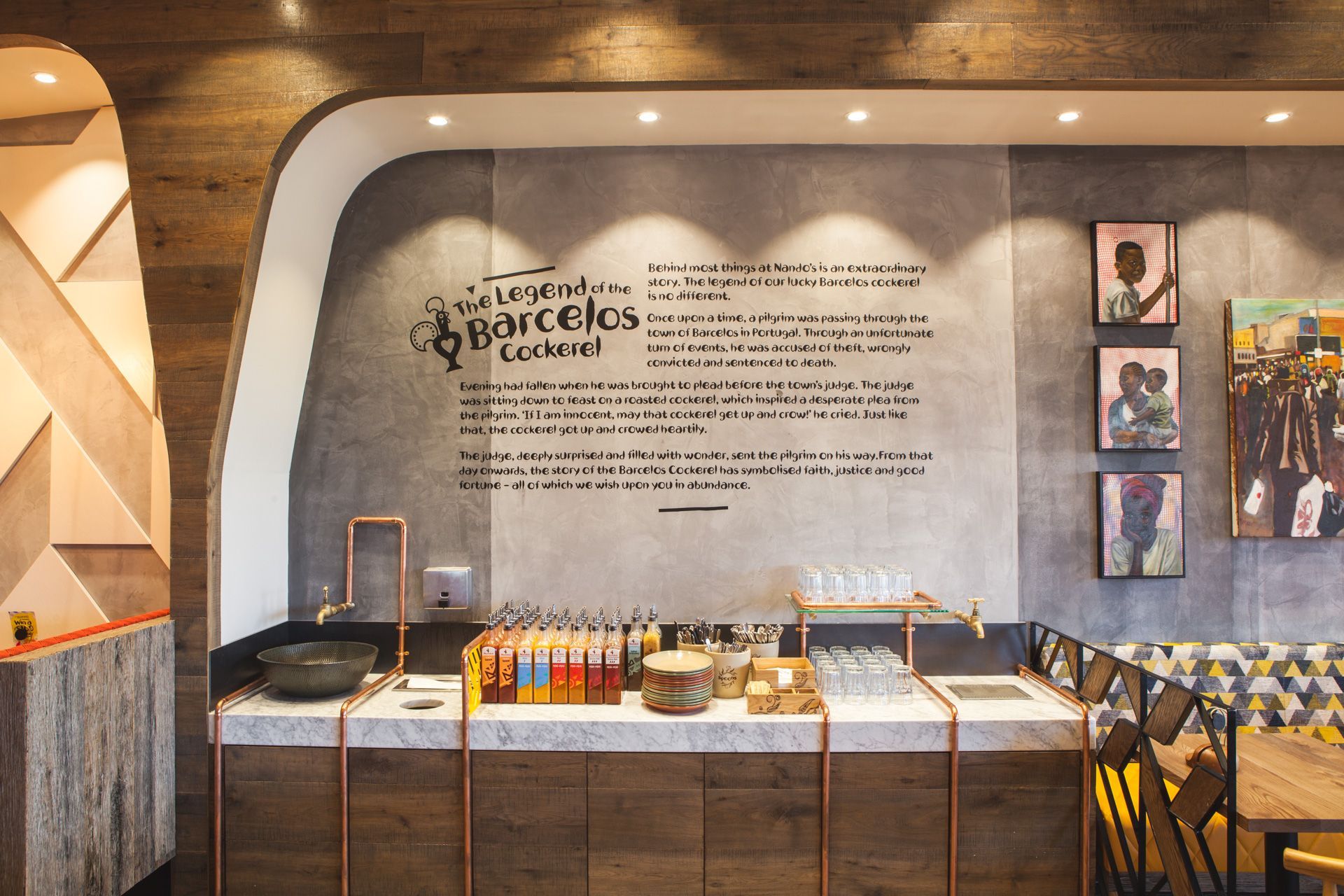 ArchiPro Project Summary - The Nando's Restaurant features a vibrant interior design with wood stain finishes and hardwood elements, creating a warm atmosphere for diners.
