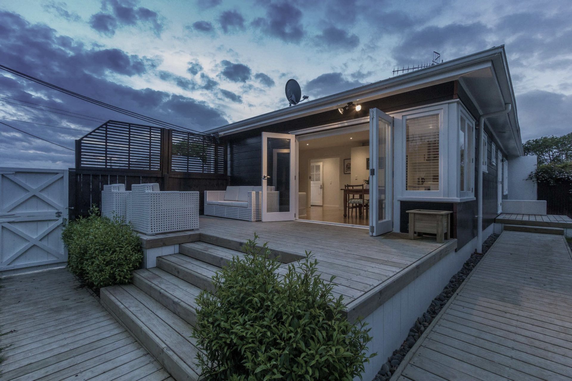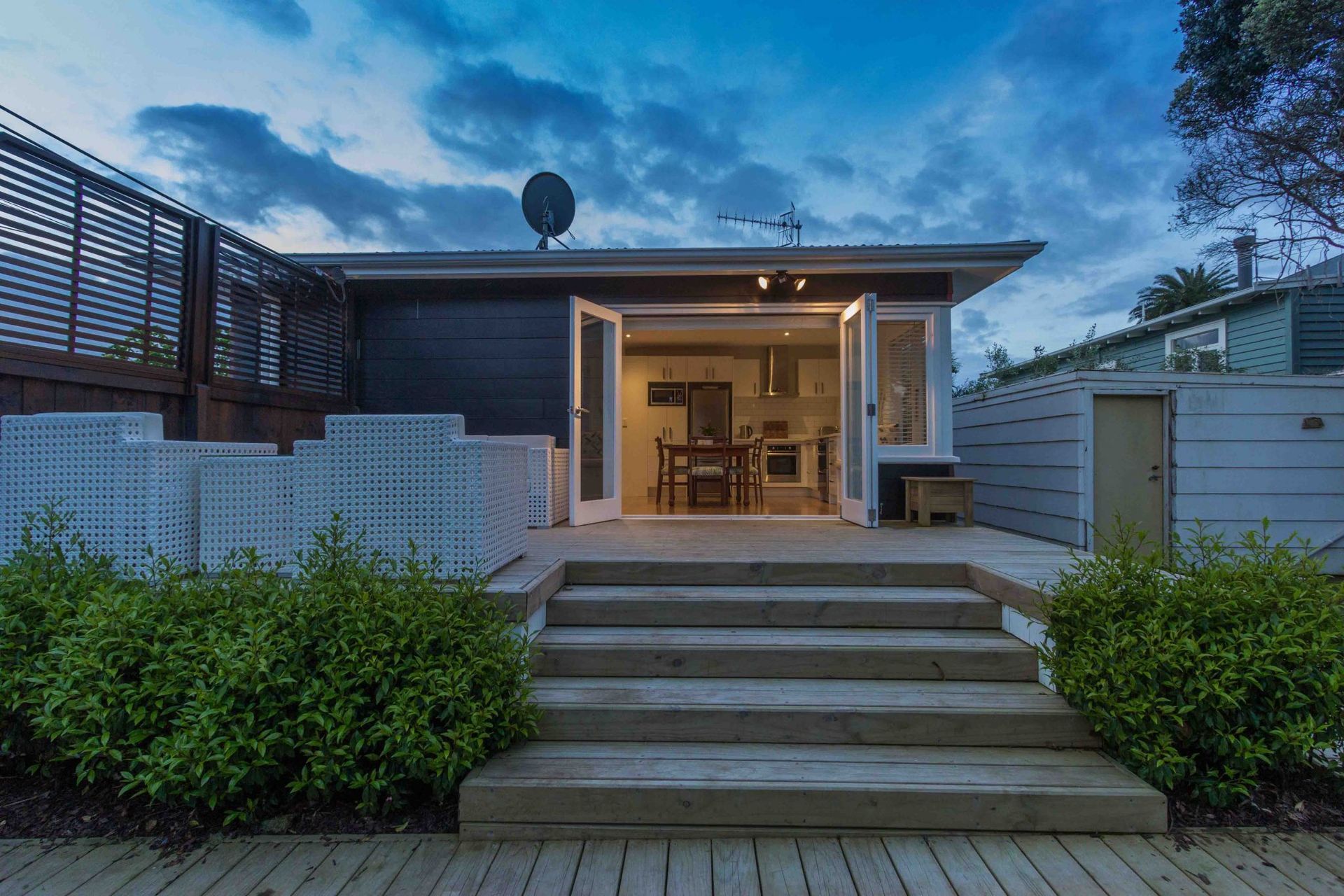 ArchiPro Project Summary - Comprehensive renovation transforming a neglected unit in Narrow Neck into a modern, inviting home with enhanced indoor-outdoor flow, additional bedroom and en-suite, restored matai flooring, and extensive outdoor decking.