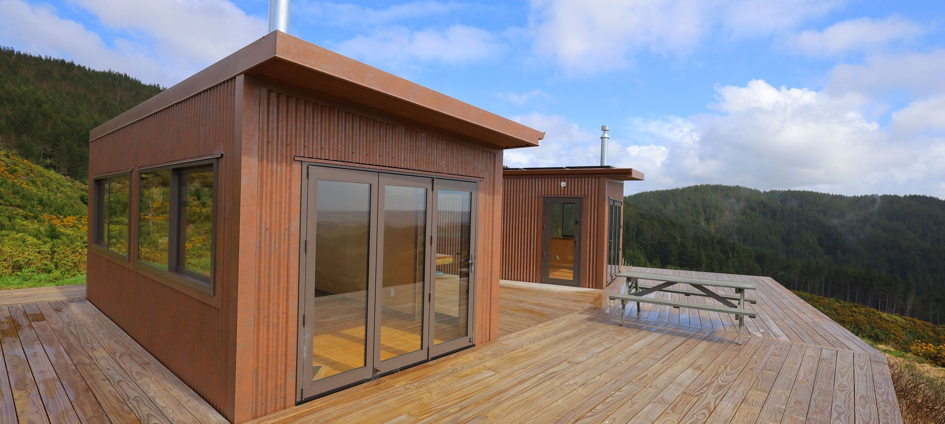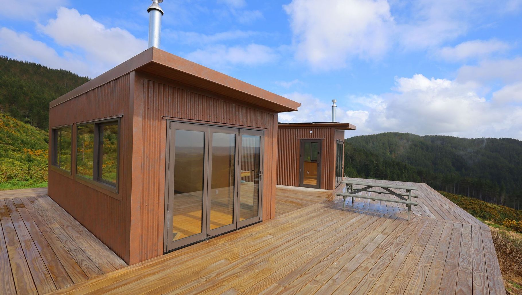 ArchiPro Project Summary - ECO Huts in Auckland, New Zealand: A harmonious blend of rustic charm and modern convenience, featuring Corten Iron exteriors, warm Plywood interiors, and an elevated deck with panoramic views, completed in 2023.