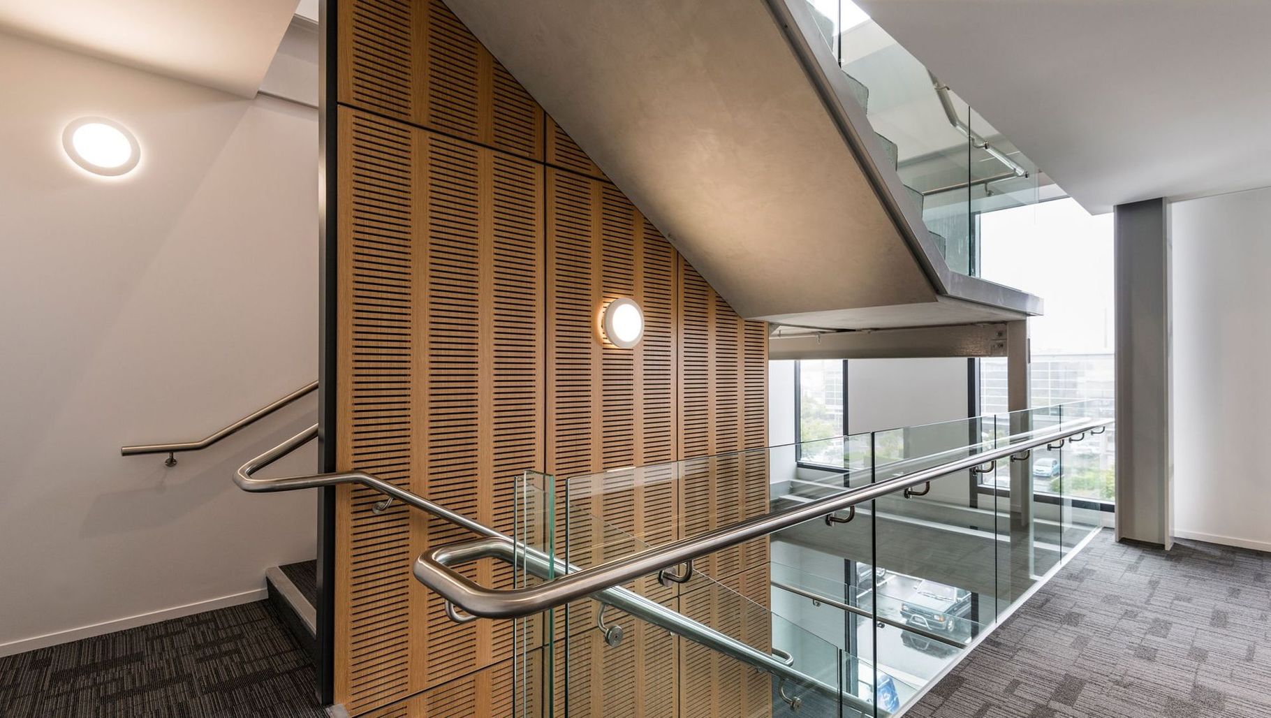 ArchiPro Project Summary - New four-level office building at Show Place, designed to accommodate smaller companies while harmonizing with the existing office park, featuring dynamic glazed lifts and an inviting entry foyer with an exposed concrete stair and timber acoustic wall.