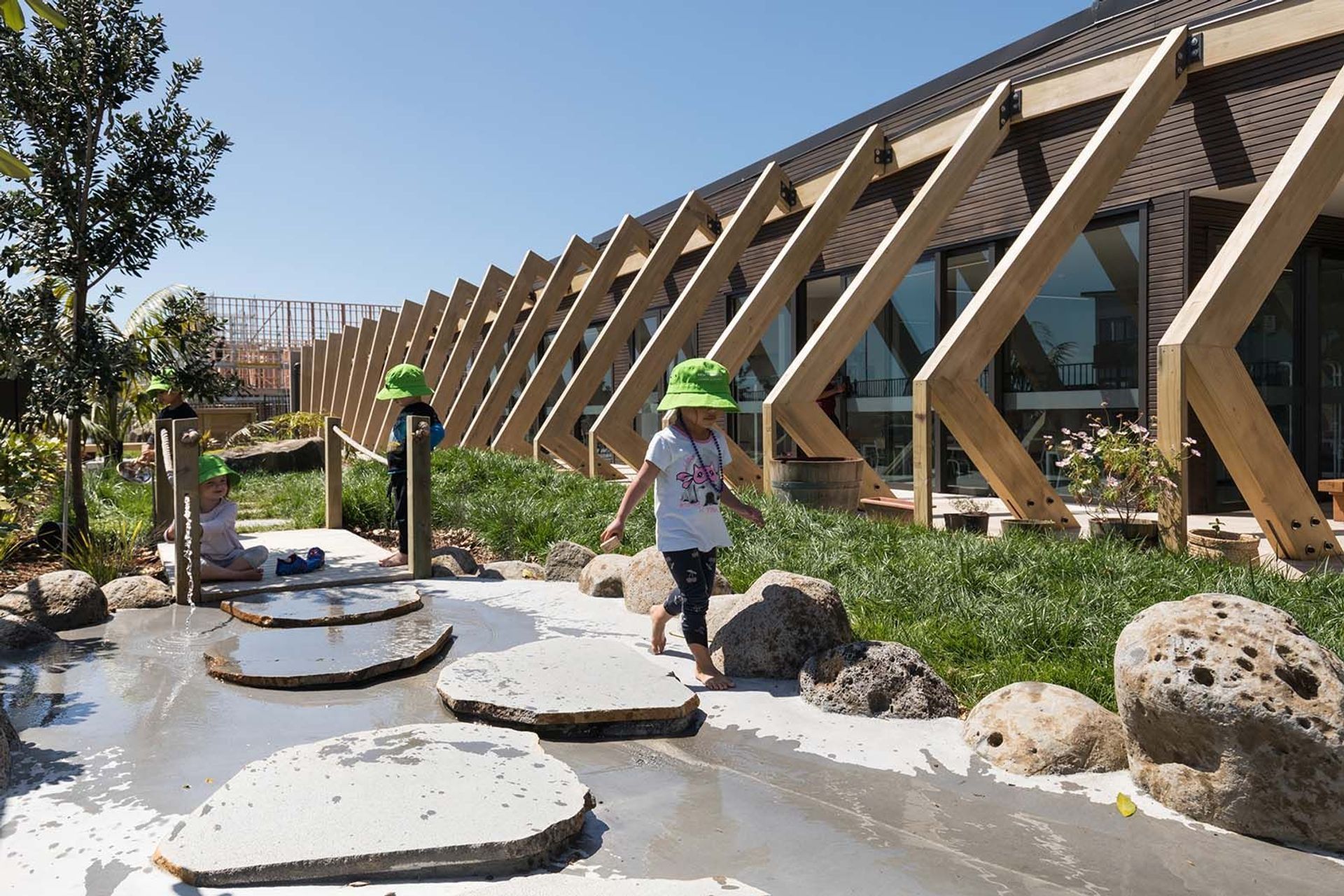 ArchiPro Project Summary - New Shoots Children's Centre in Whenuapai, completed in 2018, features a sustainable design that promotes healthy development and creativity in children, with a focus on natural materials, ample daylight, and interactive outdoor spaces.
