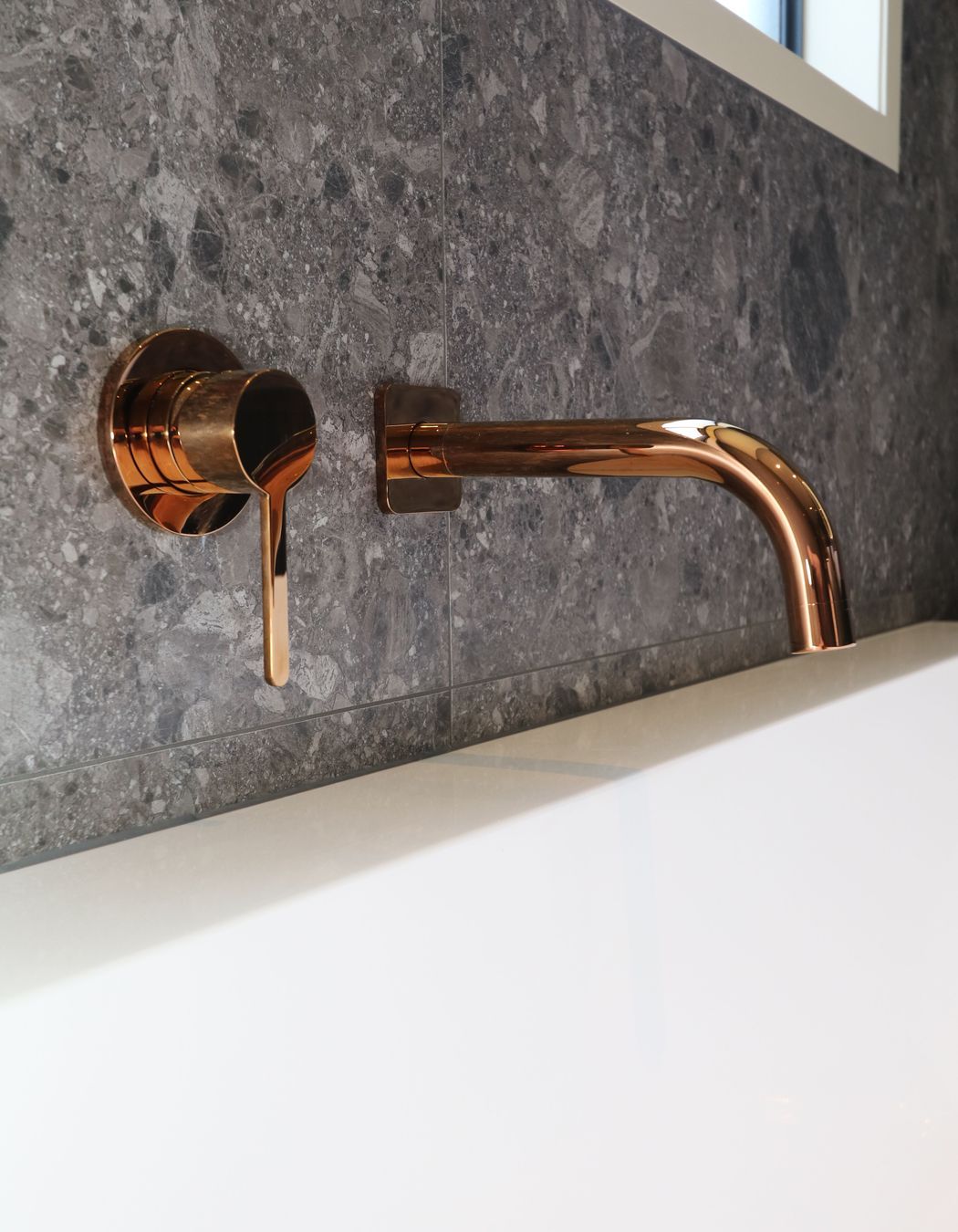 ArchiPro Project Summary - A striking bathroom design featuring Elite Bathroomware’s polished copper tapware, complemented by warm LED lighting and dark moody tiles, creating an atmospheric space that highlights unique design elements with a bold, sophisticated aesthetic.