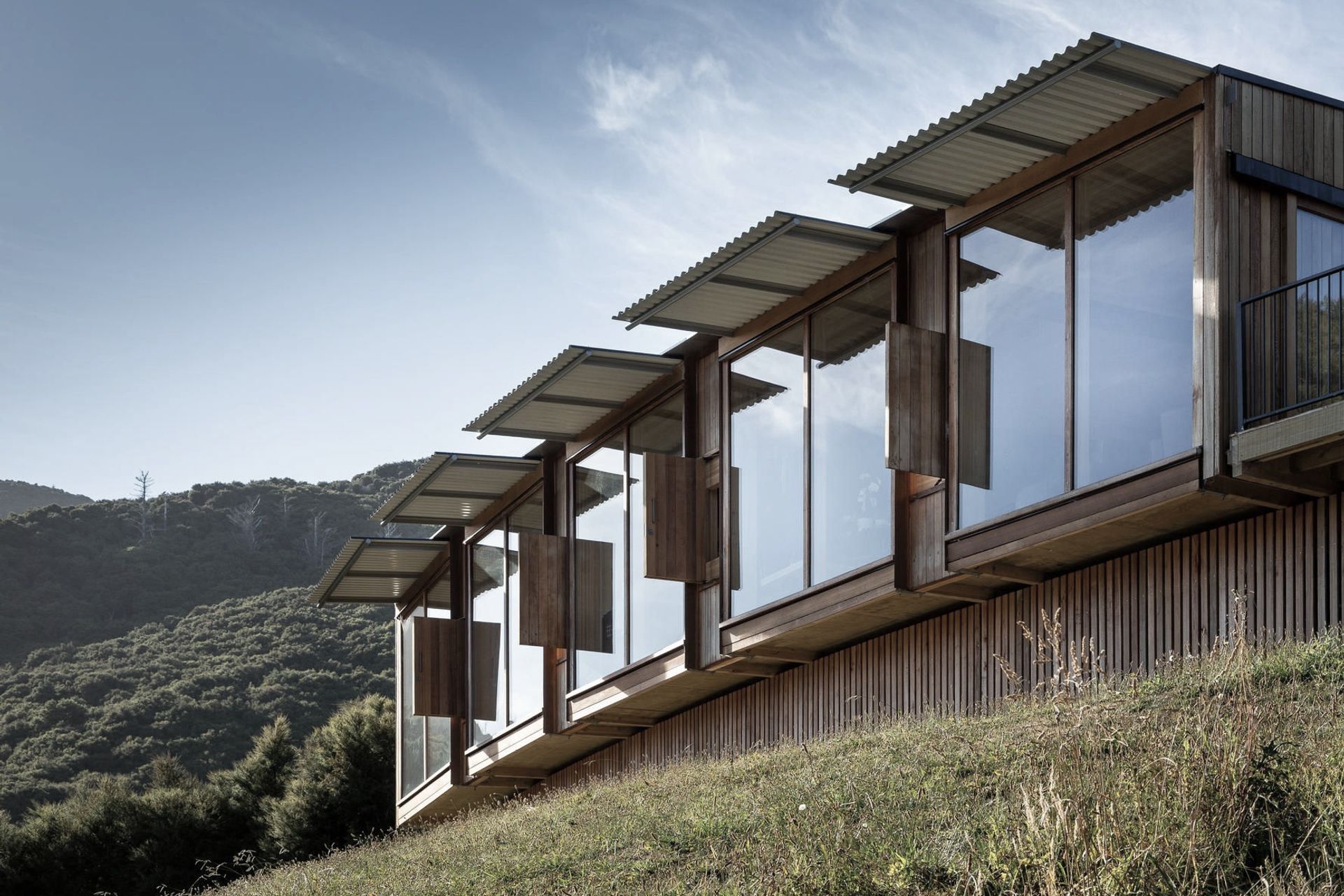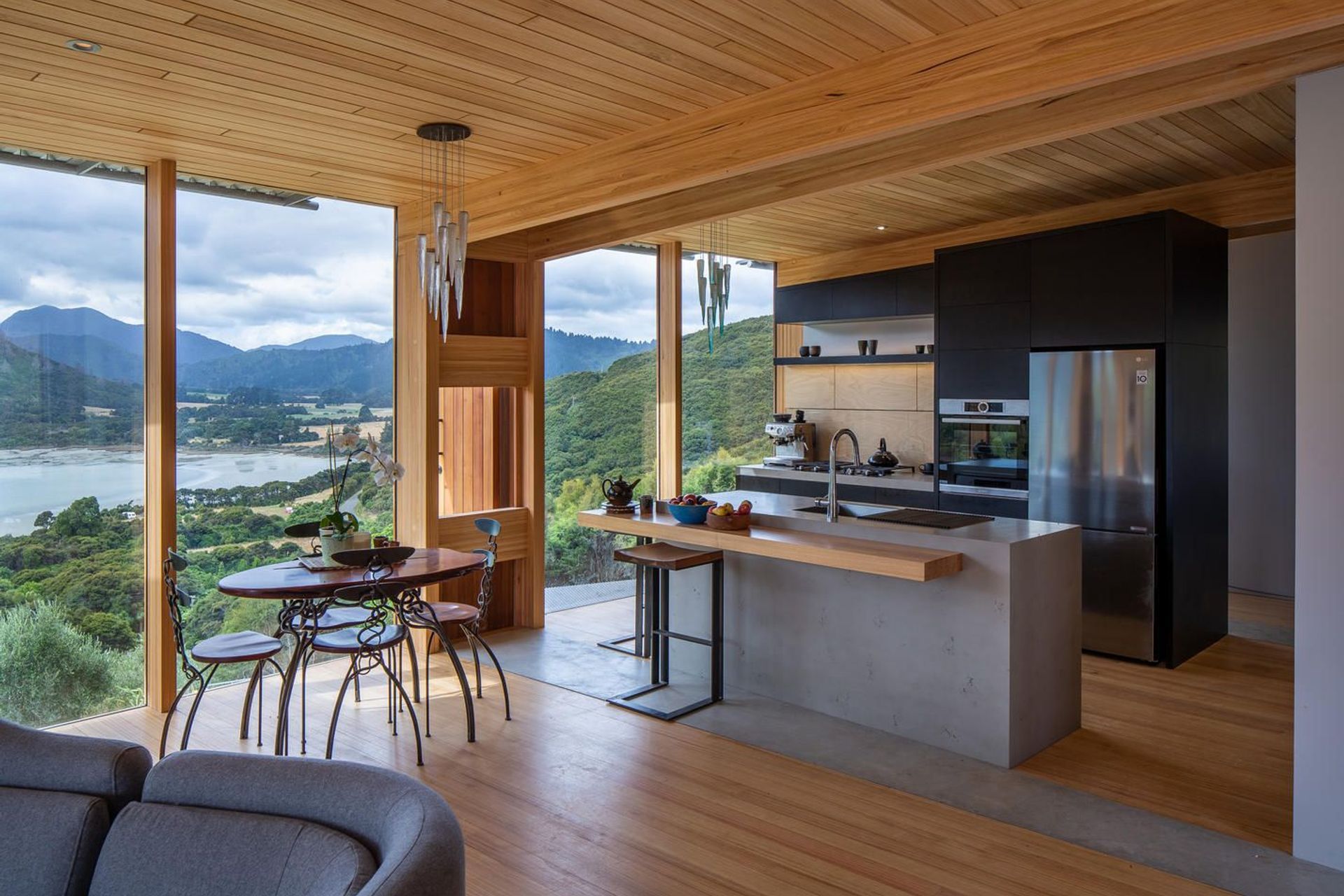 ArchiPro Project Summary - Ngāhere Hou: A sustainable off-grid retreat featuring a two-bedroom house and separate guest room, designed to embrace stunning views of Kenepuru Sounds while addressing the logistical challenges of remote construction.