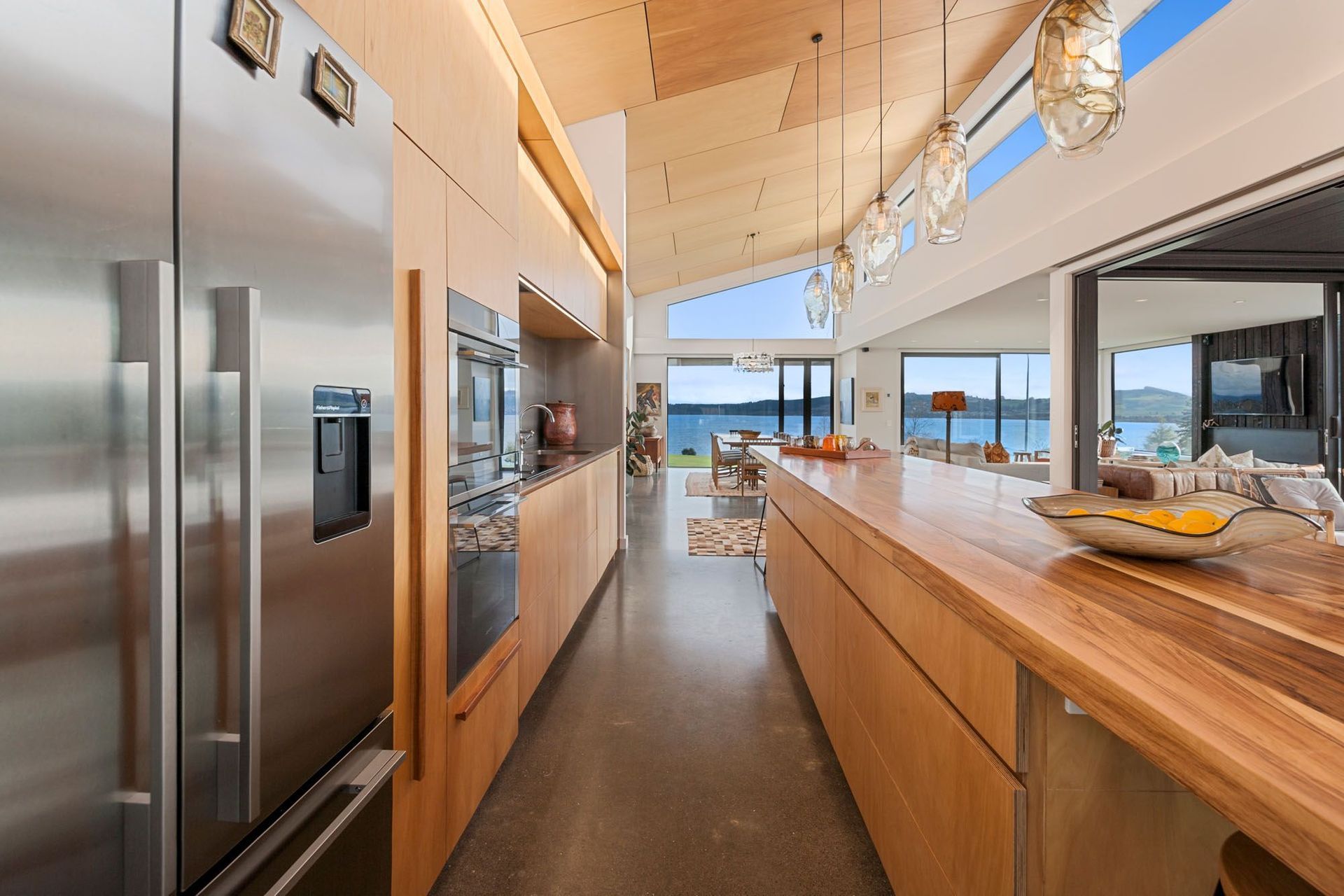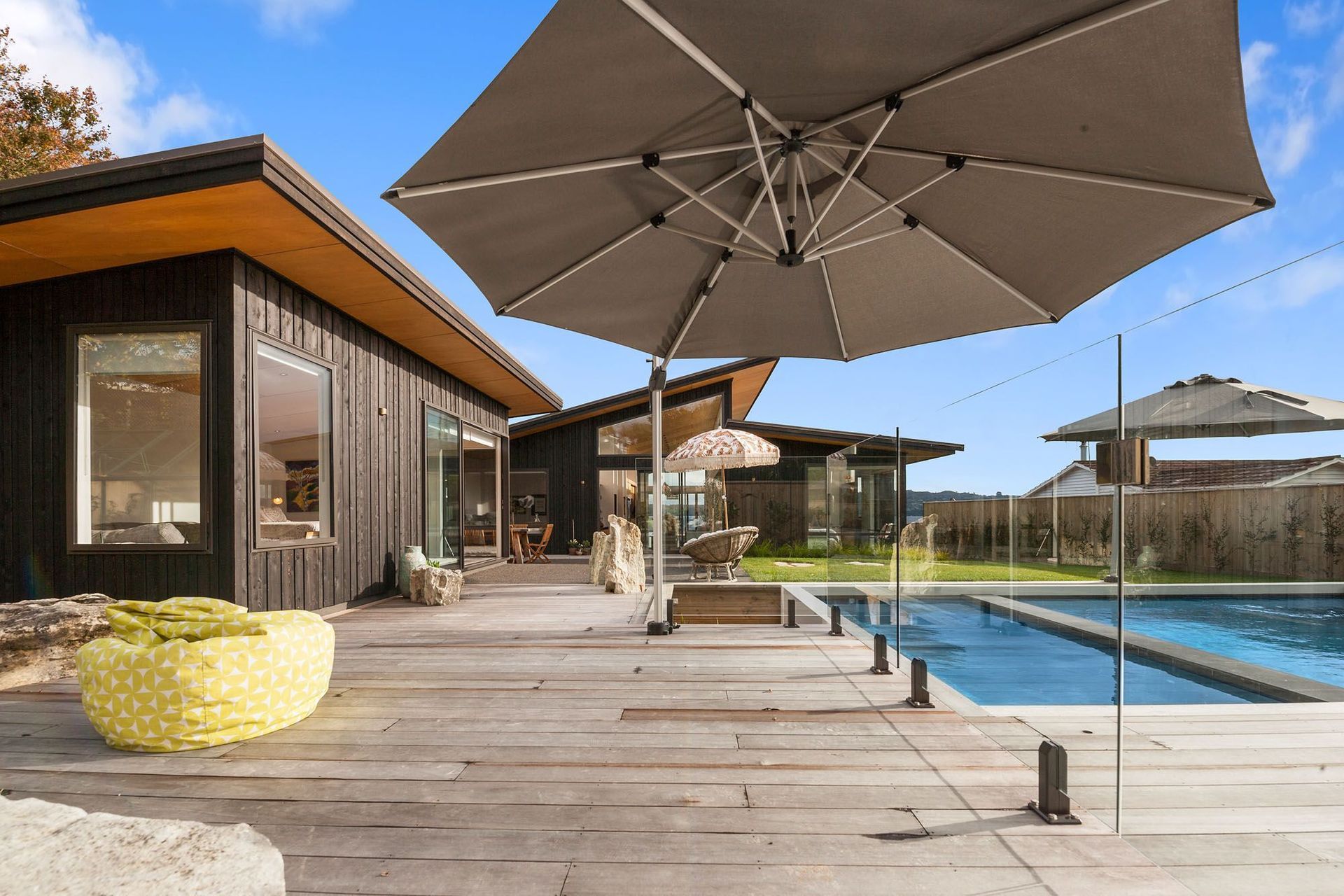 ArchiPro Project Summary - Elegant four-bedroom Hilltop home in Taupo featuring stunning Fijian kauri plywood ceilings, bespoke glasswork, and breathtaking views of the lake and mountains, complemented by luxurious outdoor spaces including a deep concrete swimming pool and a thermally heated hot pool.