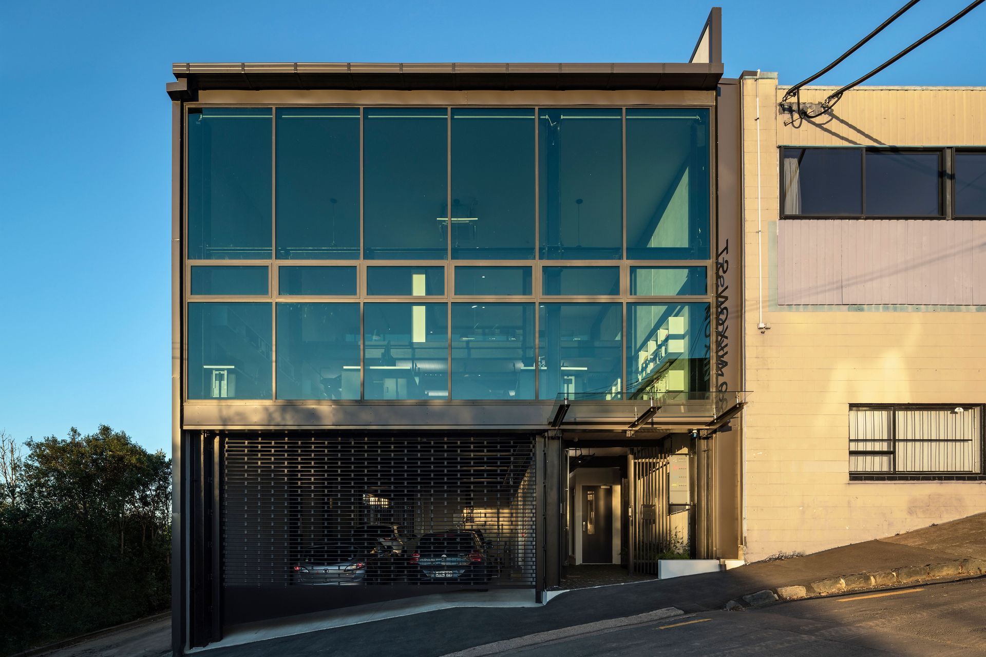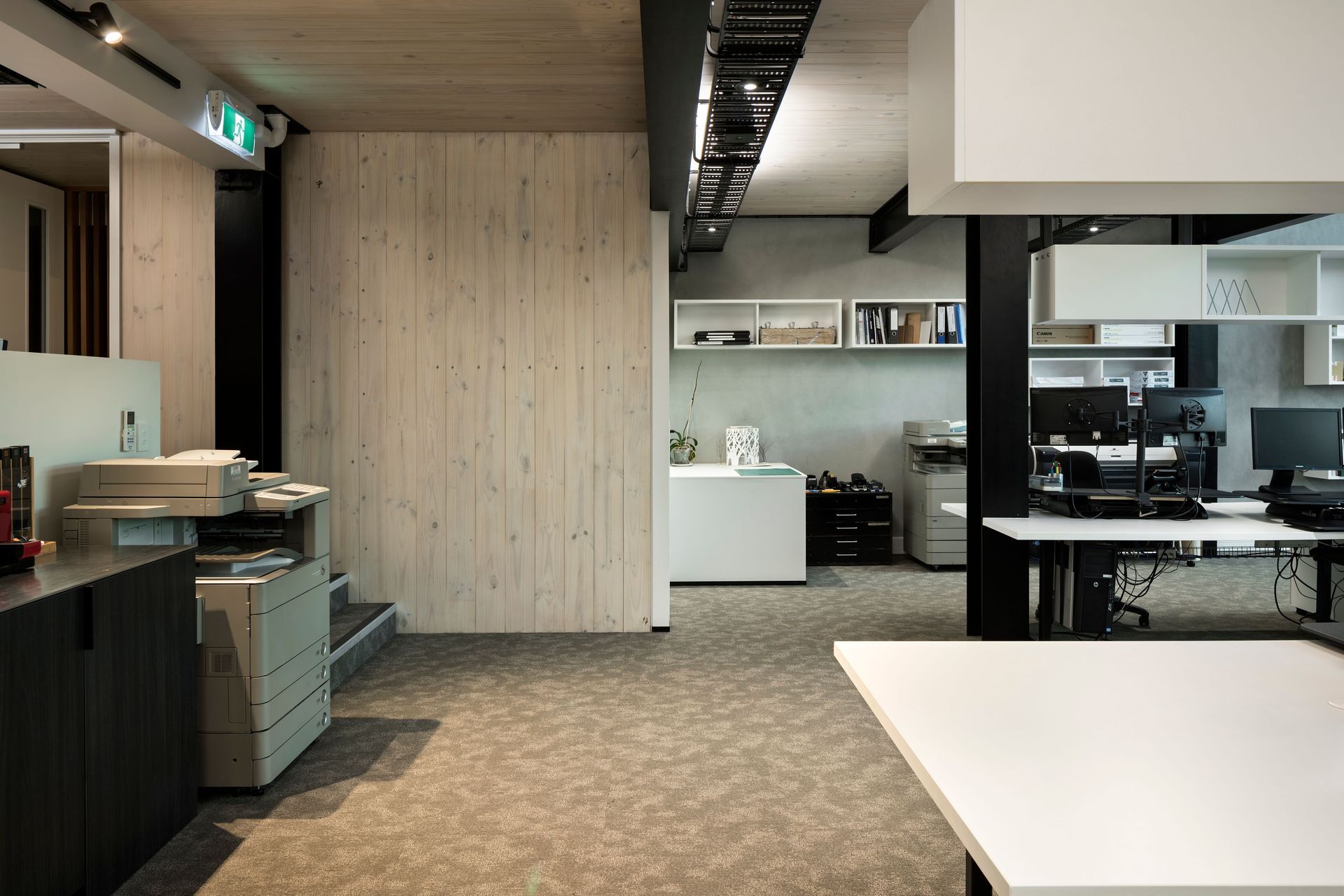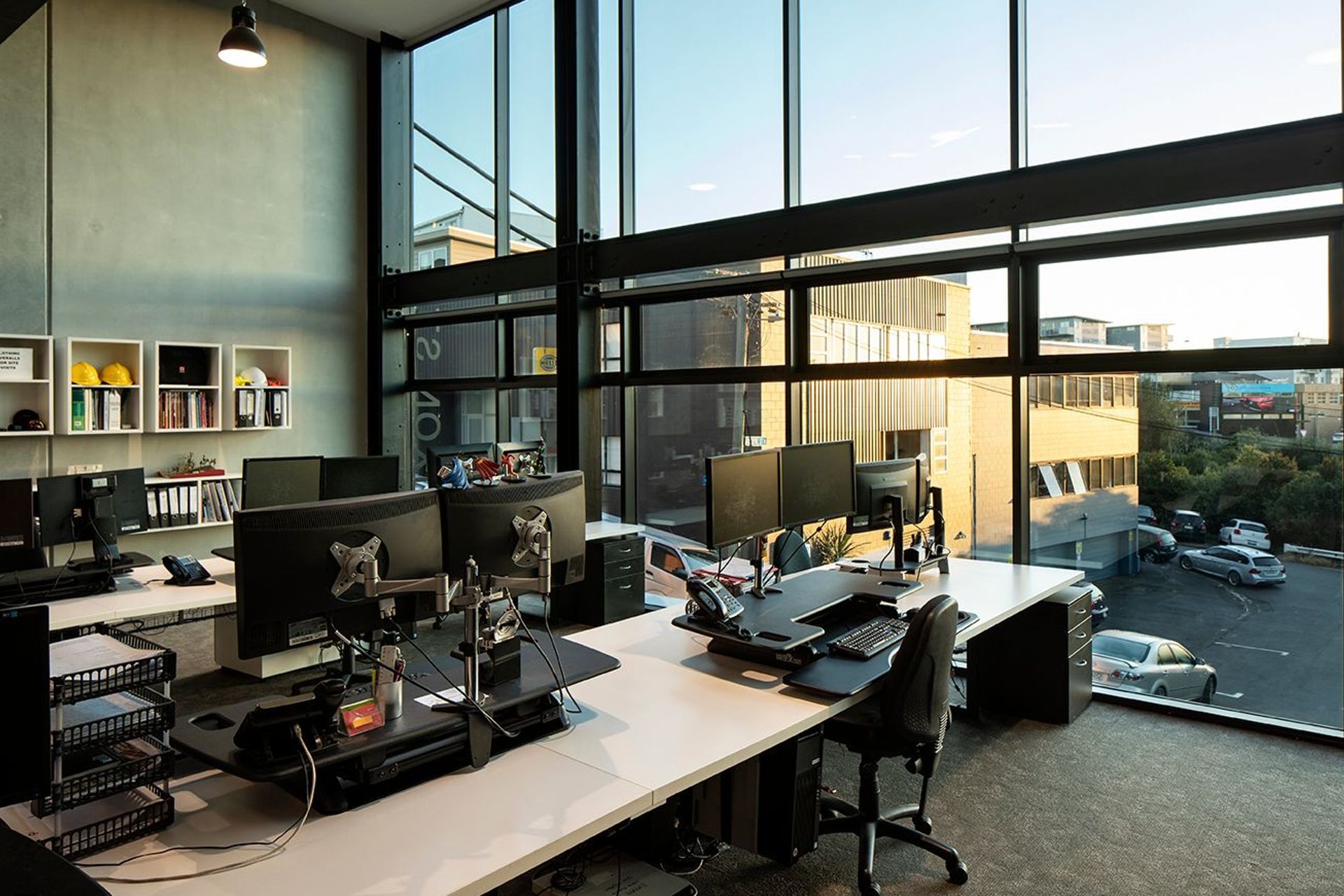 ArchiPro Project Summary - Nixon Studio: A collaborative architectural design firm nestled in a city-fringe setting, featuring an open-plan studio, exposed structural elements, and abundant natural light through tinted glass façades and large windows.
