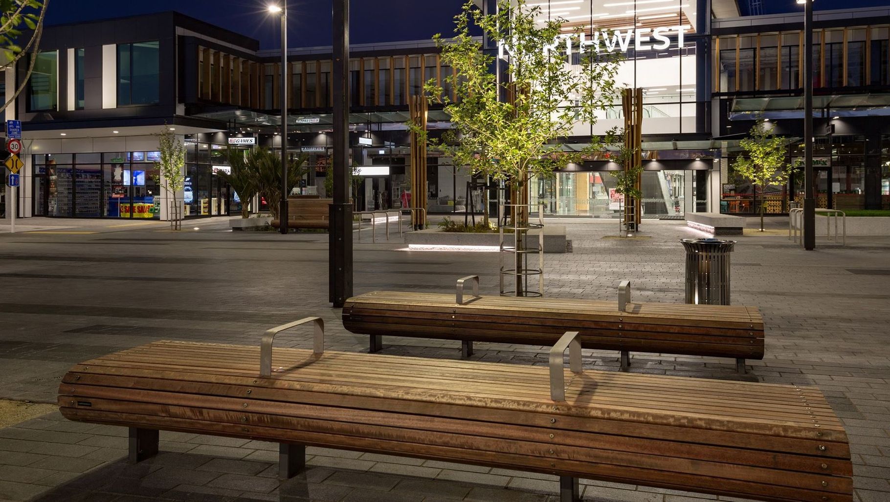 ArchiPro Project Summary - North West is a mixed-use development in New Zealand, featuring pedestrian-friendly walkways, shaded plazas, and inviting steel structures.