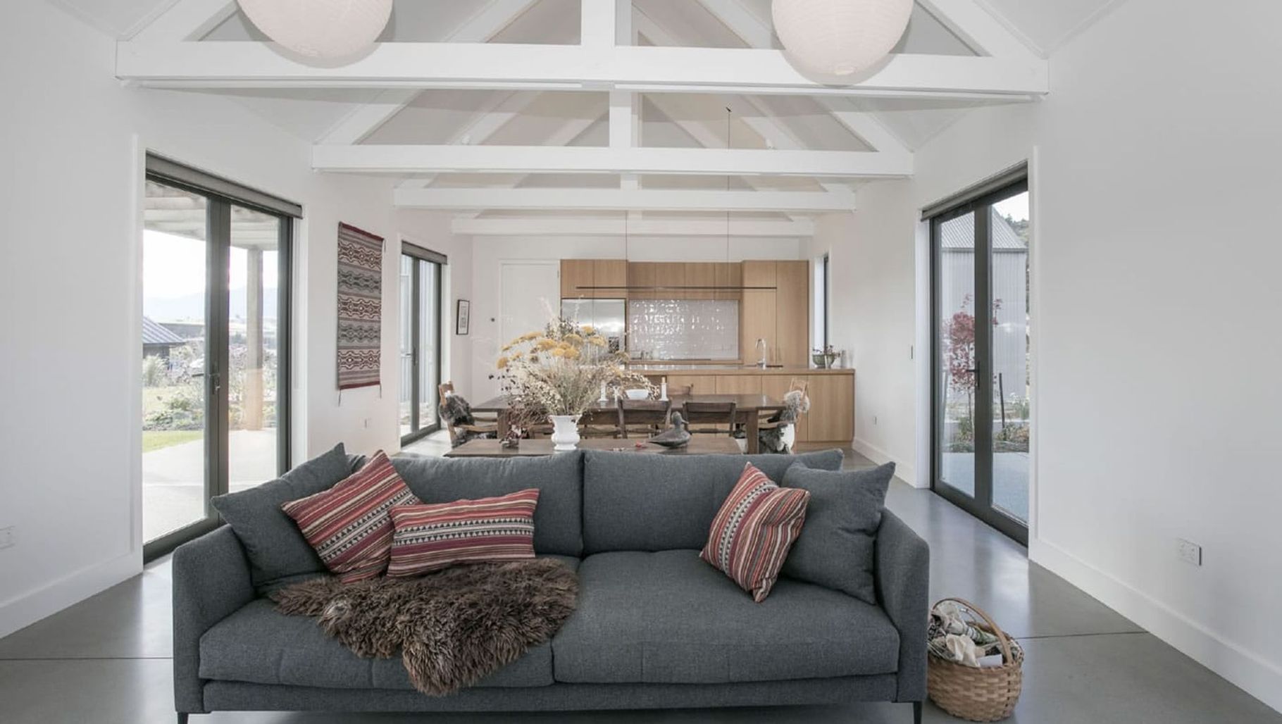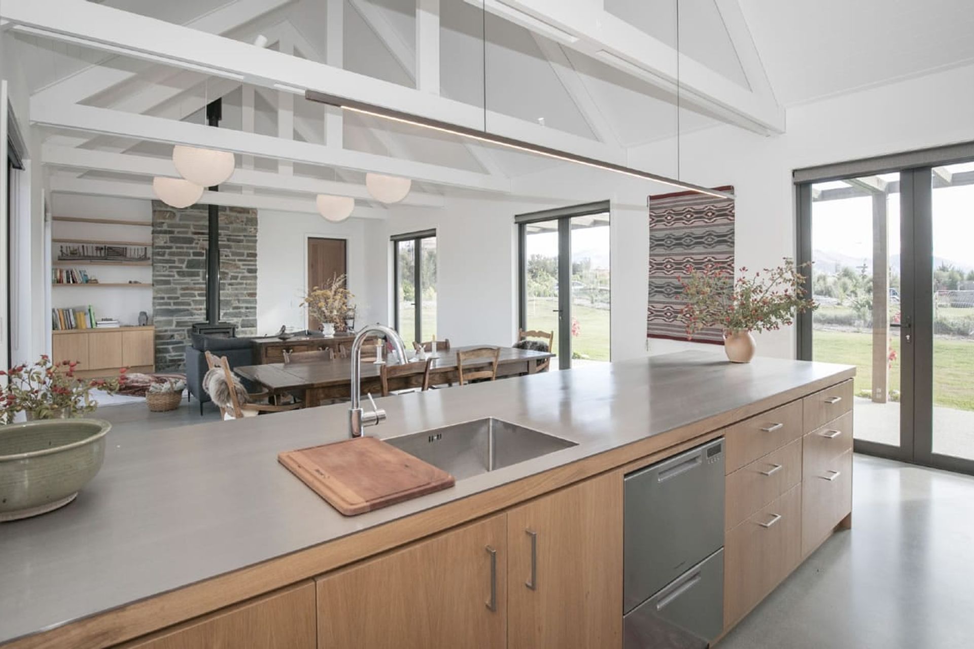 ArchiPro Project Summary - A stunning 213sqm split-level home in Northlake featuring exposed trusses, a pitched ceiling, and a cozy stone fireplace, designed by Salmond Architecture, Wanaka.