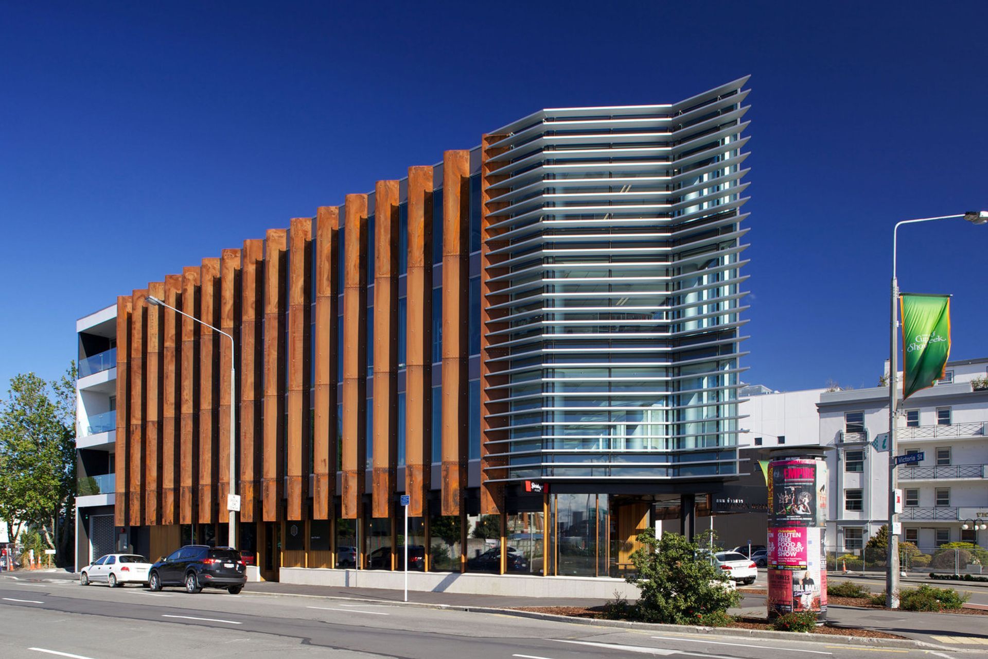 ArchiPro Project Summary - A striking commercial office building in Central City, Christchurch, featuring a chiselled and cranked form that enhances the post-earthquake streetscape at a prominent intersection.