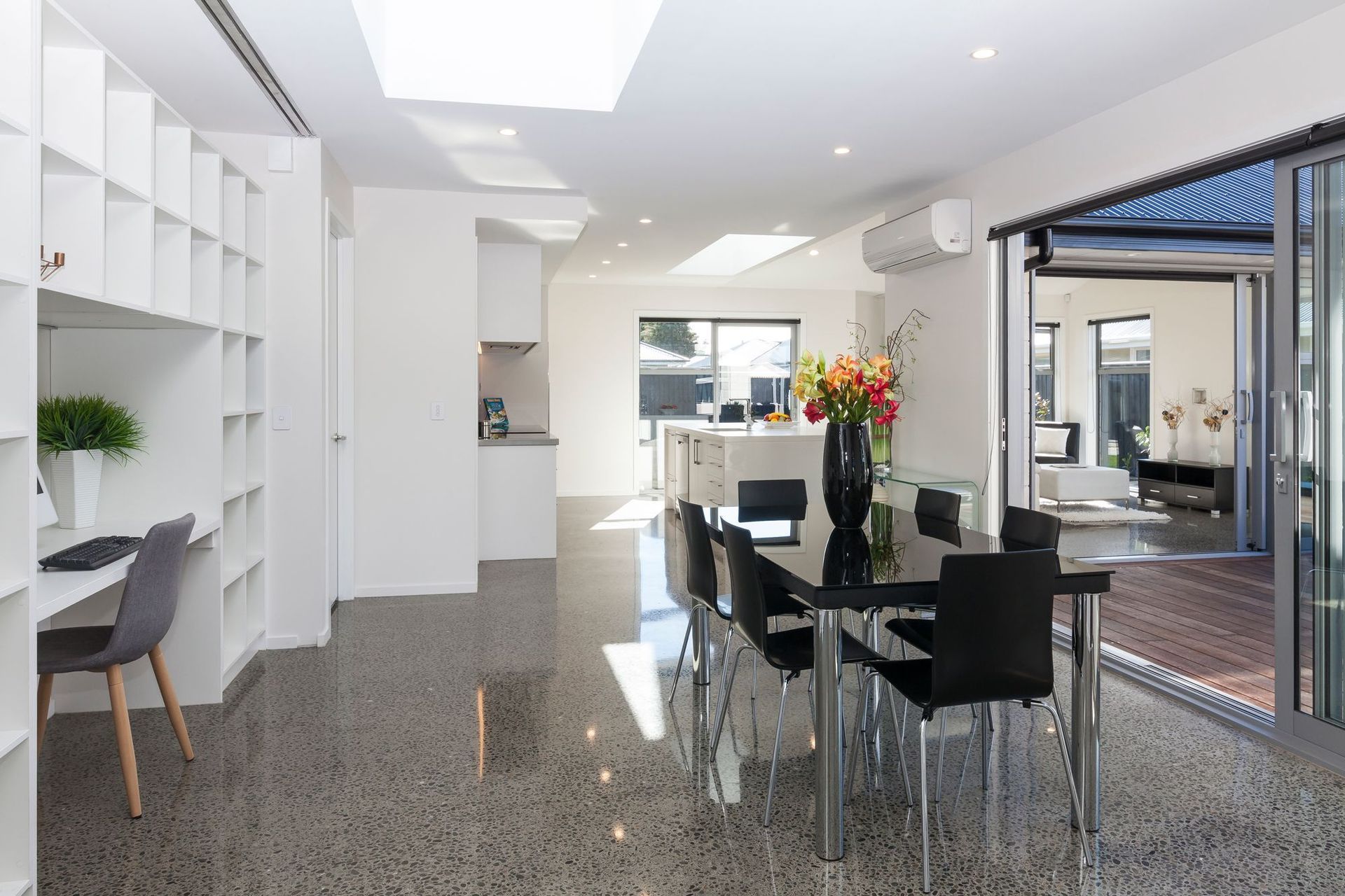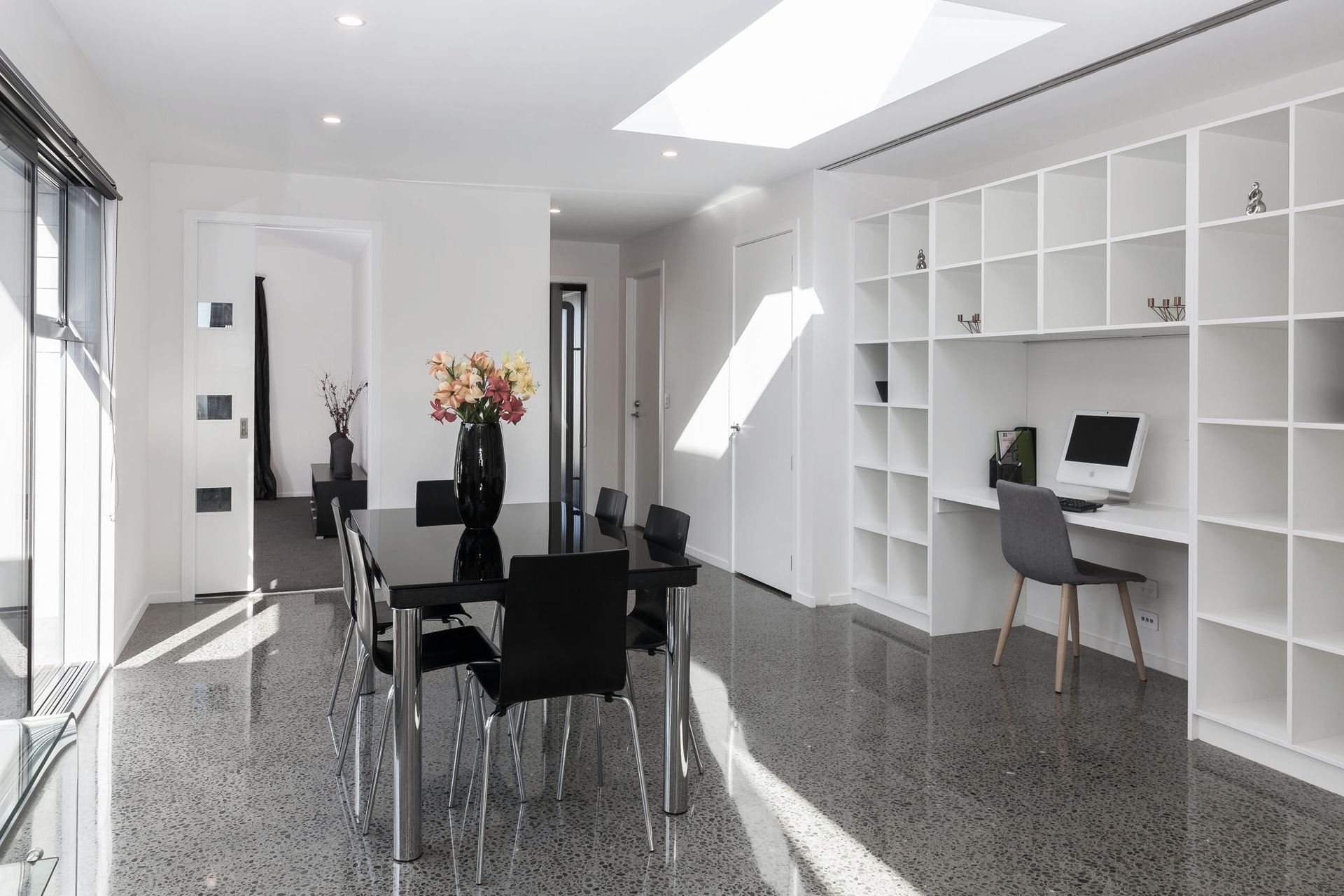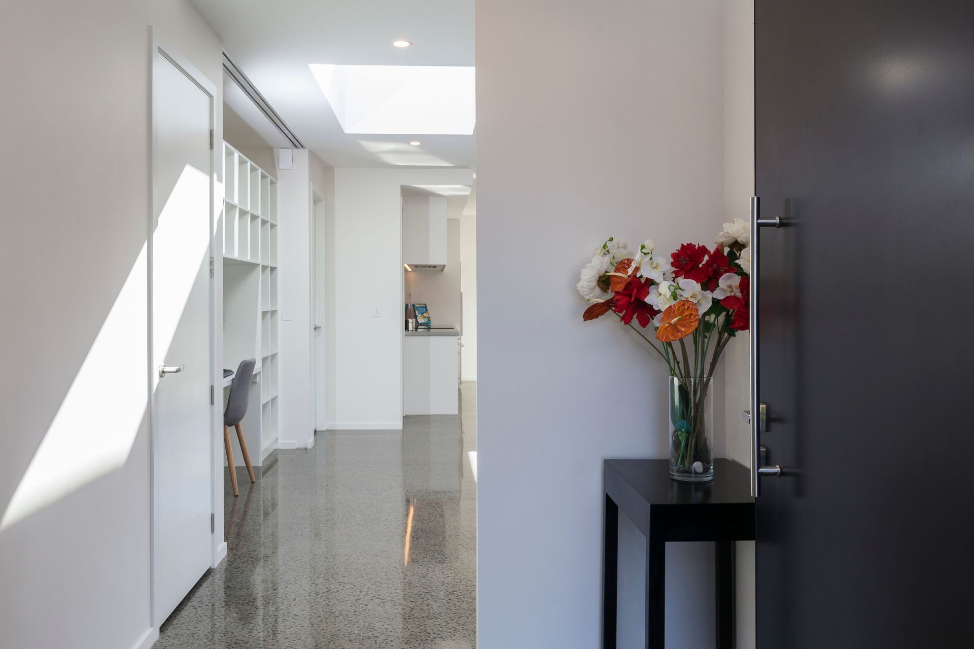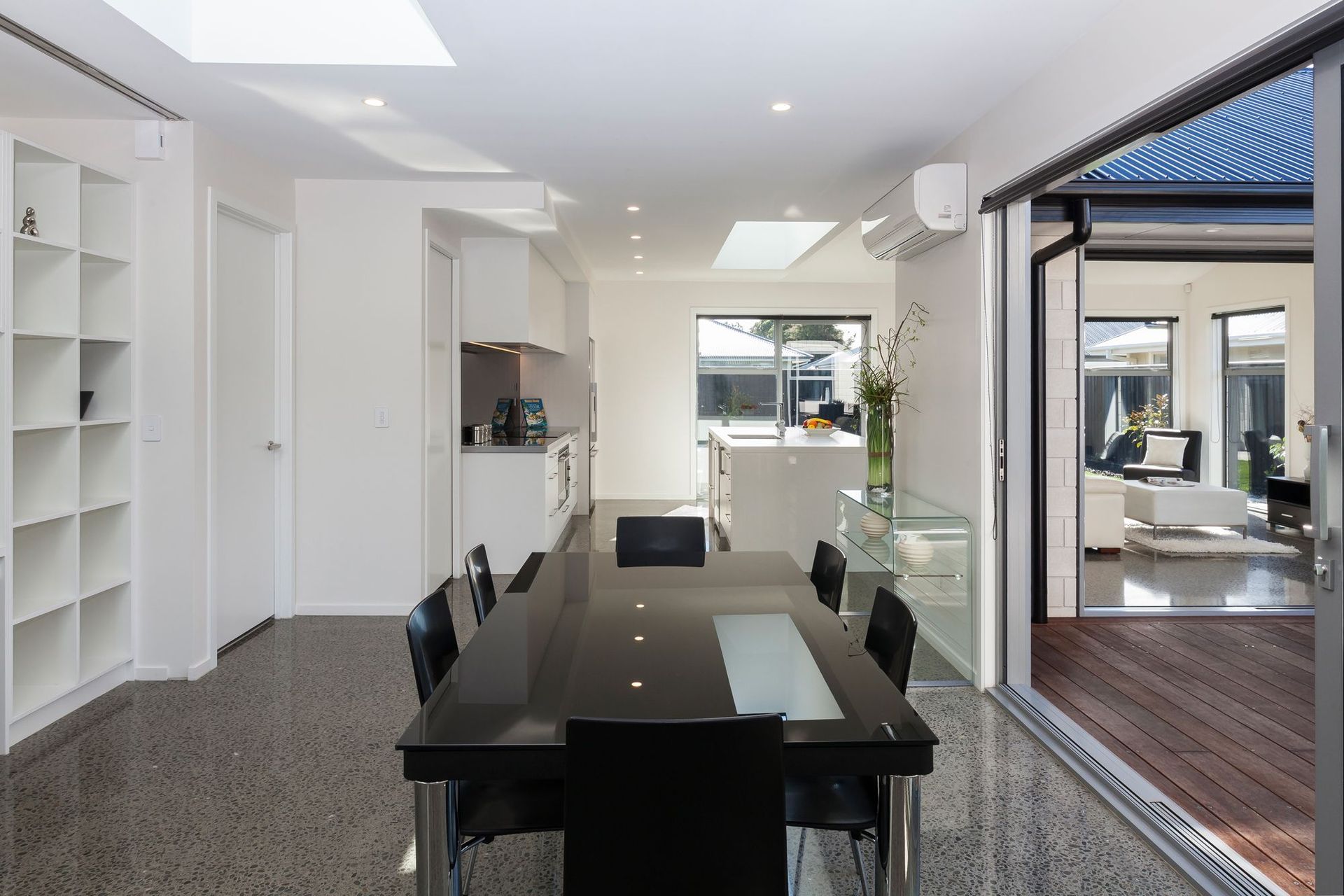 ArchiPro Project Summary - A beautifully designed compact home featuring polished concrete flooring, cathedral ceilings, and a modern kitchen, complemented by four bedrooms, two bathrooms, and two semi-enclosed outdoor courtyards for entertaining.