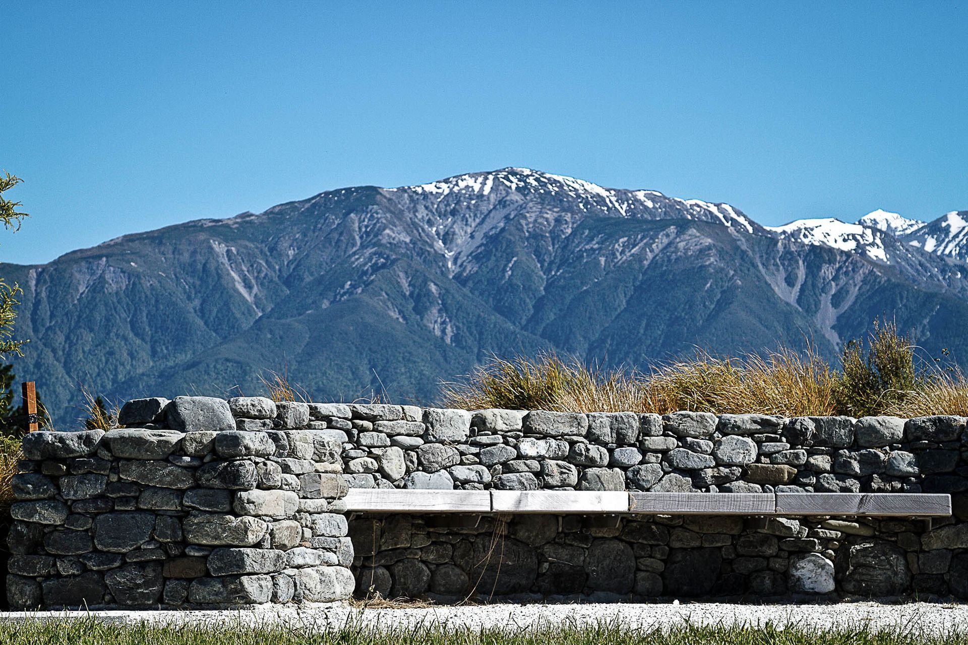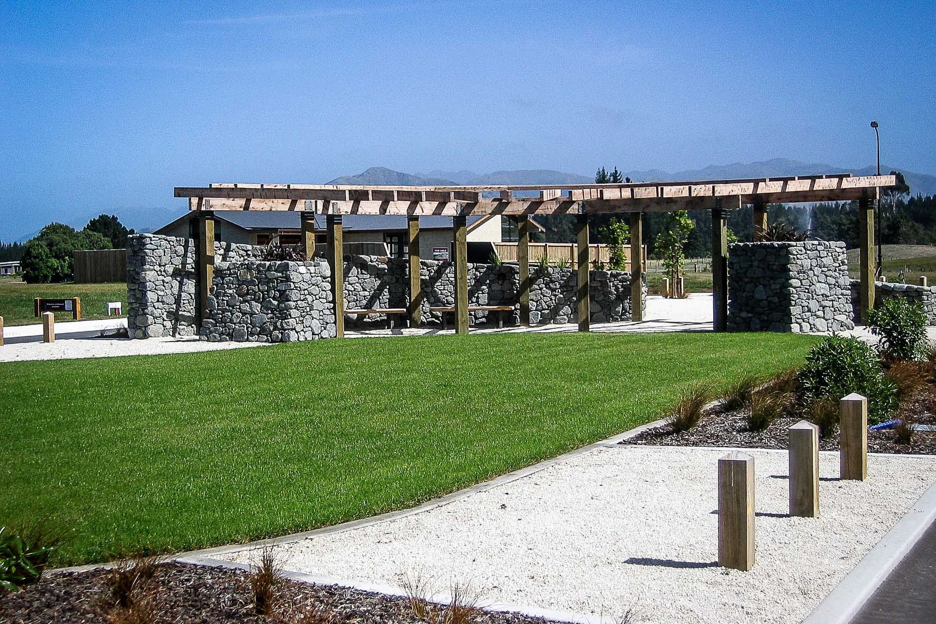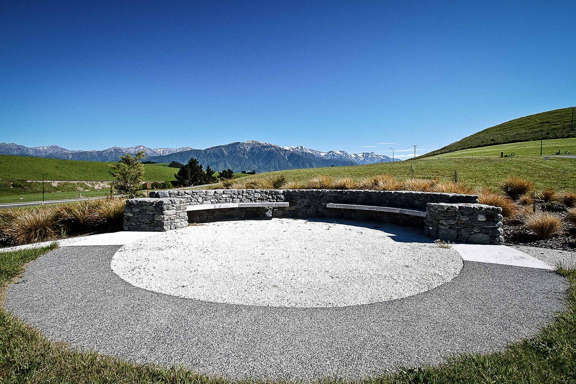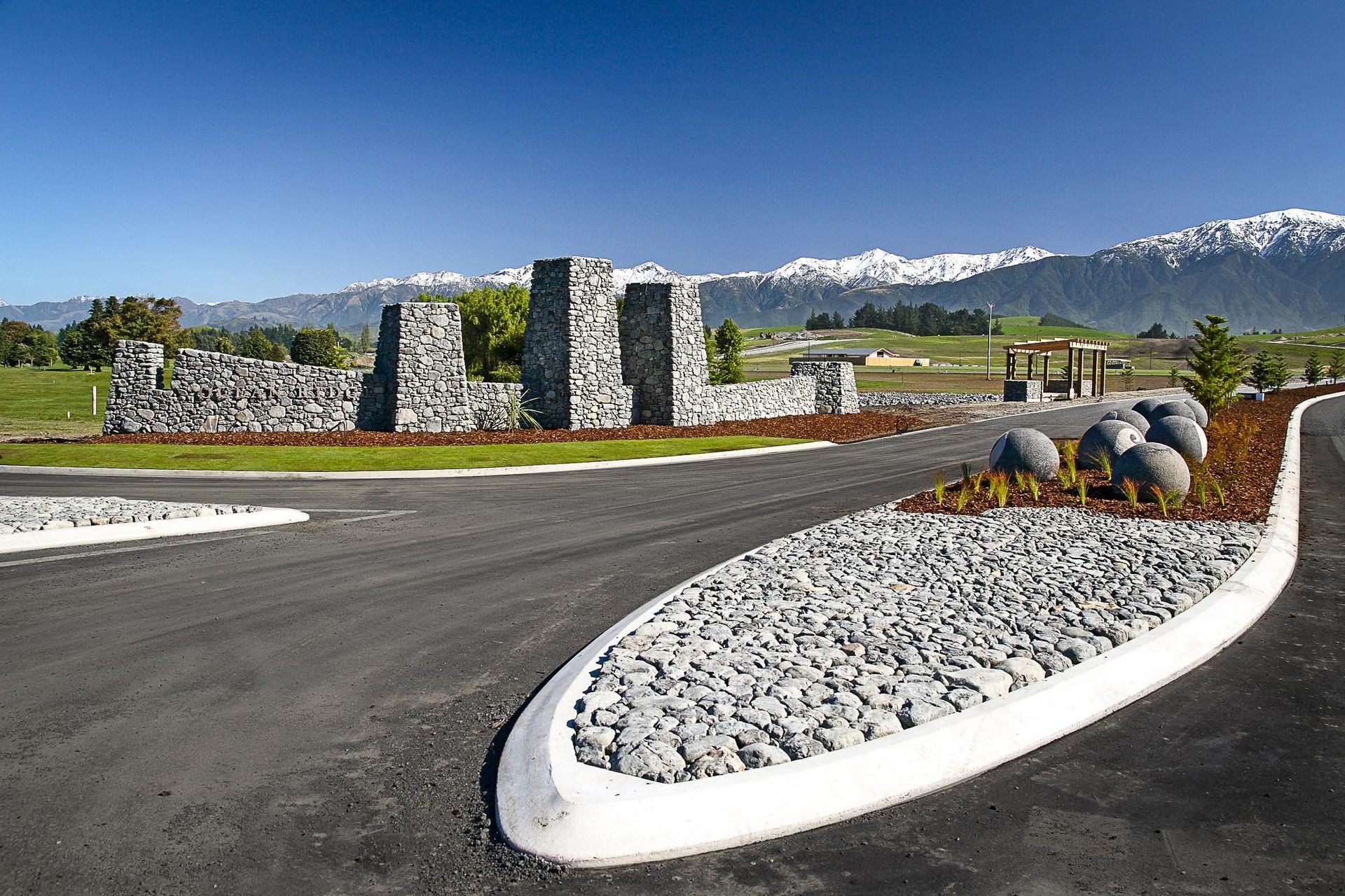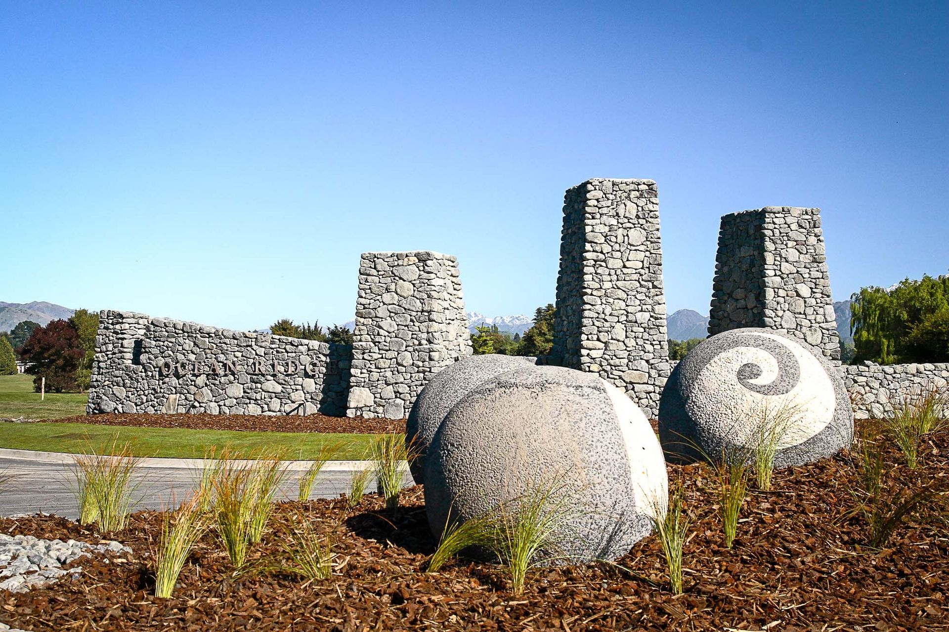 ArchiPro Project Summary - Ocean Ridge residential development harmoniously integrates with the Kaikoura coastline, featuring locally sourced stone structures, lakes, viewing platforms, public reserves, walking tracks, and extensive native revegetation, crafted by Kamo Marsh Landscape Architects.