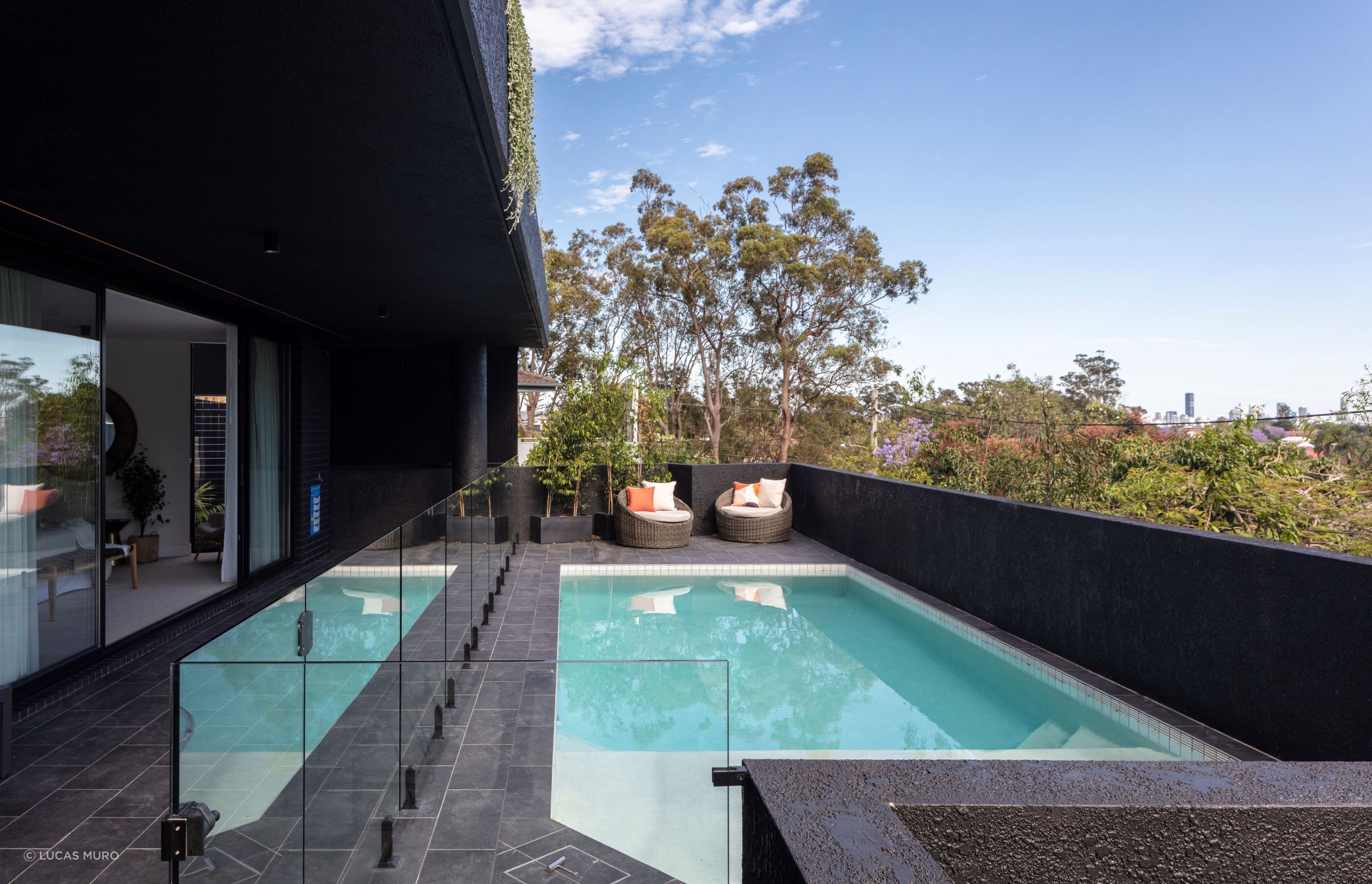 ArchiPro Project Summary - Odessa Residence features a striking black palette and elevated garden planters, seamlessly integrating into Brisbane's Southside ridges while providing privacy and the benefits of inner city living.