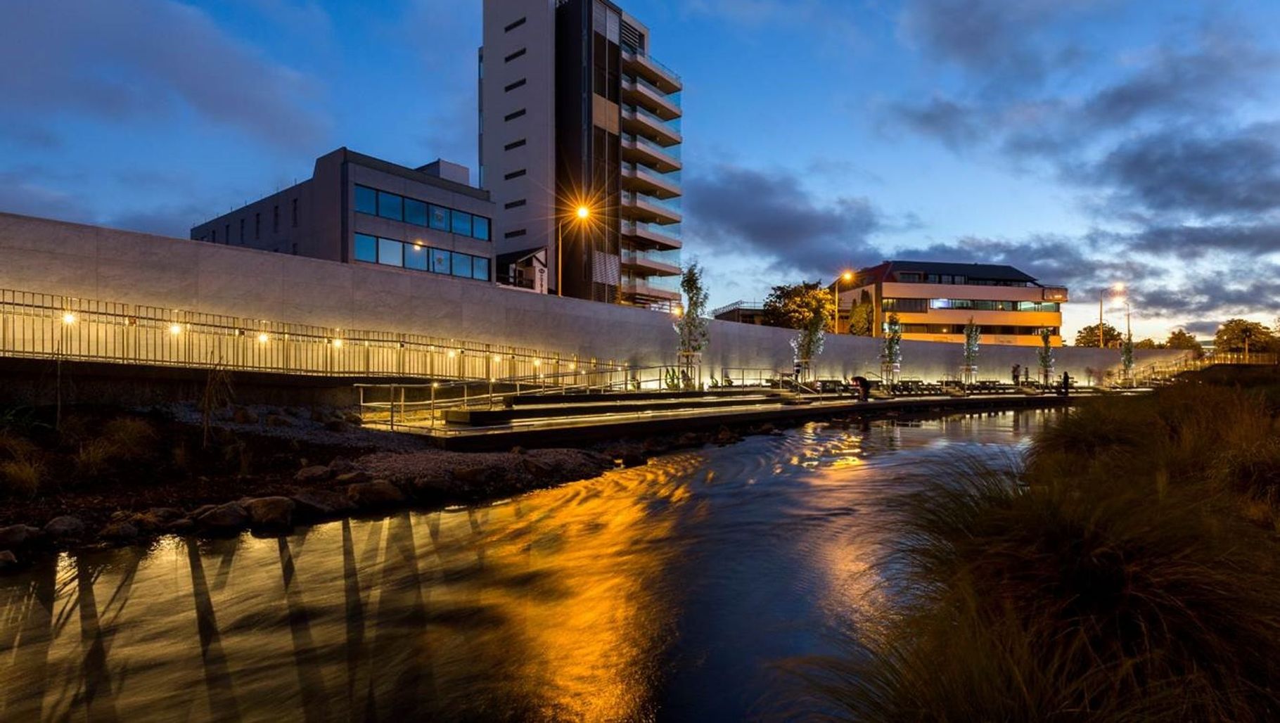 ArchiPro Project Summary - Oi Manawa, the Canterbury Earthquake National Memorial, is a reflective space designed by Grega Vezjak and GHD, featuring a marble-clad wall inscribed with names of the lost, set along the Avon River in Christchurch, New Zealand.