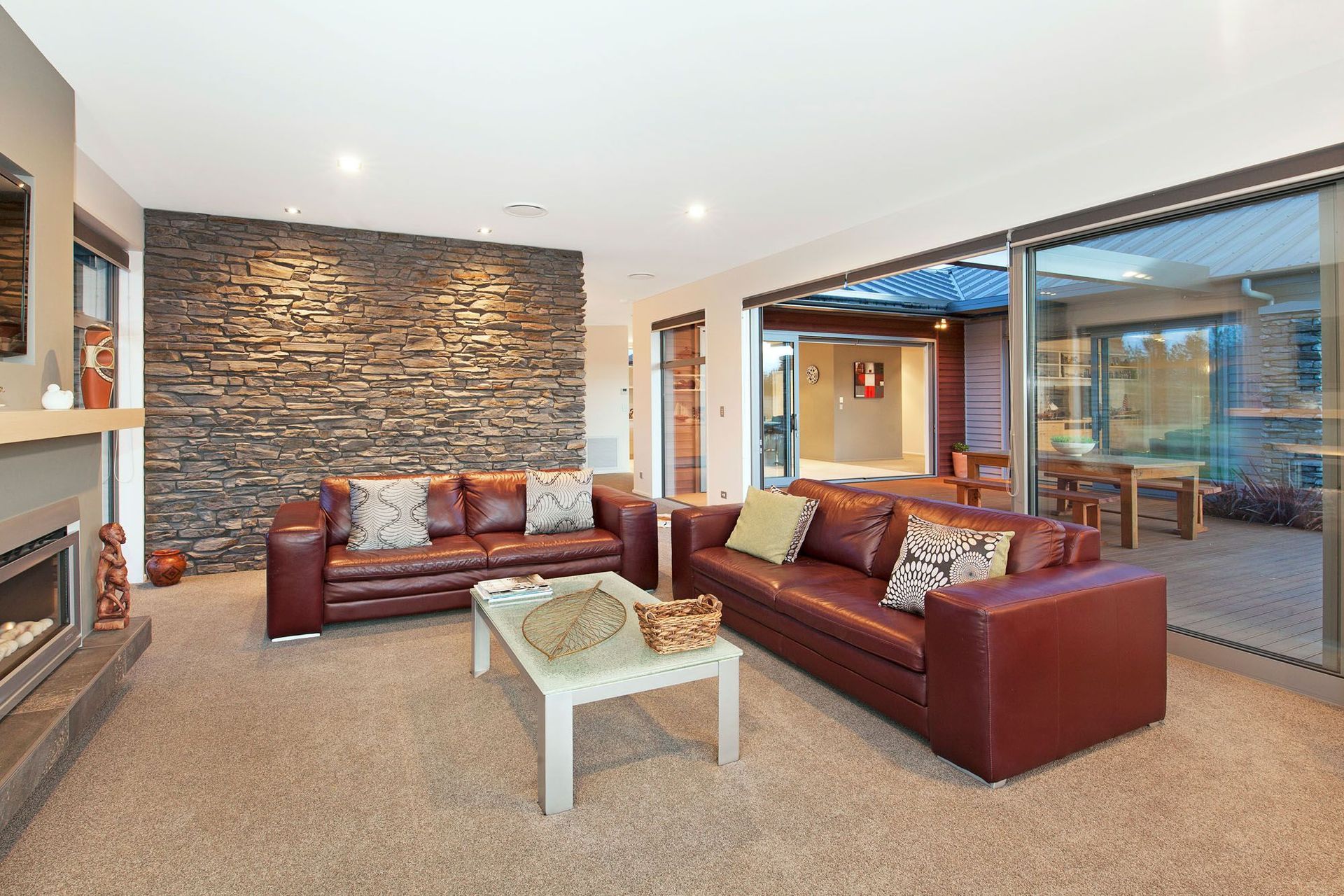 ArchiPro Project Summary - A stunning ranch-style stone house designed by Jason Higham, featuring seamless indoor-outdoor living, expansive rural views, large windows, exposed trusses, and thoughtfully designed outdoor areas for comfort and protection from prevailing winds.