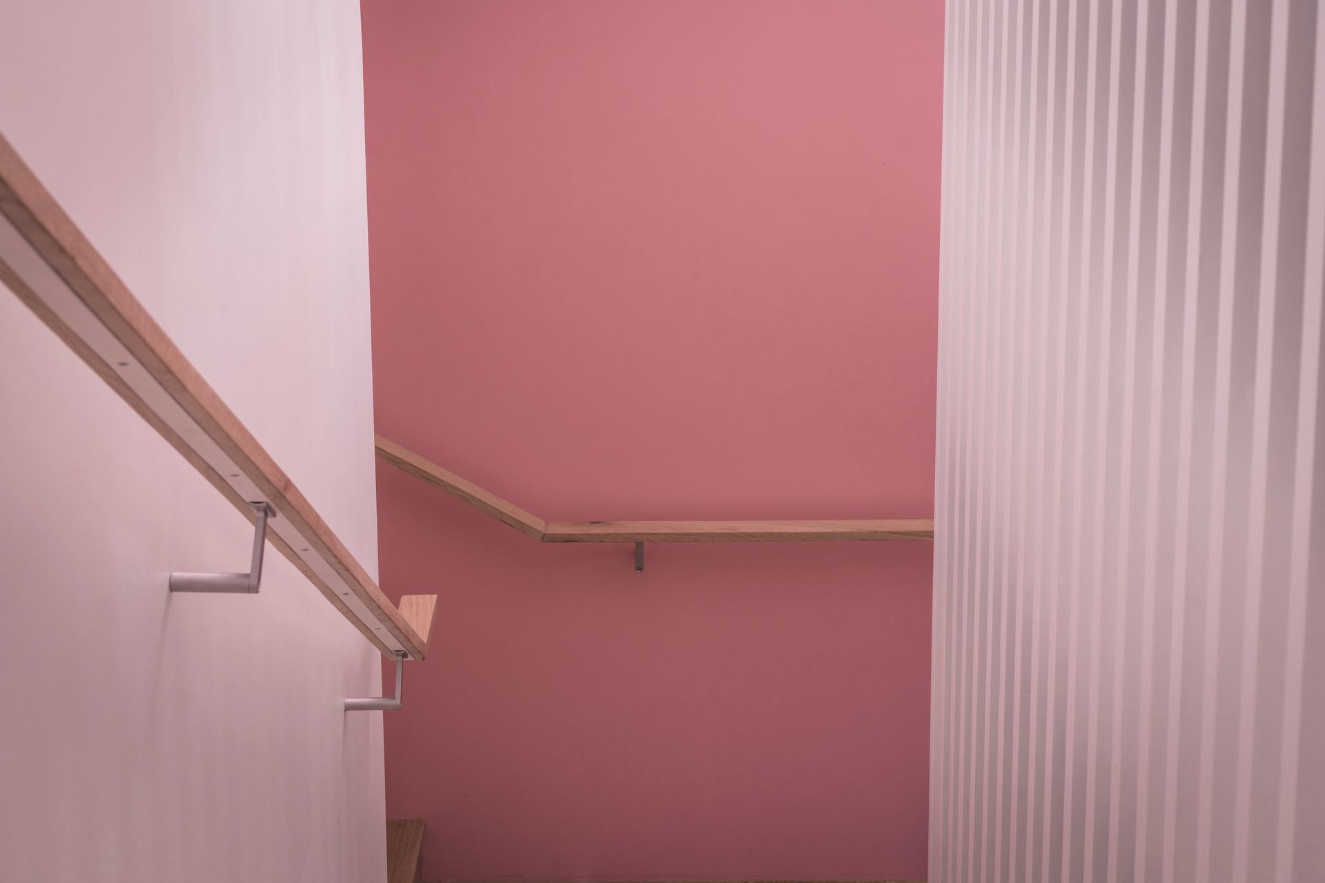 ArchiPro Project Summary - A vibrant Auckland renovation featuring a striking blend of bright pink and white walls, complemented by Halliday & Baillie's classic HB500 stair rail in satin chrome, designed by Malcolm Walker Architects and built by Faulkner Construction.