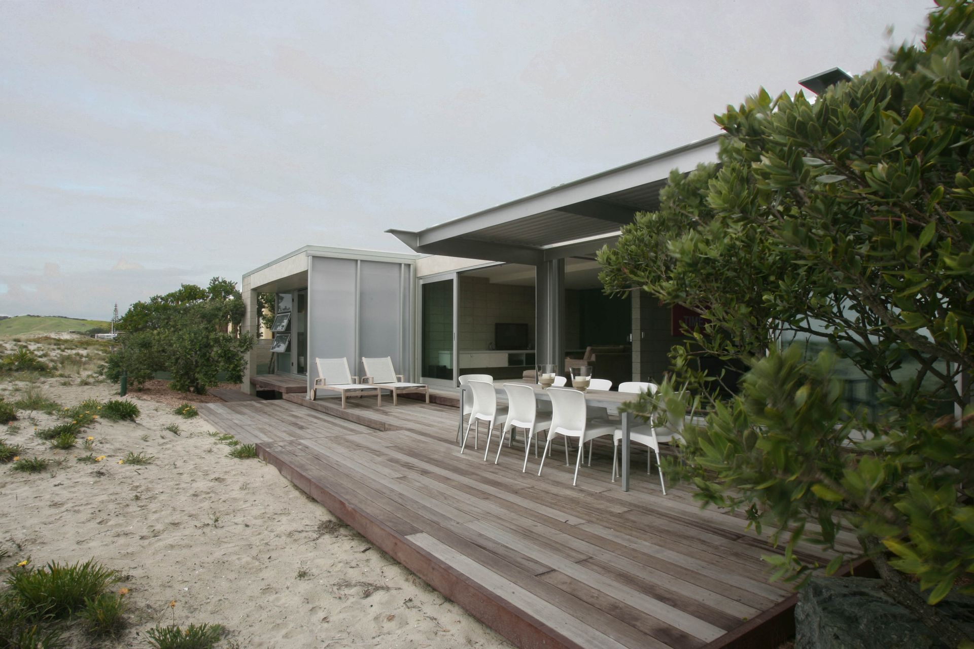 ArchiPro Project Summary - Elegant Omaha Beachfront House harmoniously integrates with its dune front location, featuring seamless flow between living spaces, the beach, and an internal courtyard, all while adhering to strict height restrictions. Winner of the NZIA Resene Local Award for Architecture 2006.