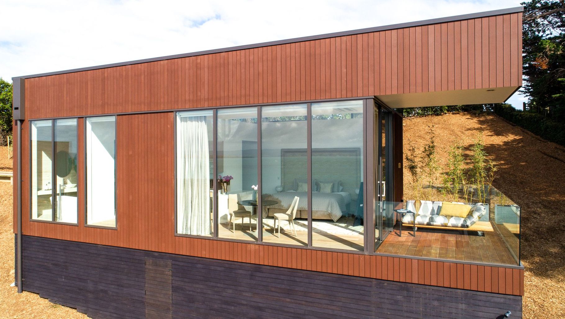 ArchiPro Project Summary - Omana Luxury Villa - Serenity features a golden-neutral colour palette, custom Molokai headboard by Sarsfield Brooke, and elegant furnishings including Lumilla side tables, Infinity table, and Akito outdoor sofa, creating a tranquil retreat on Waiheke Island.