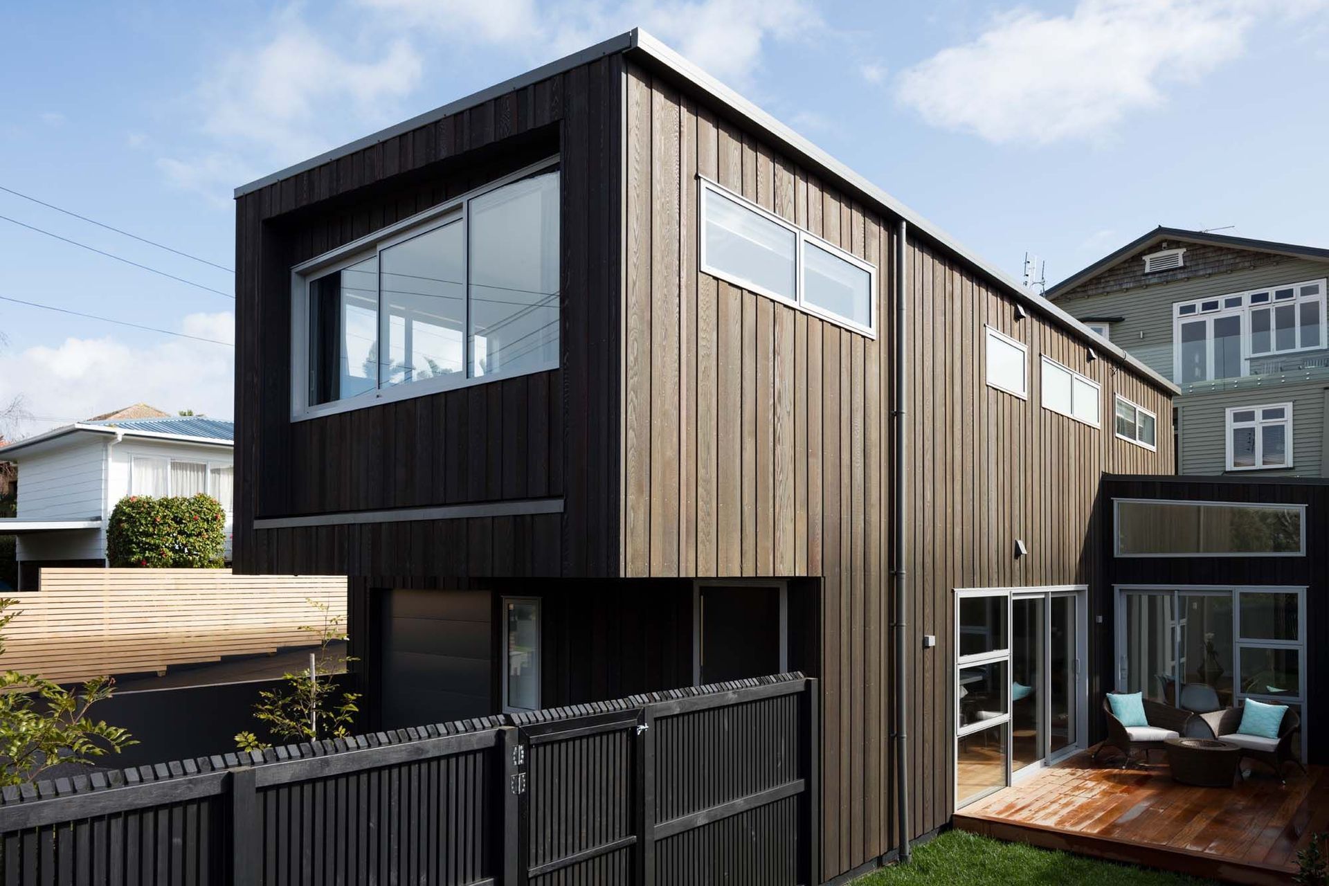 ArchiPro Project Summary - A stylish, modern cantilevered cedar-clad dwelling designed for a busy Auckland couple, maximizing a compact sloping site while addressing council requirements and ensuring privacy and views.