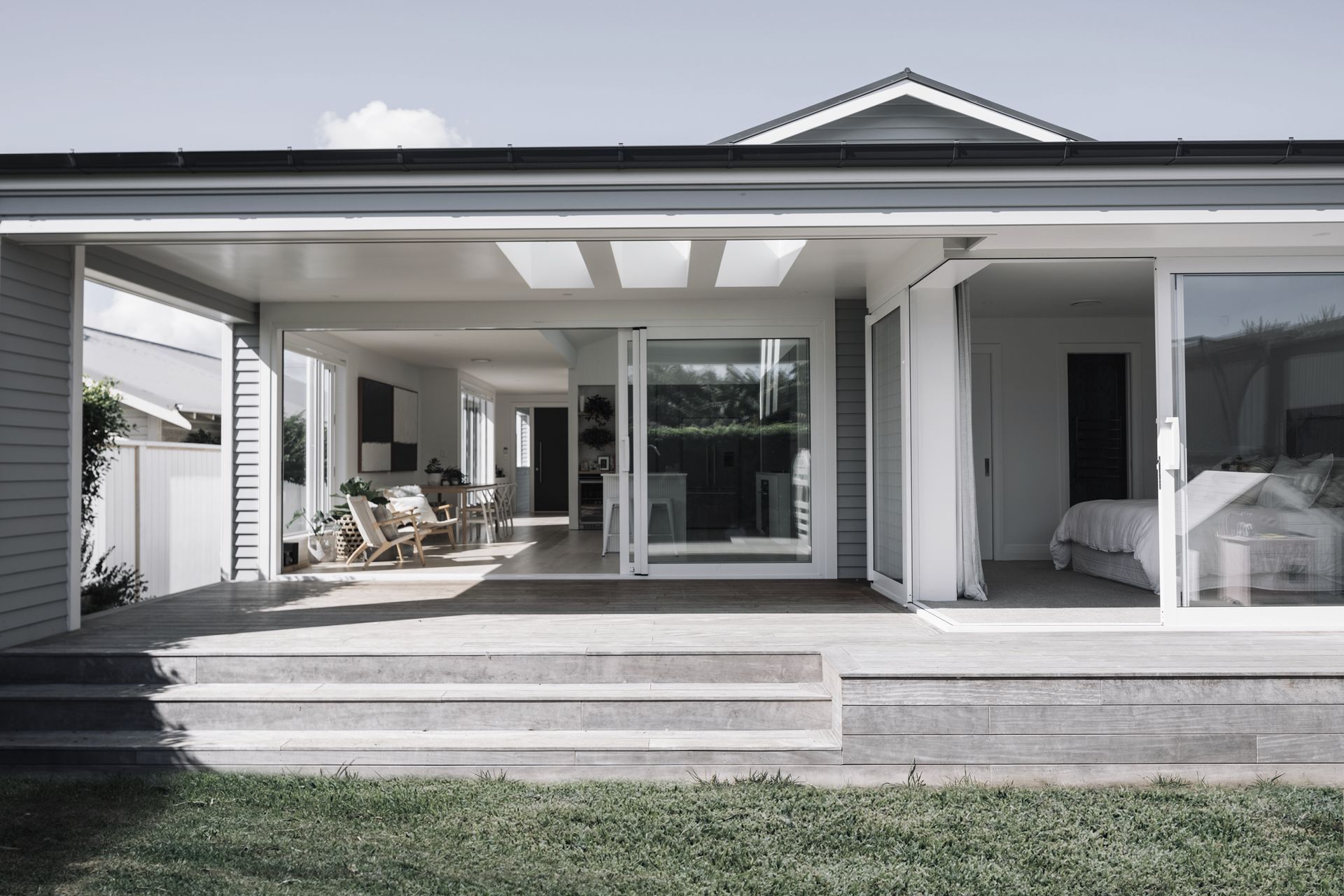 ArchiPro Project Summary - Renovation and extension of a family bungalow in Onehunga, featuring an elevated roofline, sun-filled interiors, a Poggenpohl kitchen, and seamless indoor-outdoor flow with a stunning hardwood deck.
