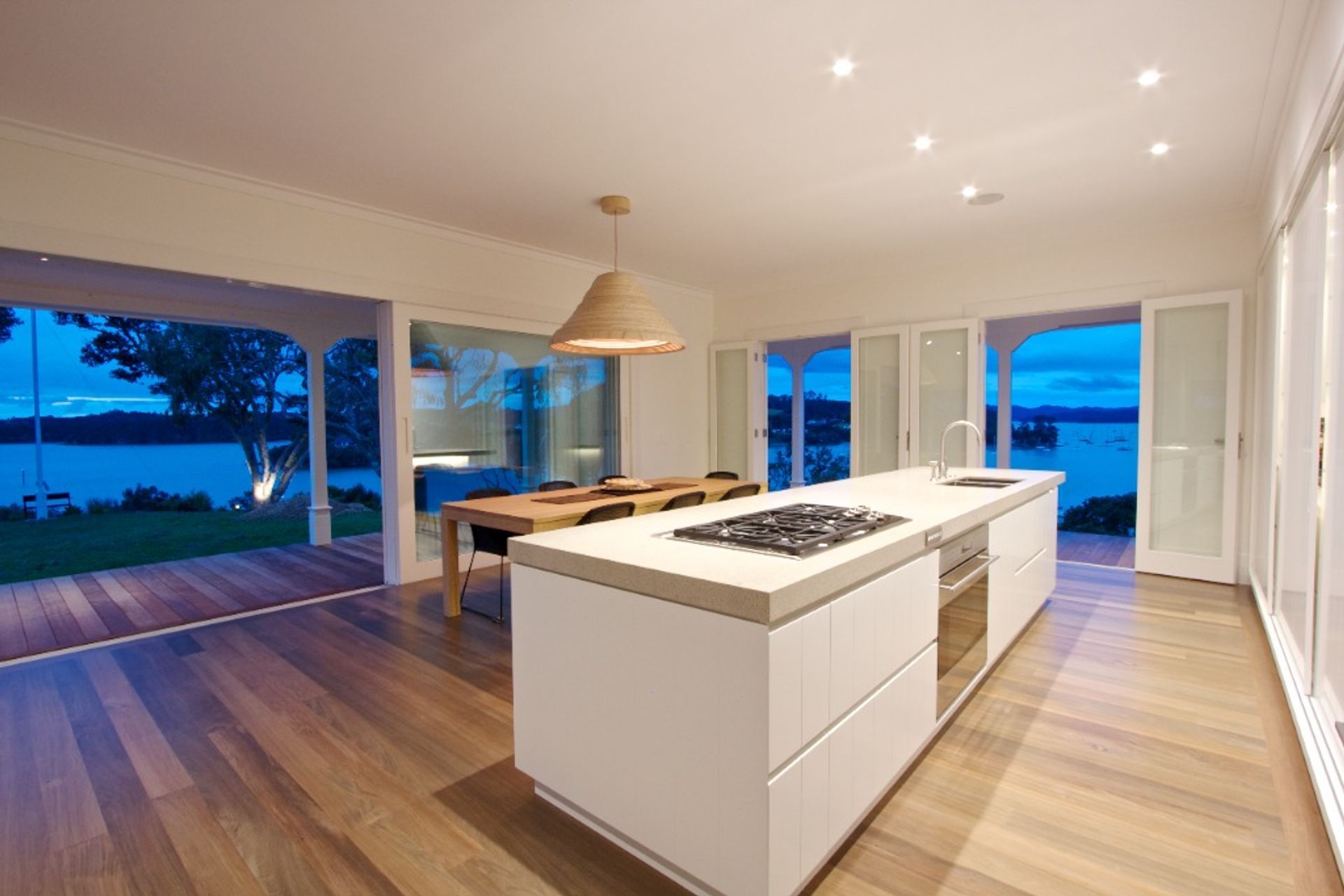 ArchiPro Project Summary - Opua House features stunning 180-degree views of the Bay of Islands, a contemporary interior within colonial architecture, and a seamlessly integrated kitchen that enhances the open-plan living space.