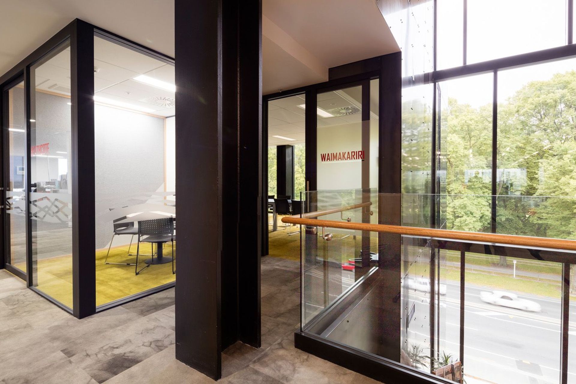 ArchiPro Project Summary - A sophisticated tree house design featuring two floating boxes with stunning views of Hagley Park, a feature spine wall for navigation, and a seamless connection between interior and exterior spaces.