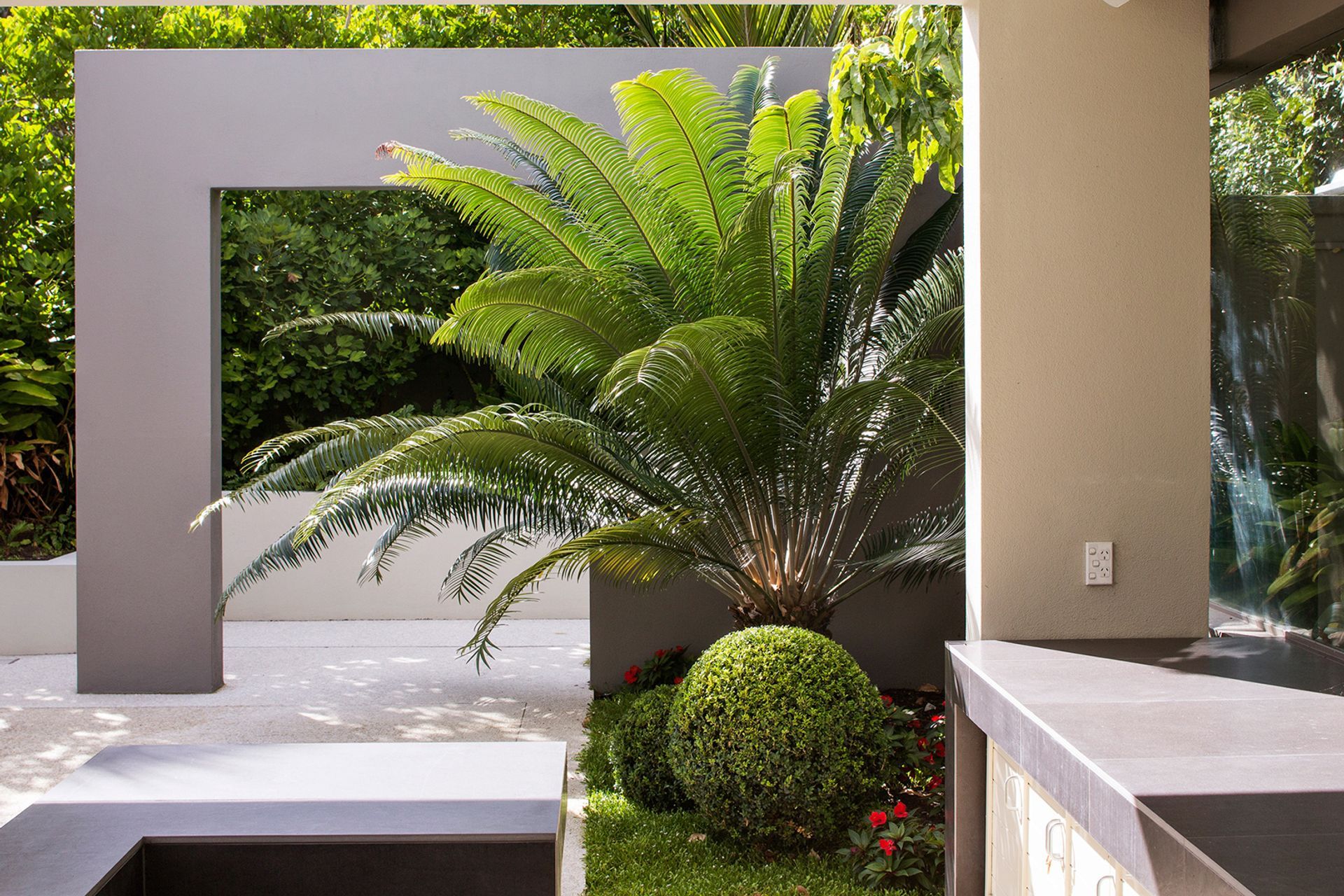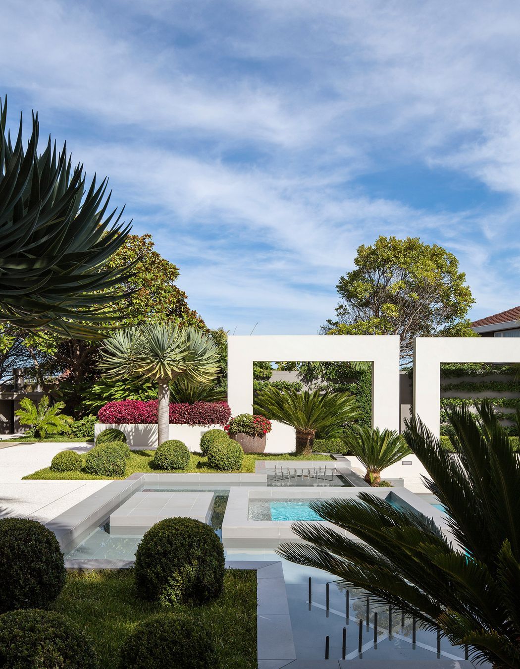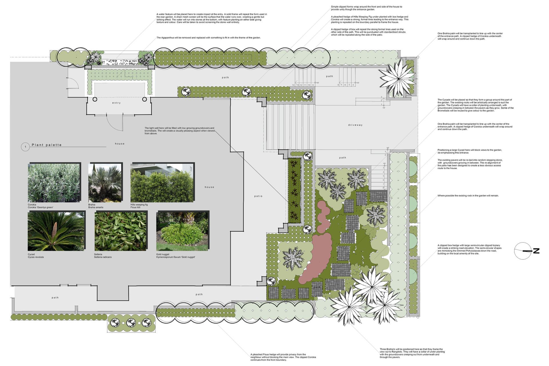 ArchiPro Project Summary - Comprehensive landscape renovation for Orakei House, featuring contemporary materials, a renovated pool, a new water feature at the entrance, and a cohesive planting theme that integrates existing large specimens.