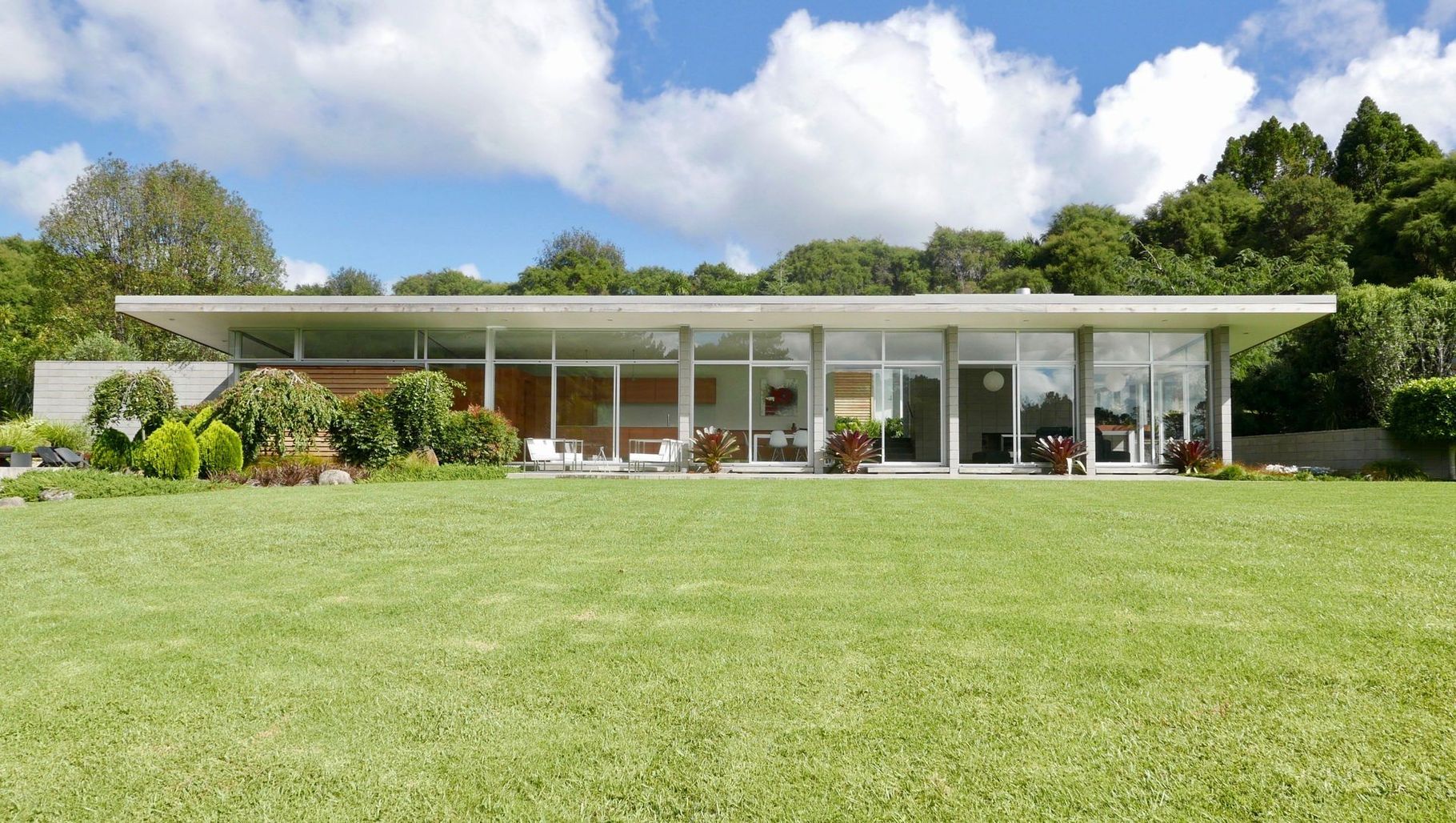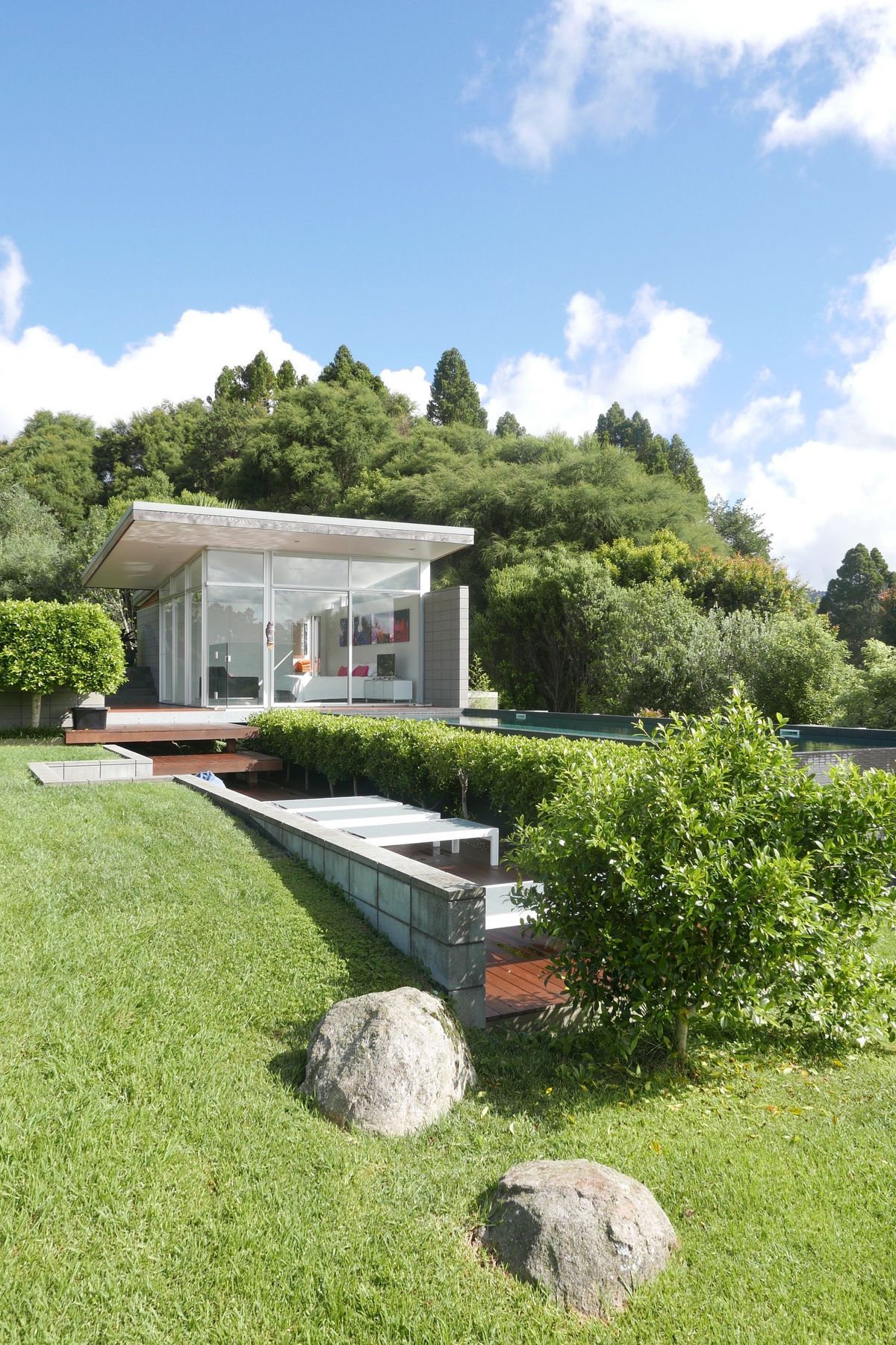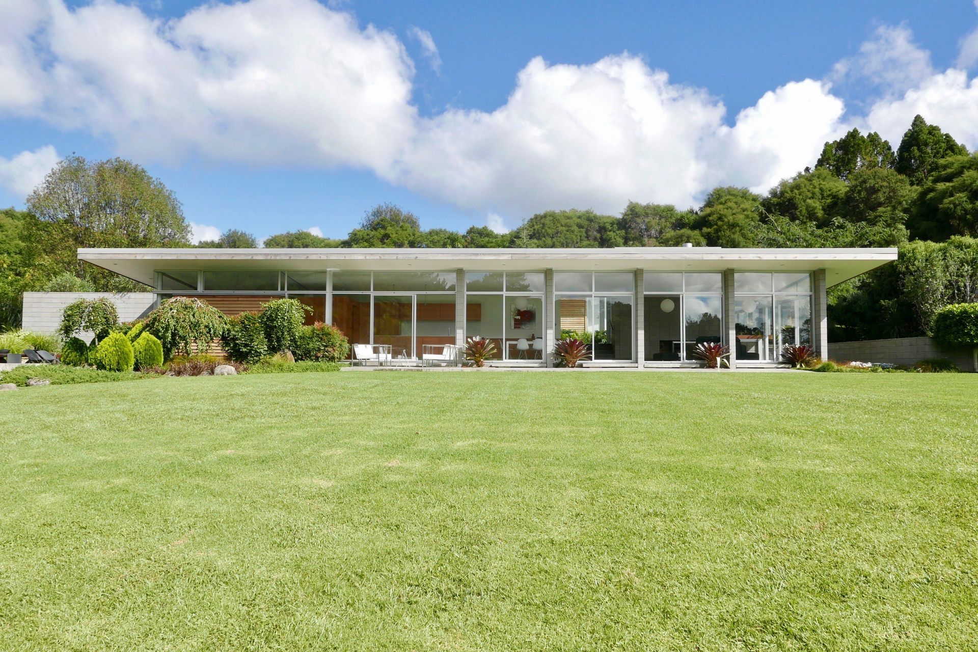 ArchiPro Project Summary - A commendable design nestled into the hillside of Oratia, featuring low horizontal forms, two distinct courtyards, and a harmonious blend of exposed concrete, cedar, and glass, inspired by mid-century desert architecture.