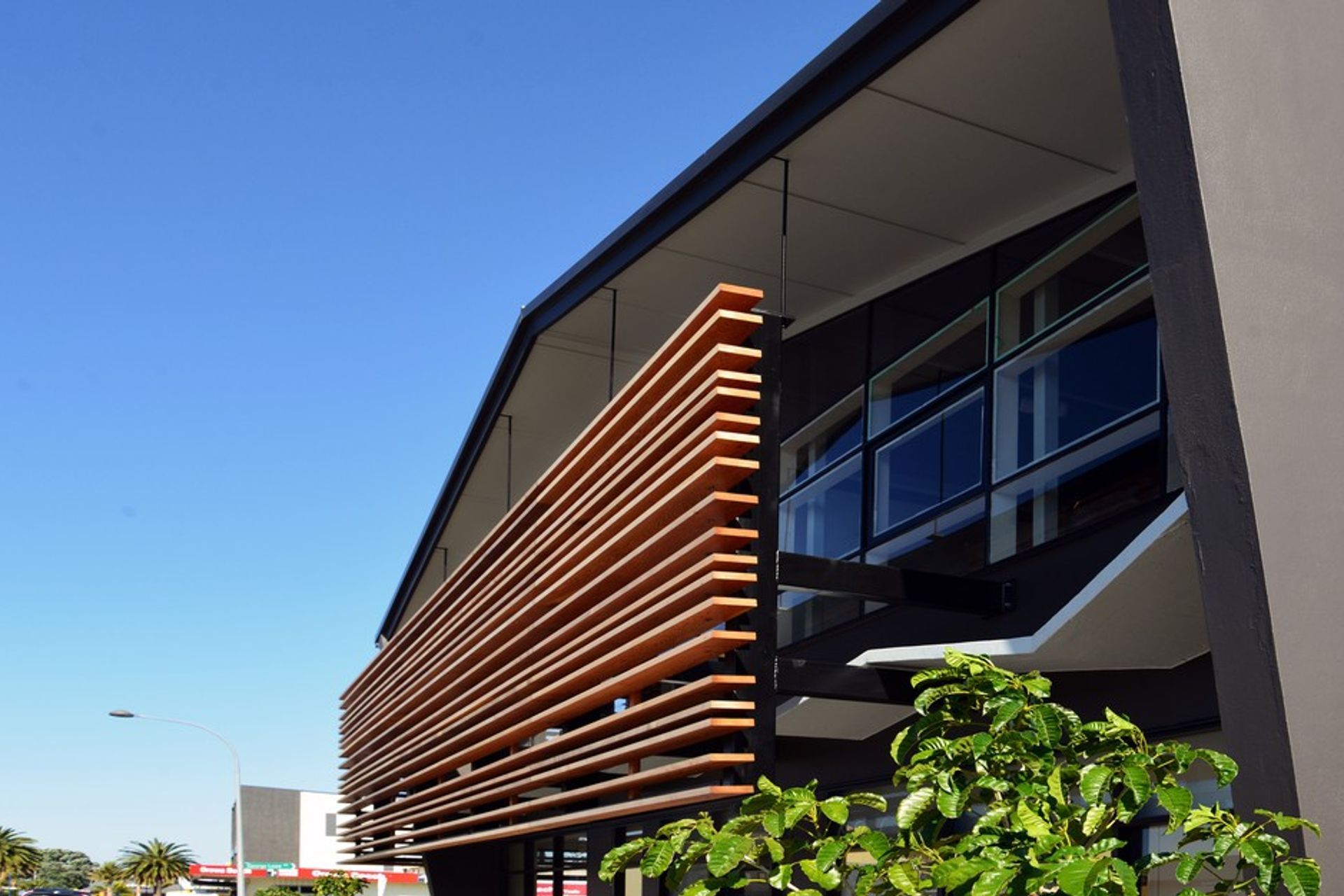 ArchiPro Project Summary - A revitalized 1950s office building in Orewa, redesigned by ICR Studios to attract long-term tenants with a modern and edgy aesthetic, successfully securing a new tenant within days of completion.