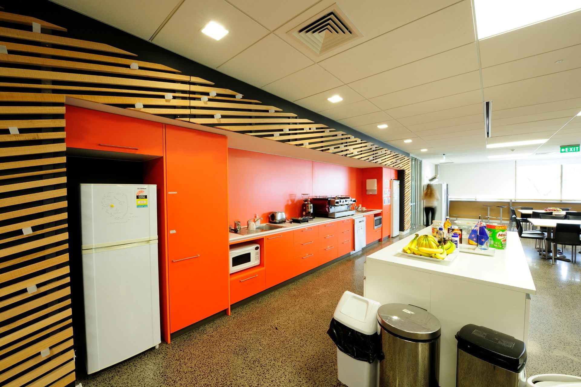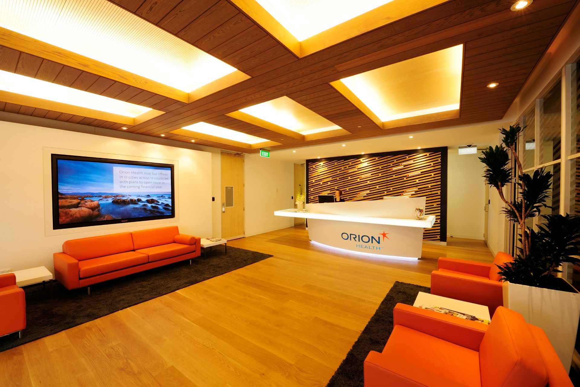 ArchiPro Project Summary - Complete fit out of Orion Healthcare's new premises in Grafton, Auckland, featuring a prominent reception area, offices, meeting rooms, communal work areas, staff kitchen and dining area, and a public café, all with custom joinery by Canam Joinery.