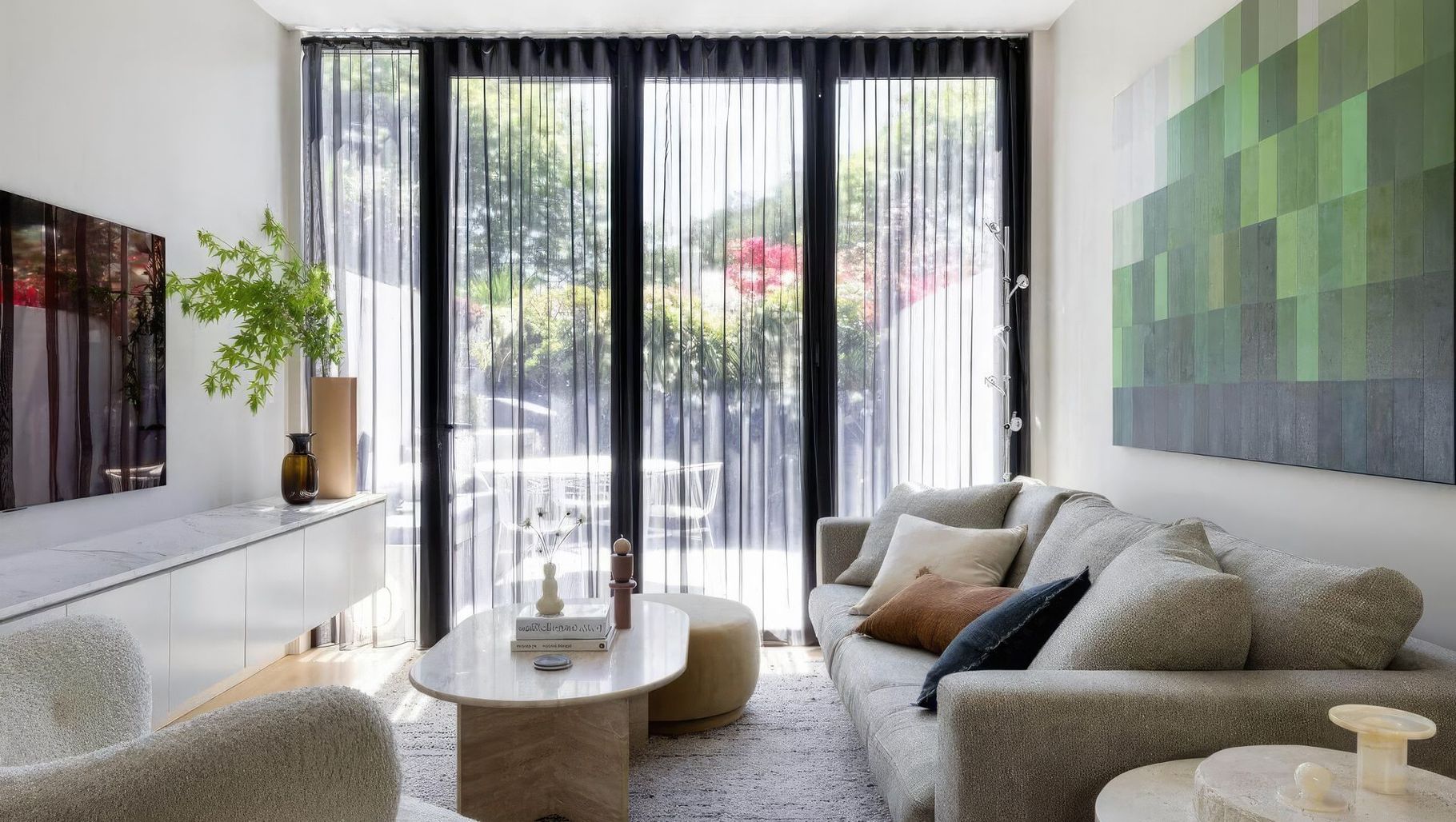 ArchiPro Project Summary - A beautifully furnished Paddington terrace home featuring a neutral base palette enhanced by vibrant accents, warm linens, and striking artwork, designed for optimal usability in a compact space.