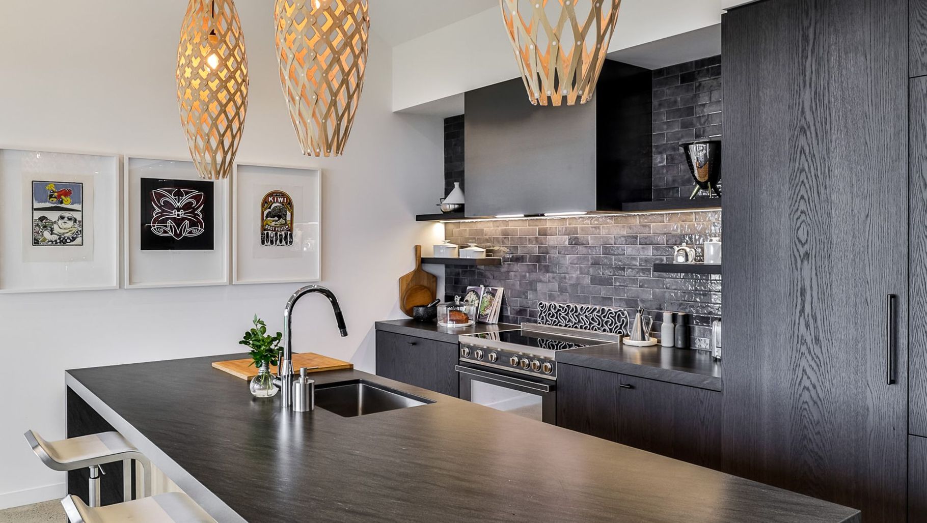 ArchiPro Project Summary - A modern kitchen masterpiece featuring natural benchtops and dark washed oak cabinetry, seamlessly integrating appliances for a cohesive look, completed in 2022 and designed by Robyn Labb, overlooking the stunning Pakiri Beach.