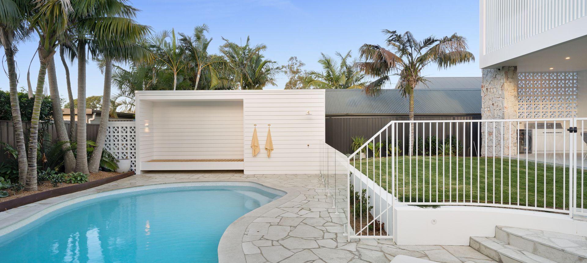 ArchiPro Project Summary - A harmonious blend of Palm Springs and modern Mediterranean design, featuring an outdoor alfresco dining area, a swimming pool, and natural elements that create a serene coastal backyard at the Palms of Taronga, completed in 2023.