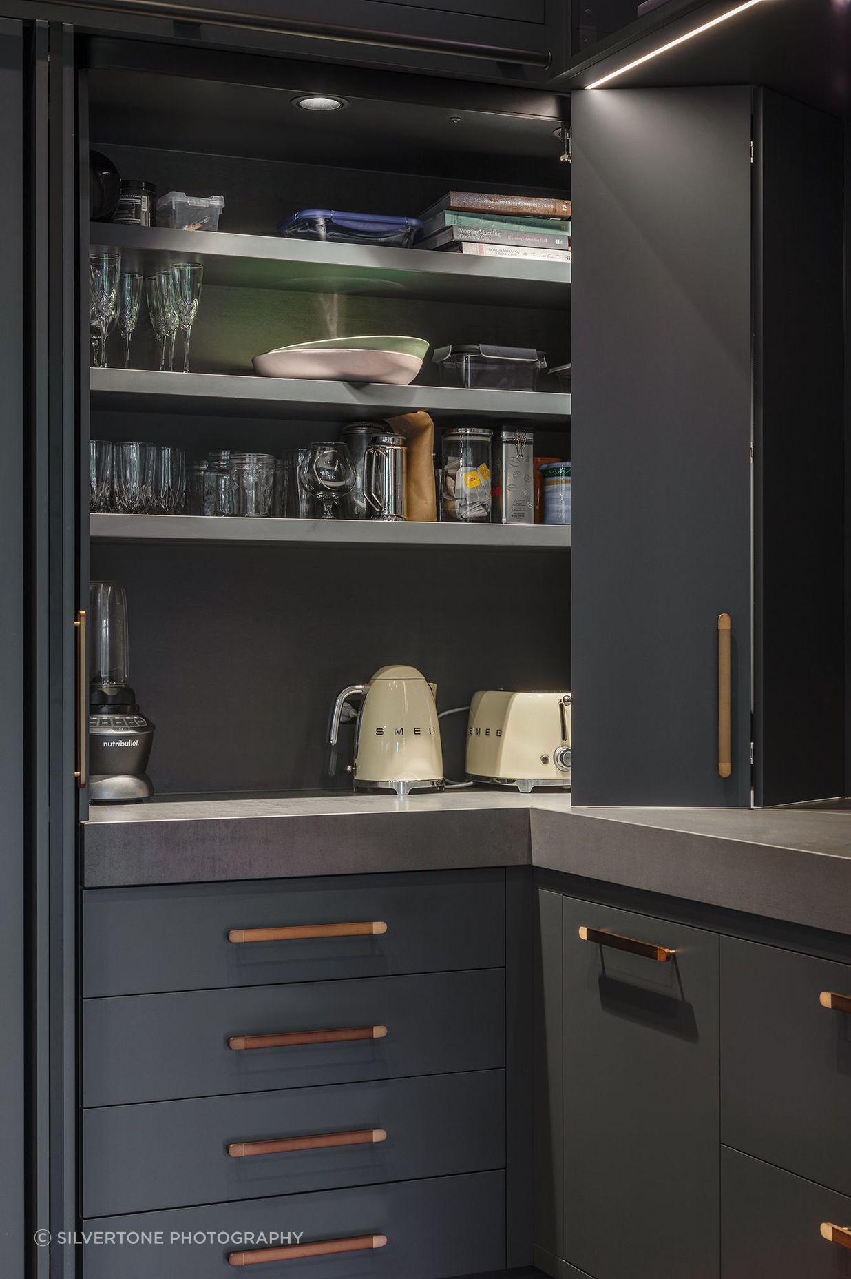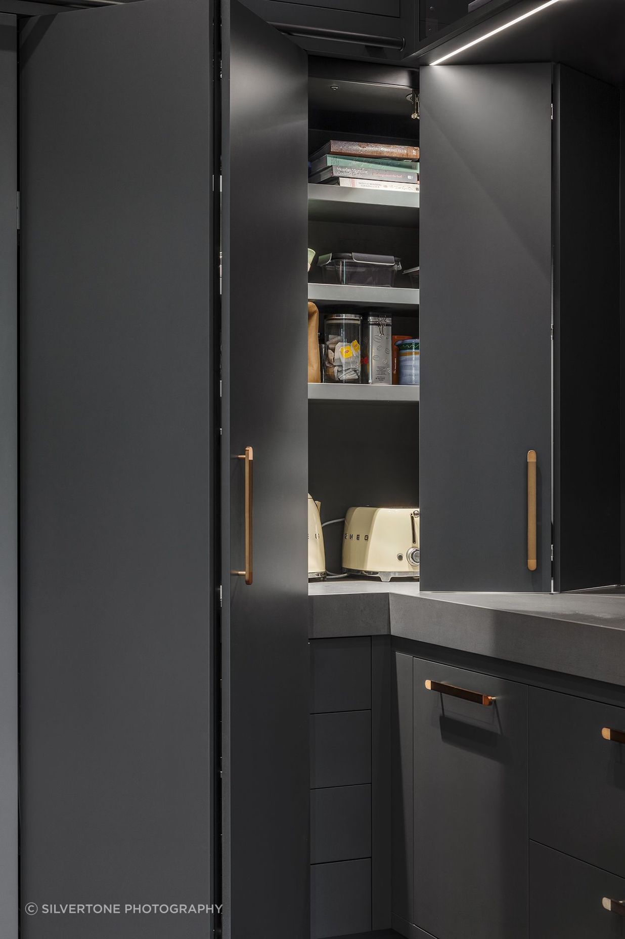 ArchiPro Project Summary - A transformed kitchen space featuring an inviting large island, industrial dark color palette, and elegant bronze accents, seamlessly blending modern design with functional storage and entertaining areas.