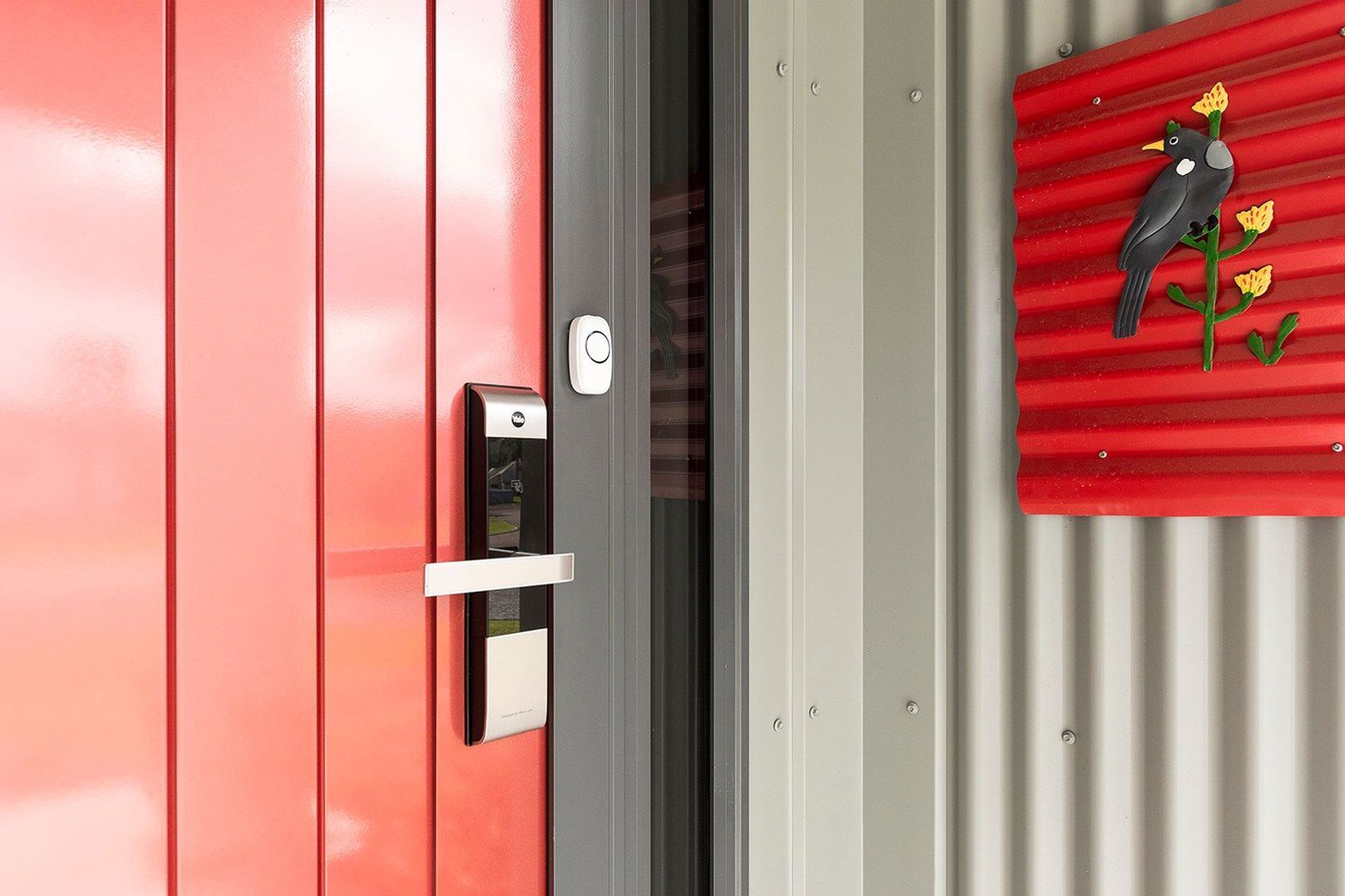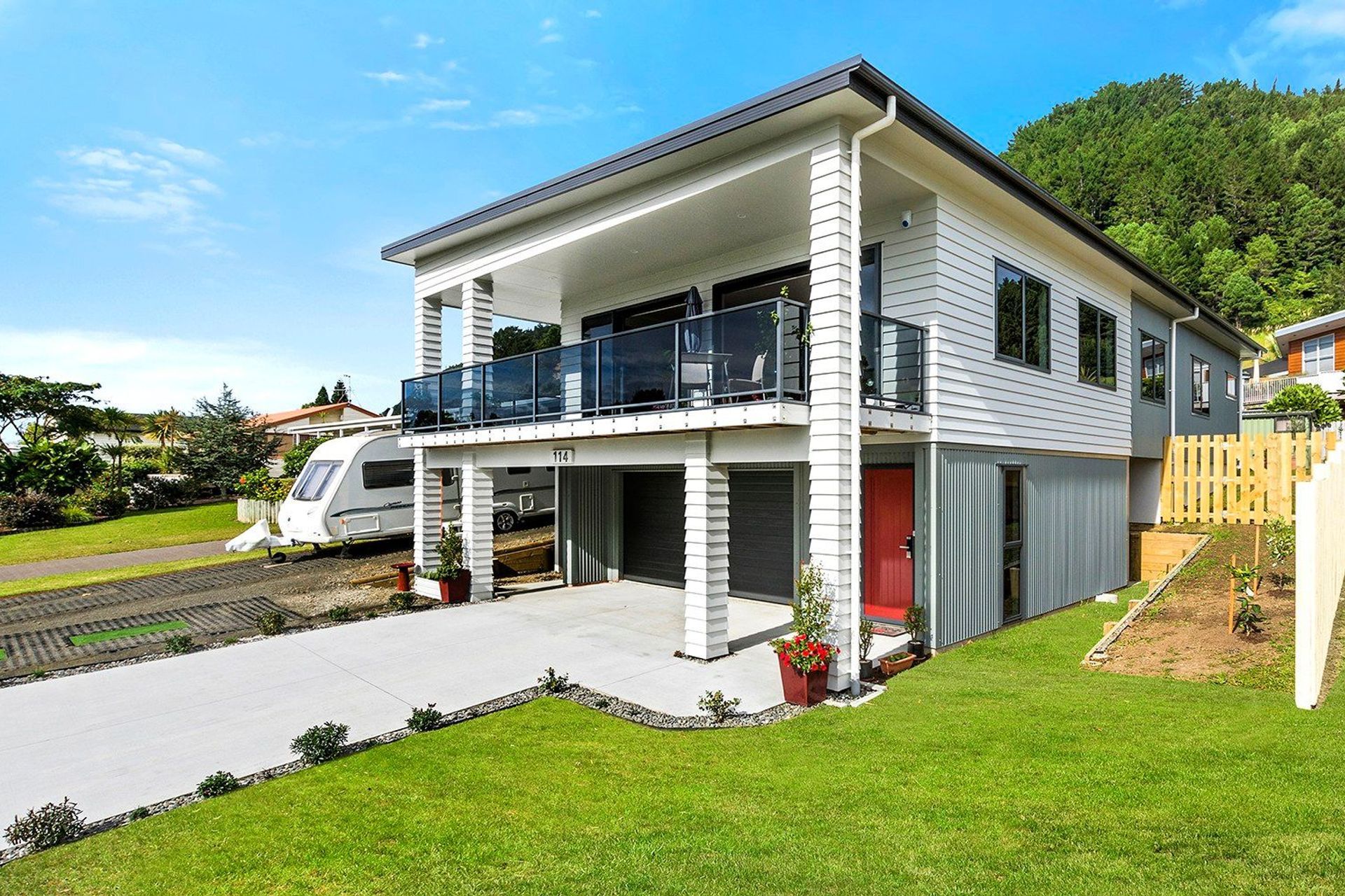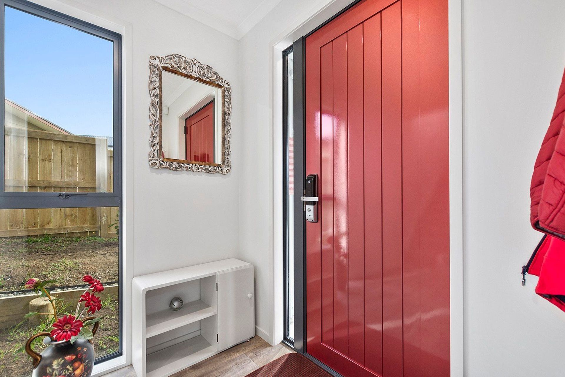 ArchiPro Project Summary - Light-filled two-storey residence featuring three bedrooms, two bathrooms, and seamless indoor-outdoor flow, complemented by a bright red front door and ample glazing for natural light.