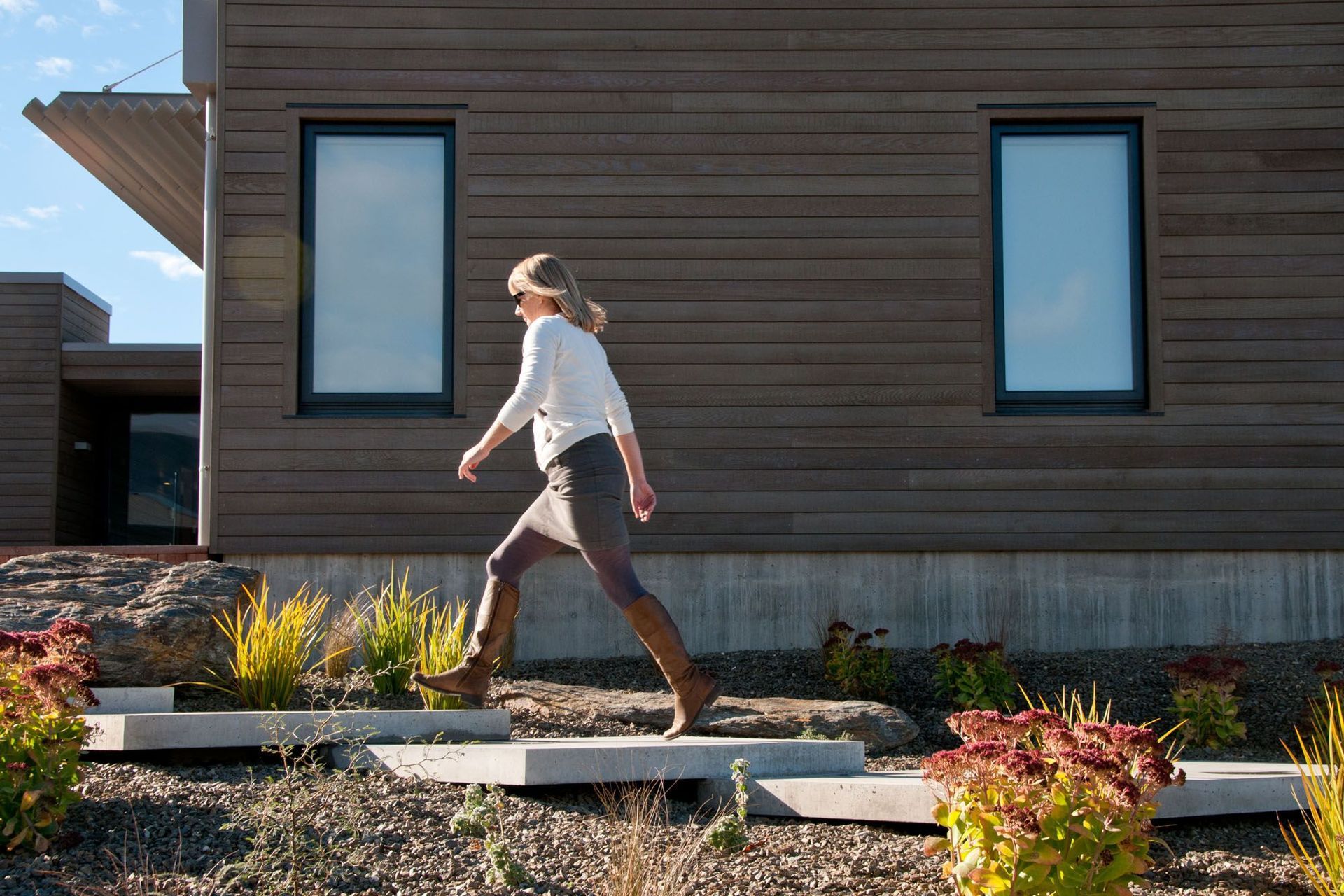 ArchiPro Project Summary - Innovative residential design featuring a multi-level landscape with a board-formed concrete retaining wall, large floating steps, and a dry tolerant garden, enhancing accessibility and aesthetic appeal.