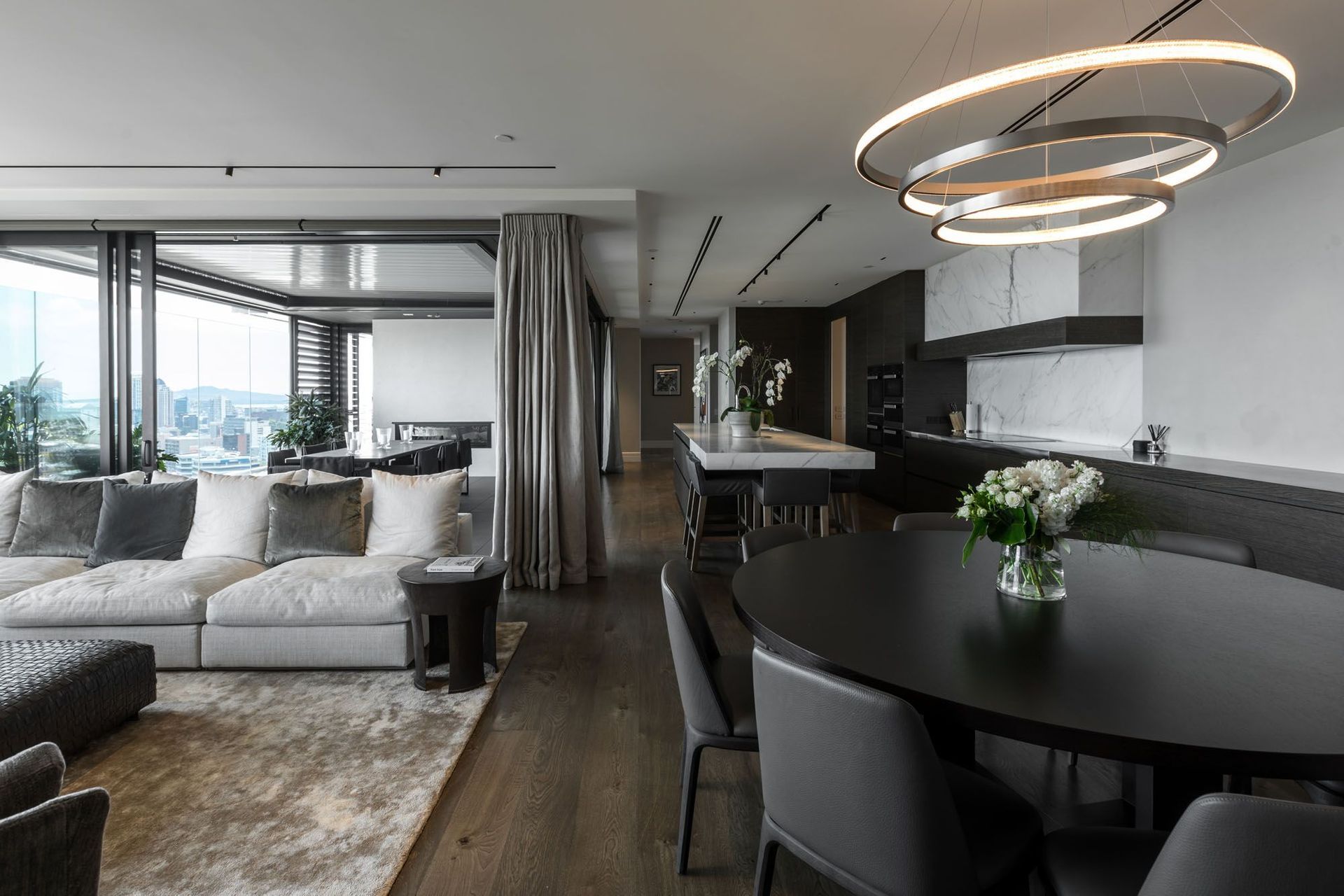 ArchiPro Project Summary - A luxurious penthouse apartment featuring modern design elements, wood flooring, and a stylish kitchen and dining area.