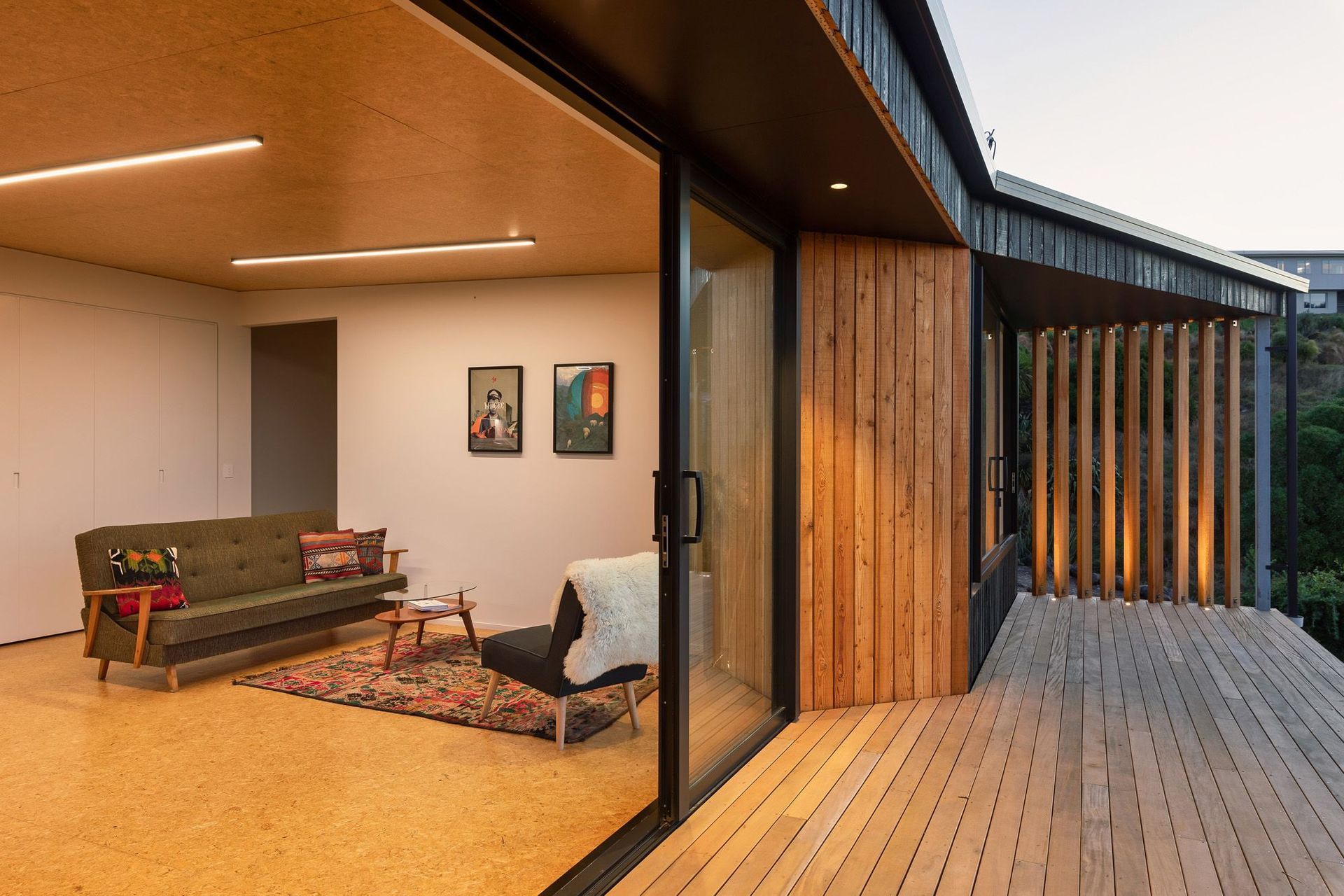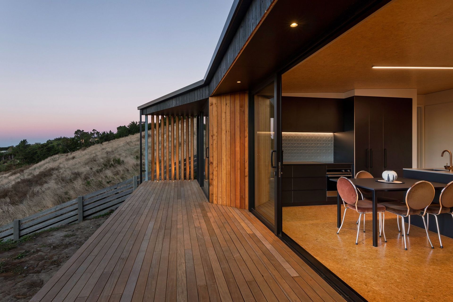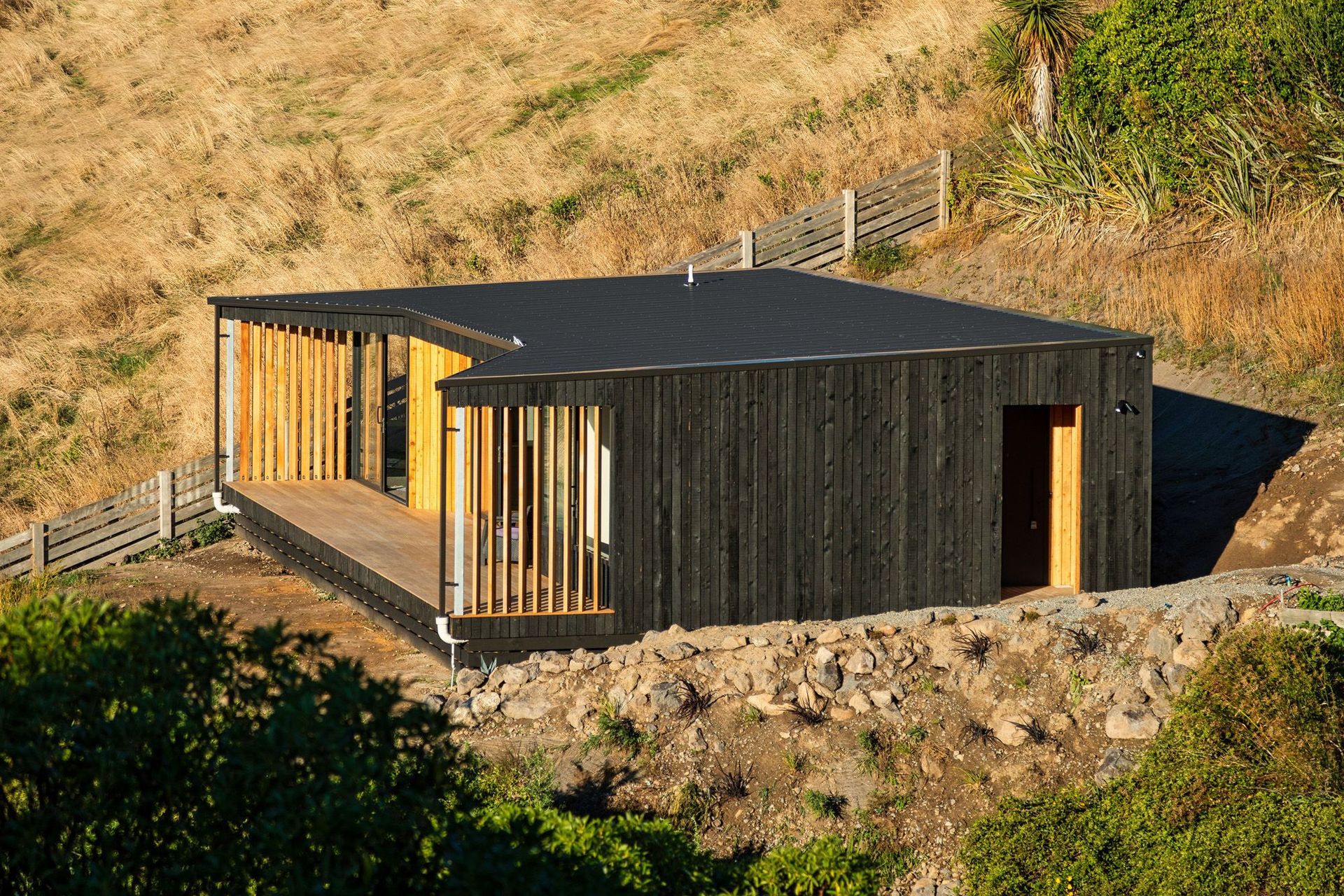 ArchiPro Project Summary - A thoughtfully designed 80m2 home that maximizes space and comfort, featuring a rectangular form with carved niches for privacy and shelter, clad in a blend of burnt and natural Larch timber, and oriented to showcase the stunning Kaikoura ranges.