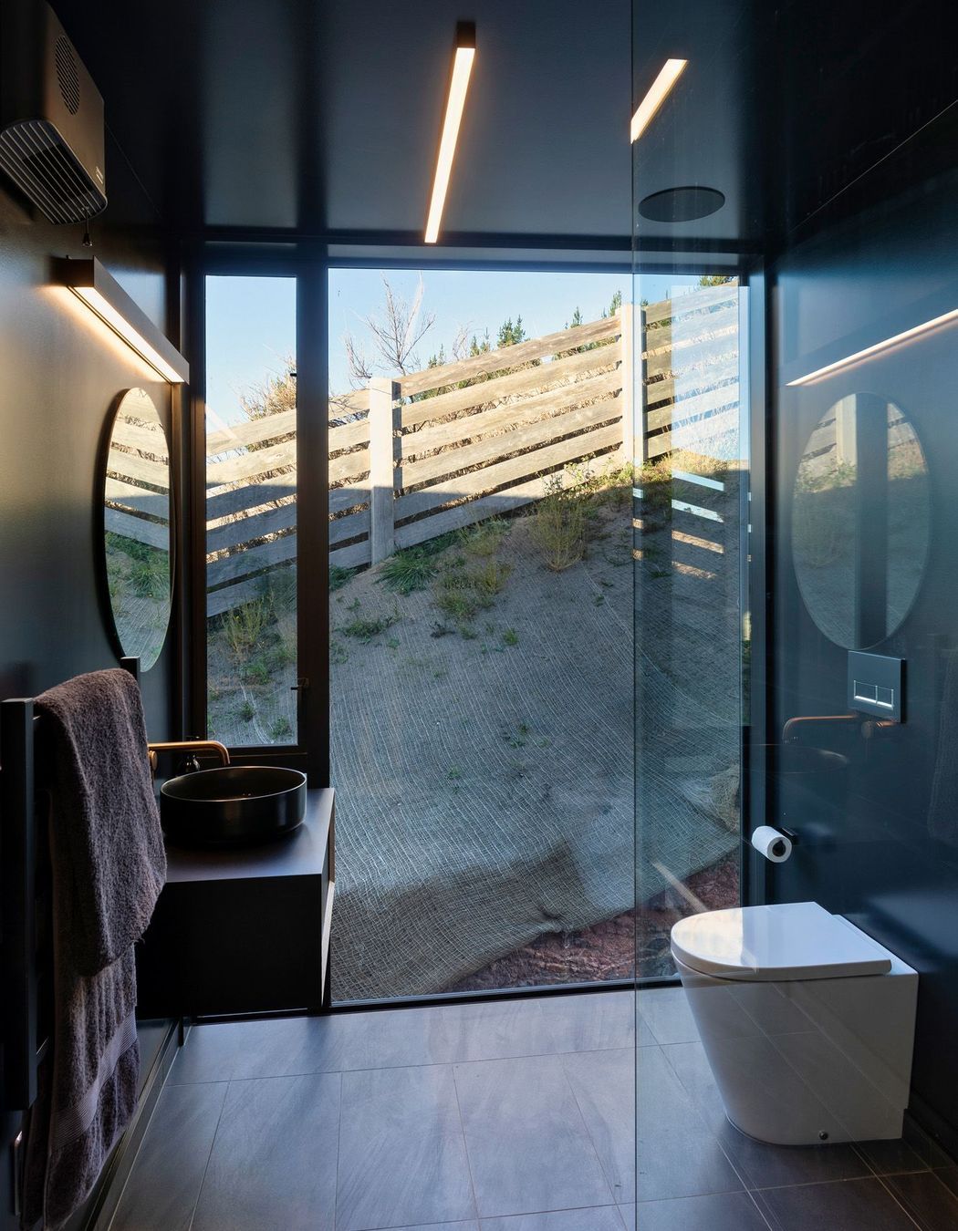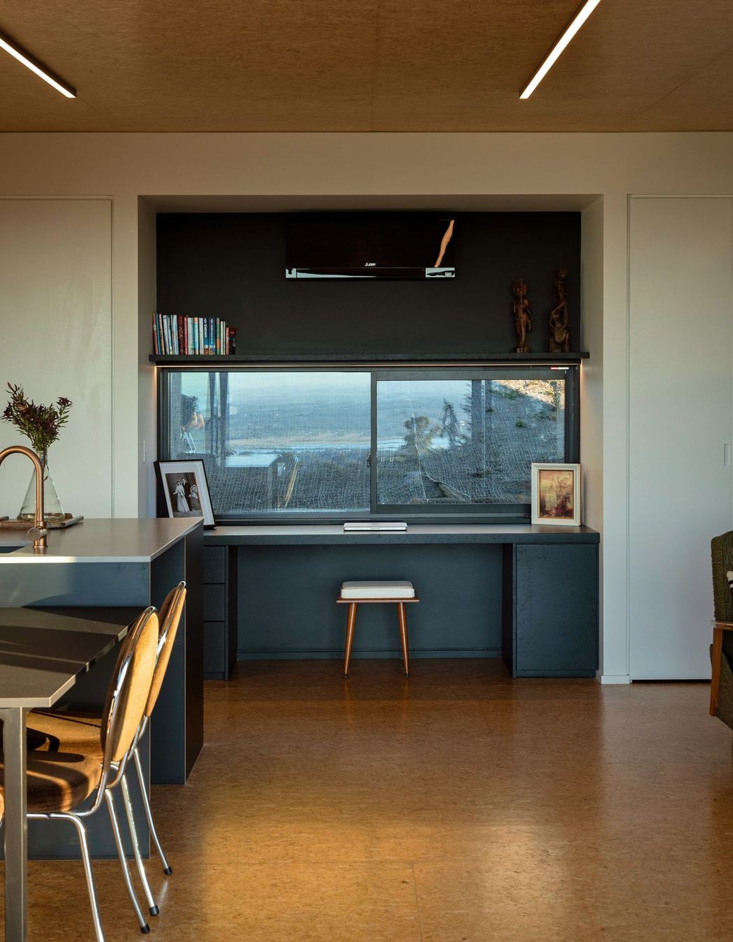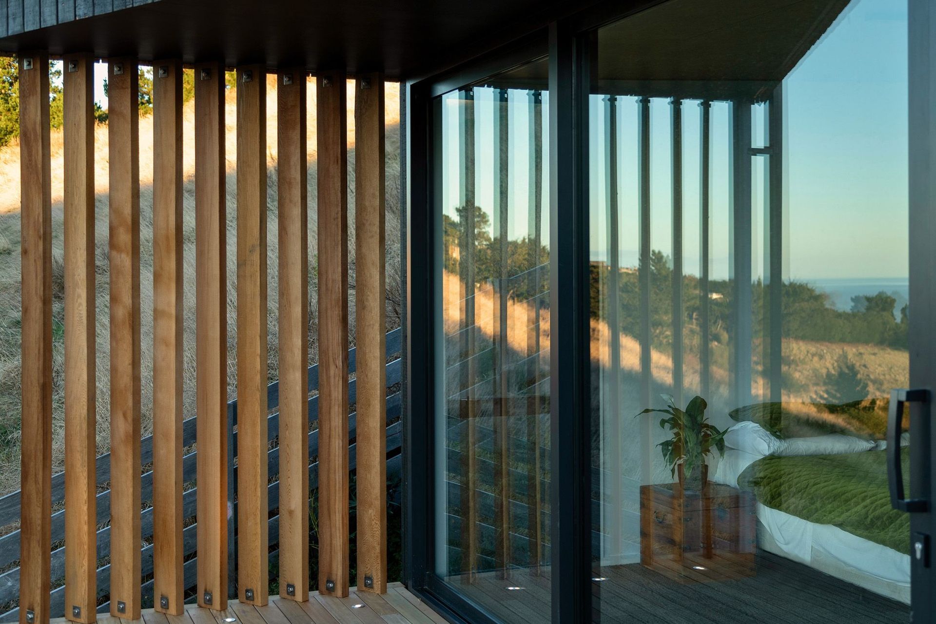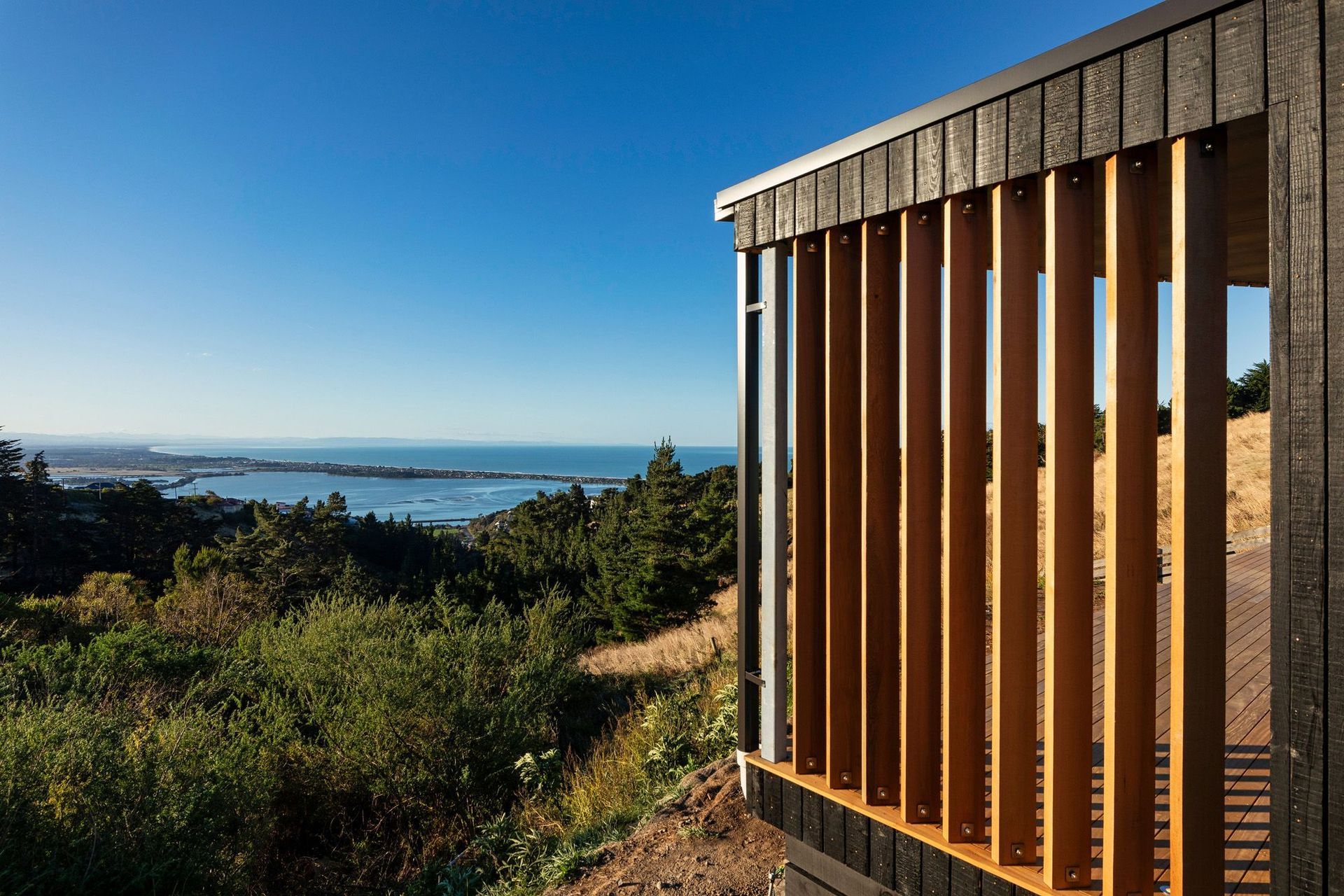ArchiPro Project Summary - A thoughtfully designed 80m2 home that maximizes space and comfort, featuring a rectangular form with carved niches for privacy and shelter, clad in a blend of burnt and natural Larch timber, and oriented to showcase the stunning Kaikoura ranges.