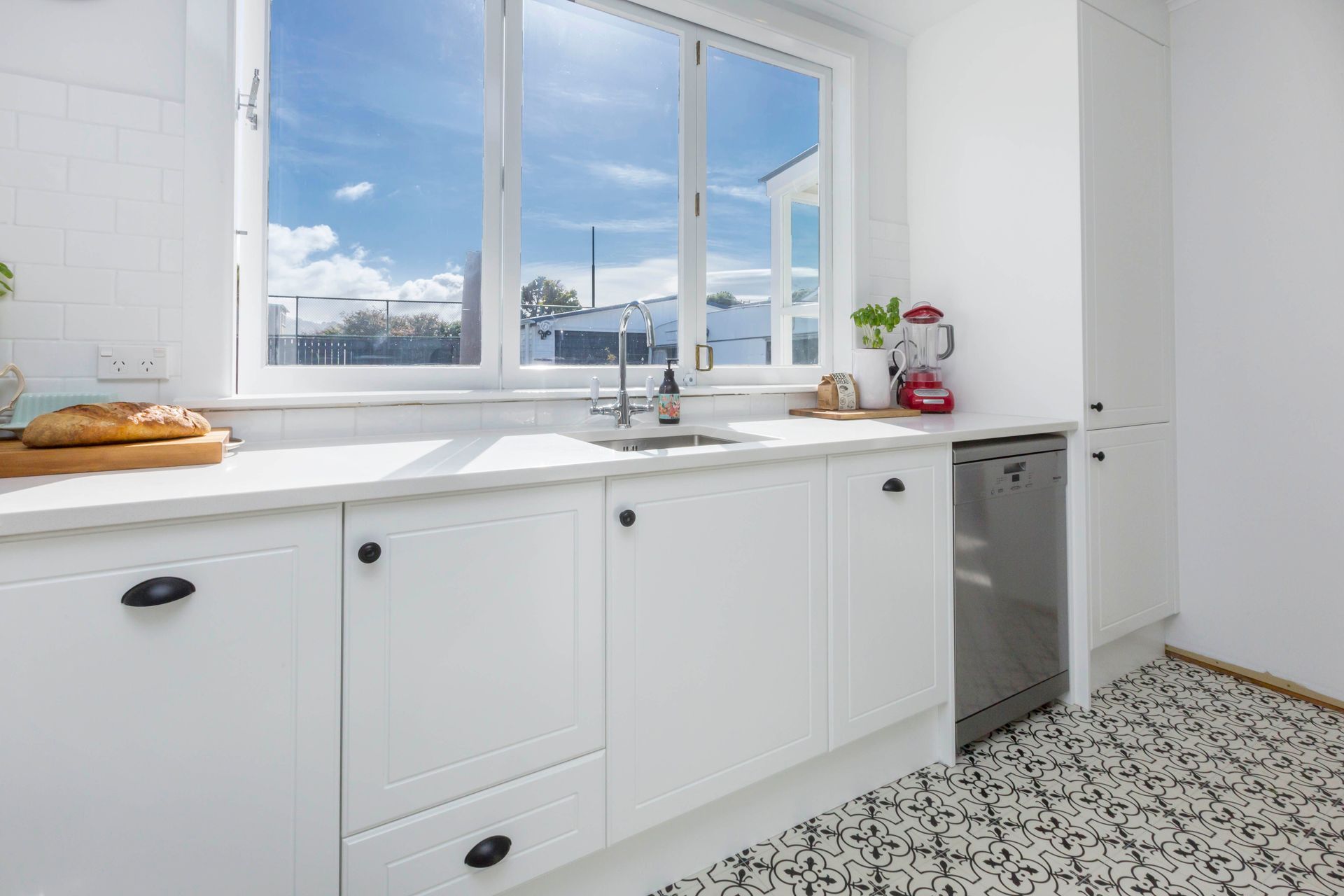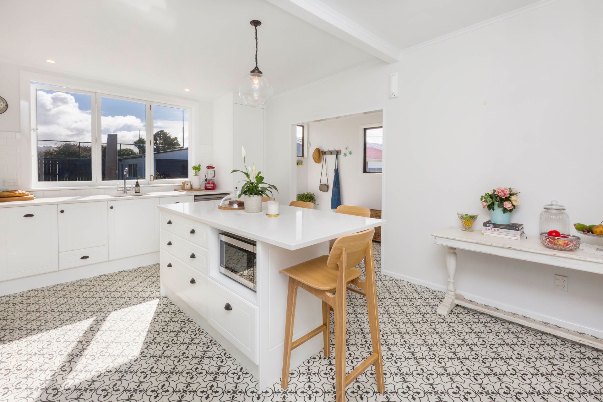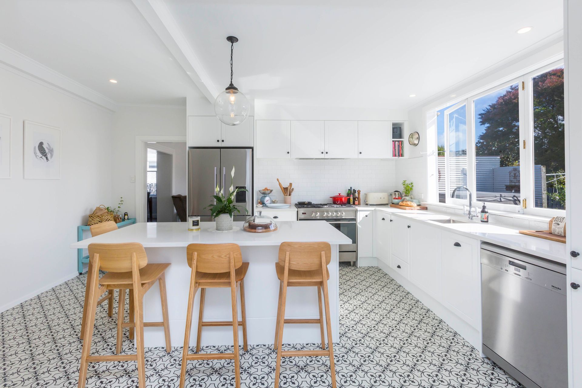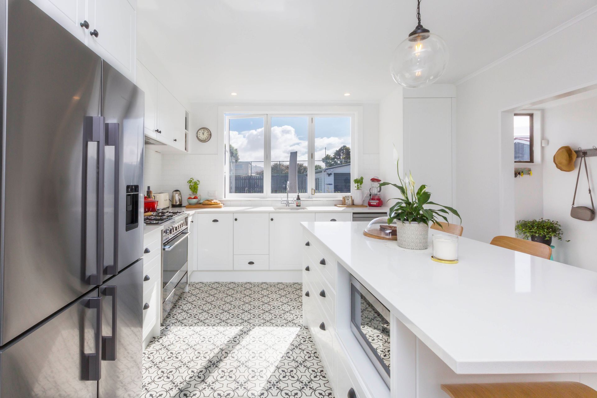 ArchiPro Project Summary - A vibrant kitchen featuring lacquer finished doors and black handles, harmoniously complemented by stunning flooring, creating a warm and inviting atmosphere in the heart of the Petone home.