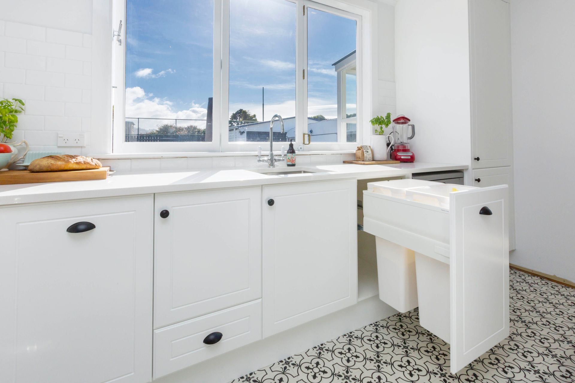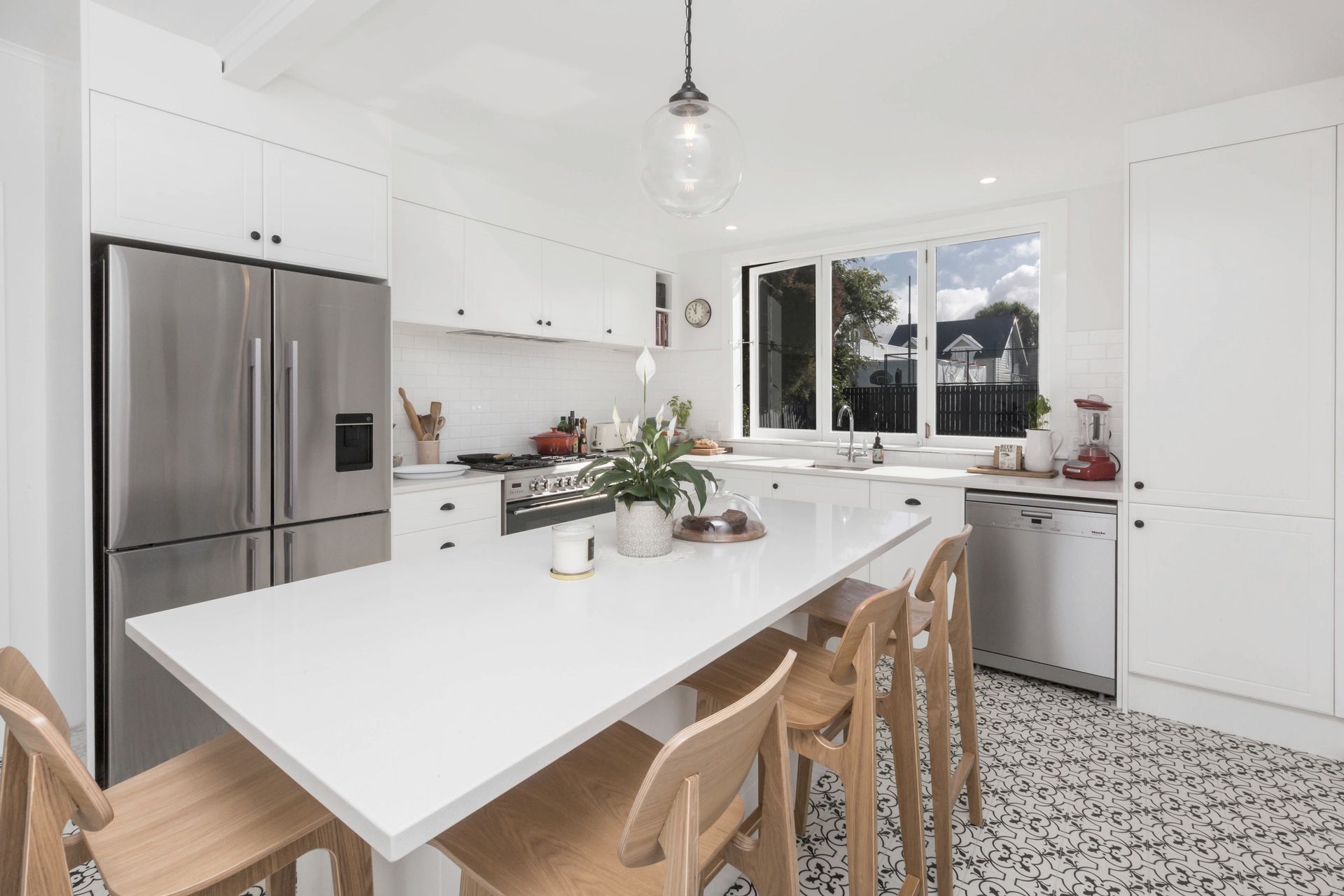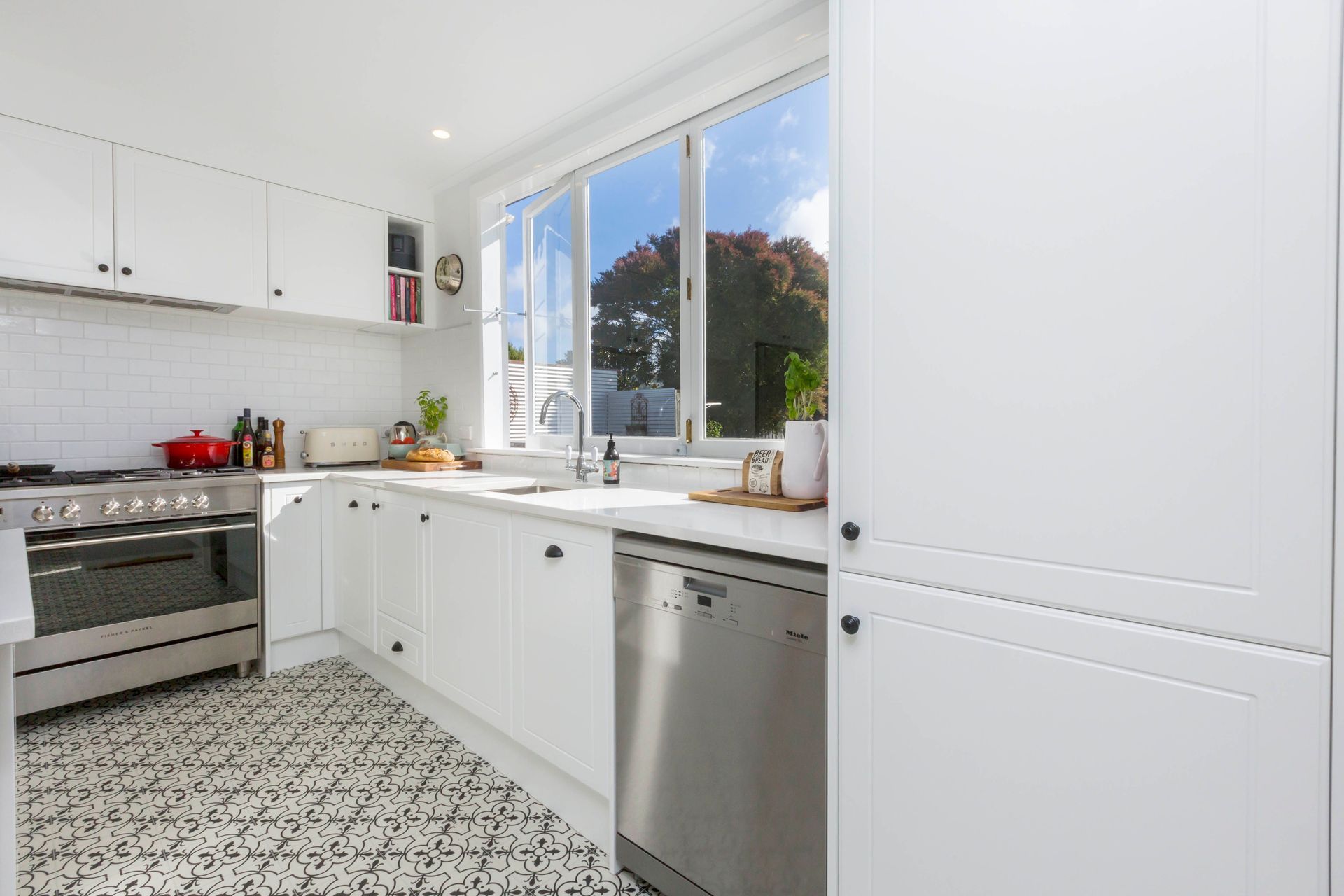 ArchiPro Project Summary - A vibrant kitchen featuring lacquer finished doors and black handles, harmoniously complemented by stunning flooring, creating a warm and inviting atmosphere in the heart of the Petone home.